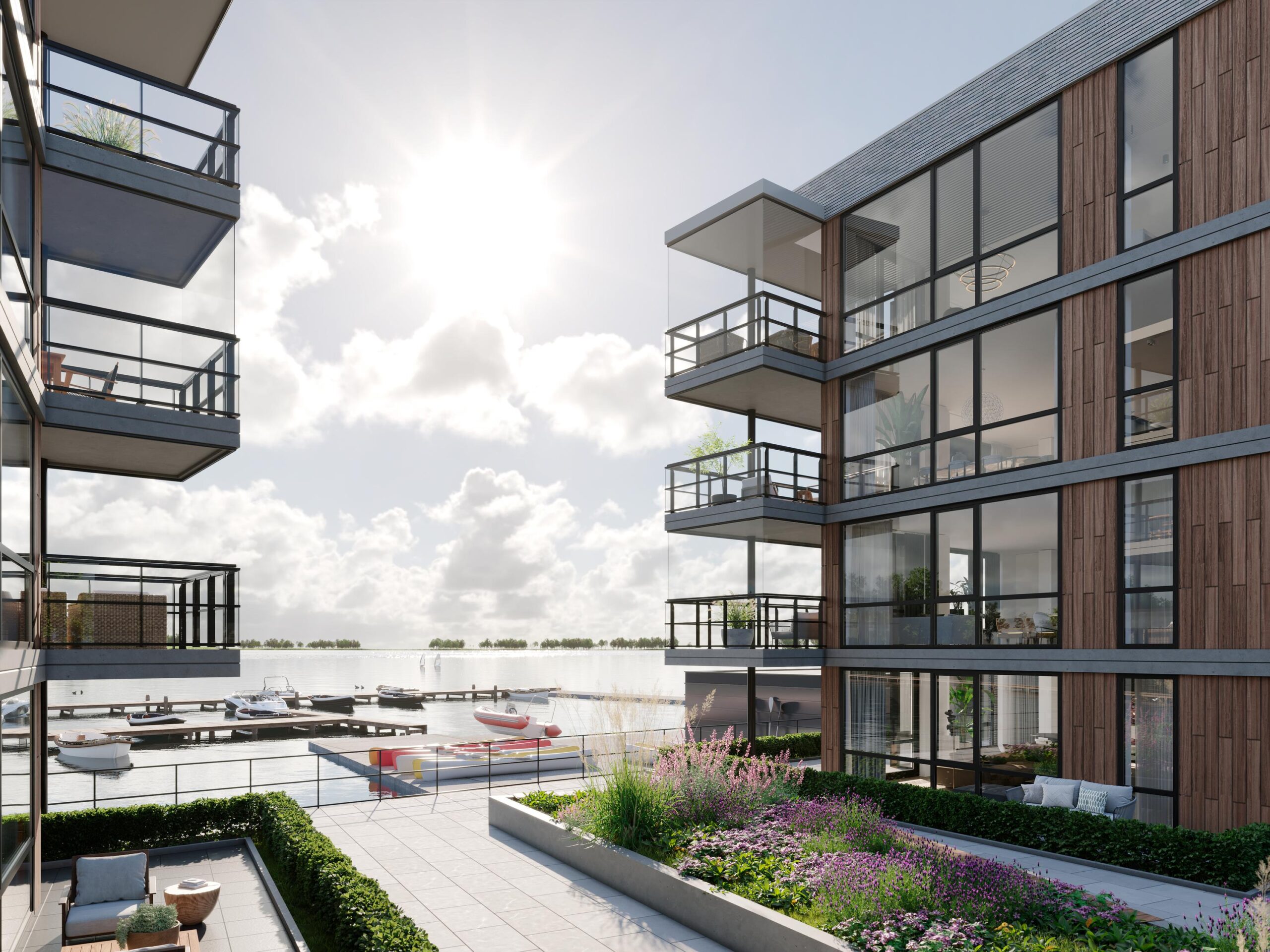 De bovenste appartementen in woonblok E hebben zelfs dakterrassen waar u geniet van een vrij uitzicht over het uitgestrekte meer. U heeft de keuze uit royale 2, 3 en 4-kamer appartementen. Bij dit woonproject is duurzaamheid een belangrijk uitgangspunt. Zo worden de woningen volledig gasloos en krijgt elke woning een eigen individuele (aard)warmtepomp. Hierdoor profiteert u van zeer lage energielasten.