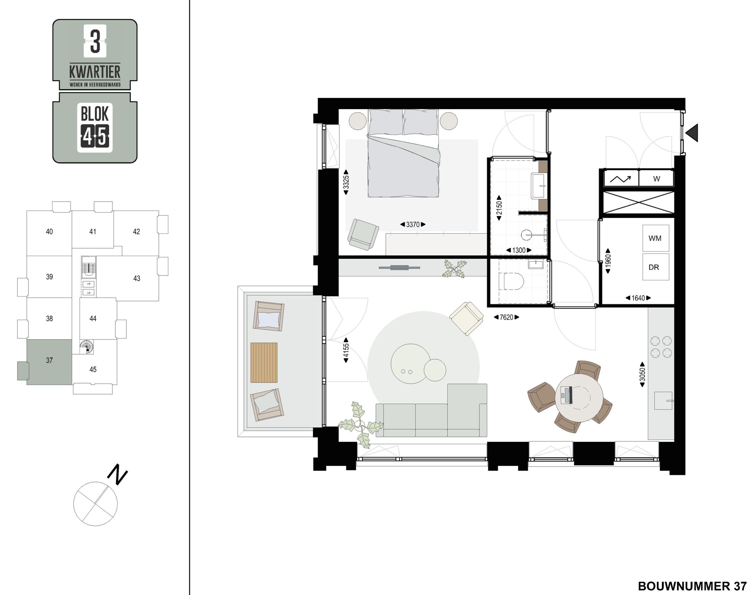 Bouwnummer 37 is een prachtig 3-kamer hoekappartement en gelegen op de 6e verdieping in BLOK45 met zicht op de rijk beplante binnentuin. Het appartement met een woonoppervlakte van 58,5 m2 heeft 2 slaapkamers. De buitenruimte van 5 m2 op het zuidoosten (bij bouwnummer 1, 10, 19 en 28) en op het zuidwesten (bij bouwnummer 37, 46 en 52) is via de ruime living te bereiken. De living geeft een licht en ruimtelijk gevoel door de vele raampartijen.