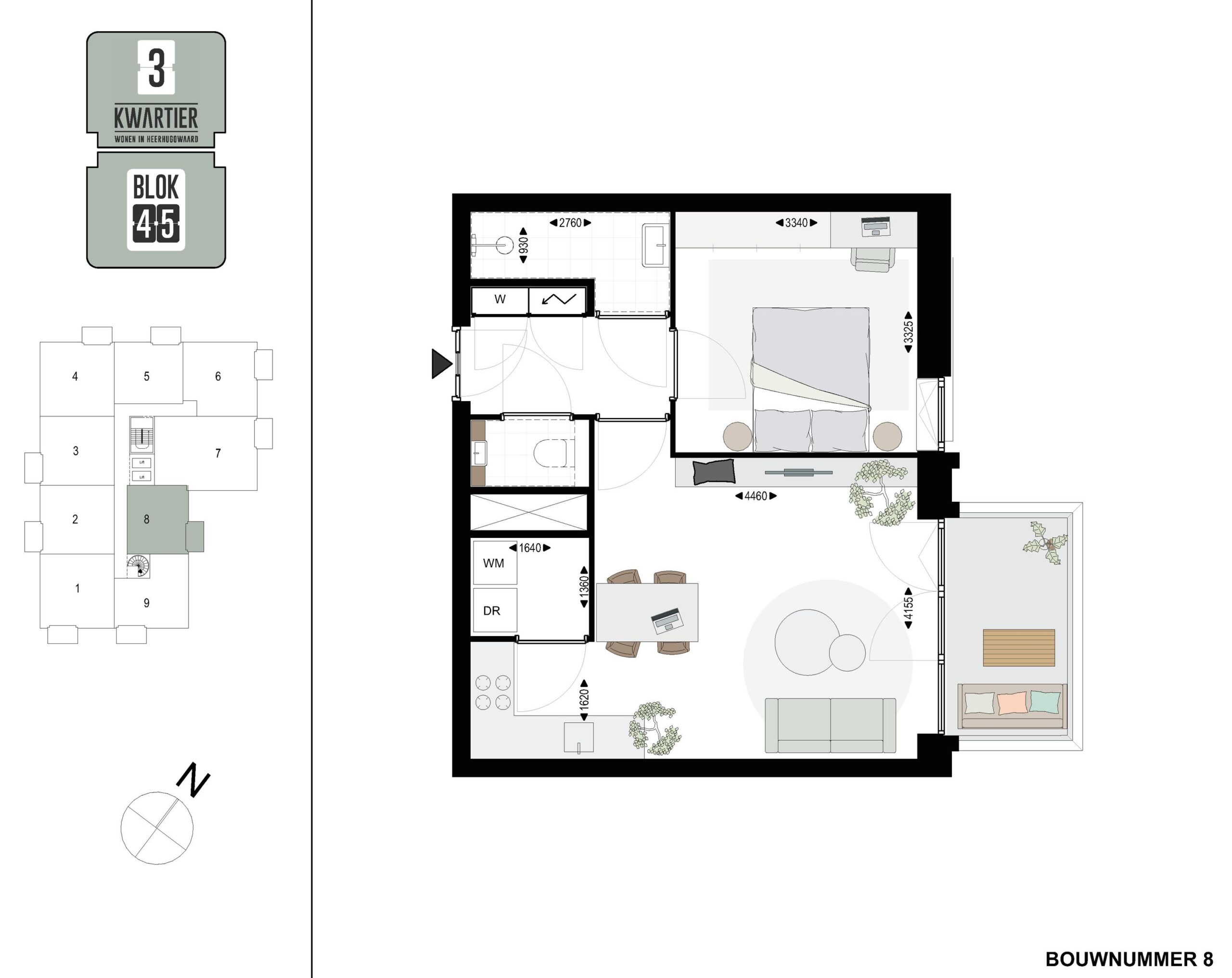 Bouwnummer 8 is een tussen appartement en gelegen op de tweede verdieping in BLOK45 met zicht op de rijk beplante binnentuin. Het appartement met een woonoppervlakte van 47,4 m2 heeft 1 slaapkamer. De buitenruimte van 5 m2 op het noordoosten is via de ruime living te bereiken. Op de begane grond is een gemeenschappelijke fietsenberging aanwezig.