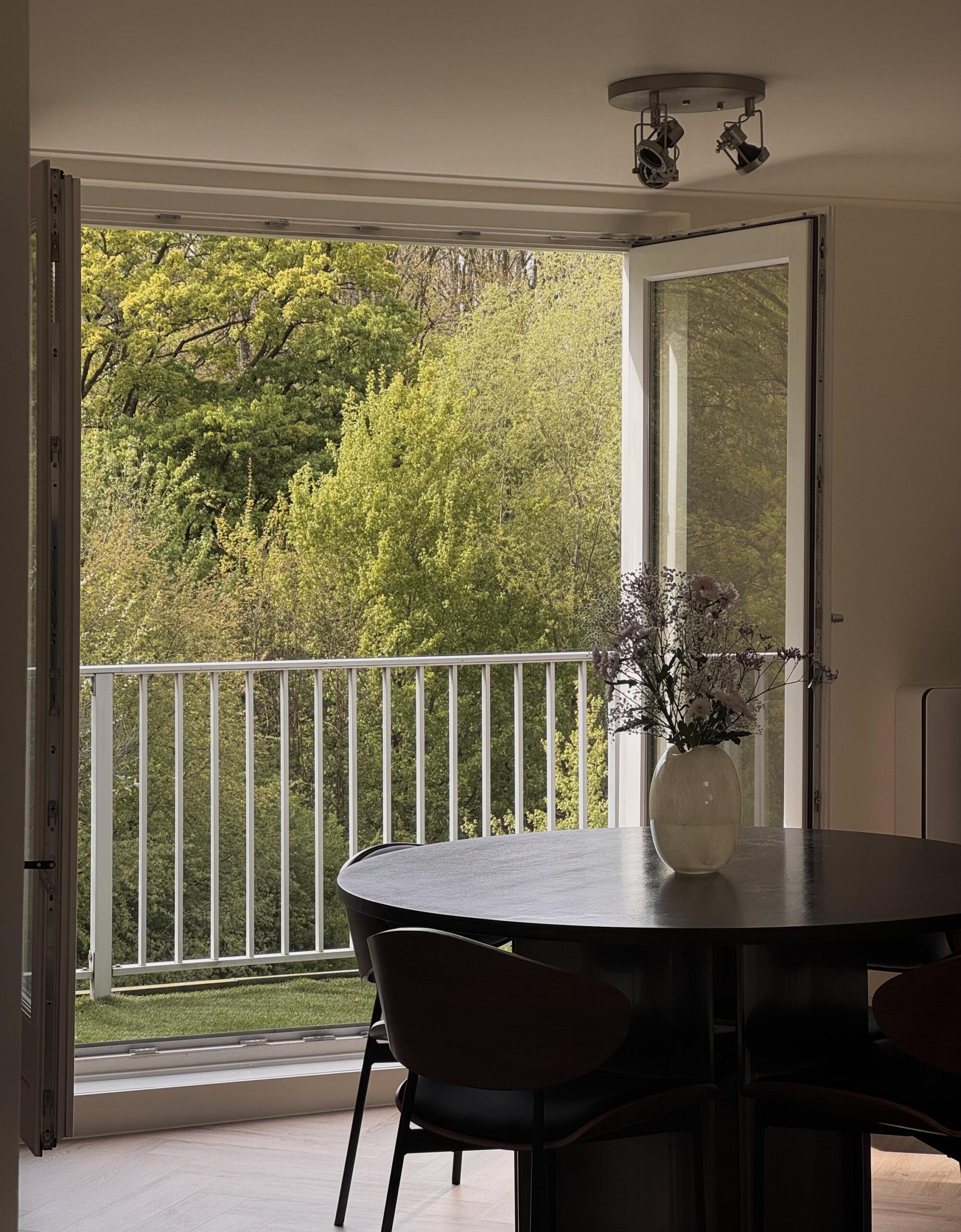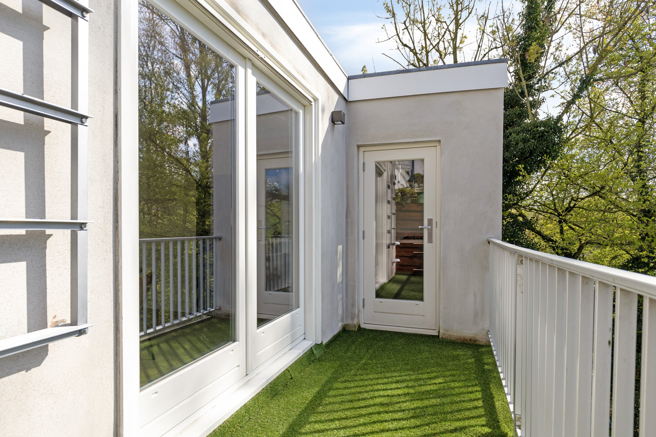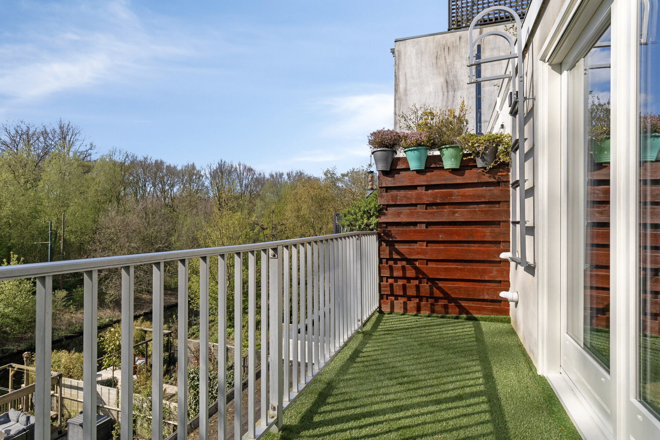 The west-facing balcony gets the afternoon sun and looks straight out over the green. It’s the kind of spot you end up using more than you expect.