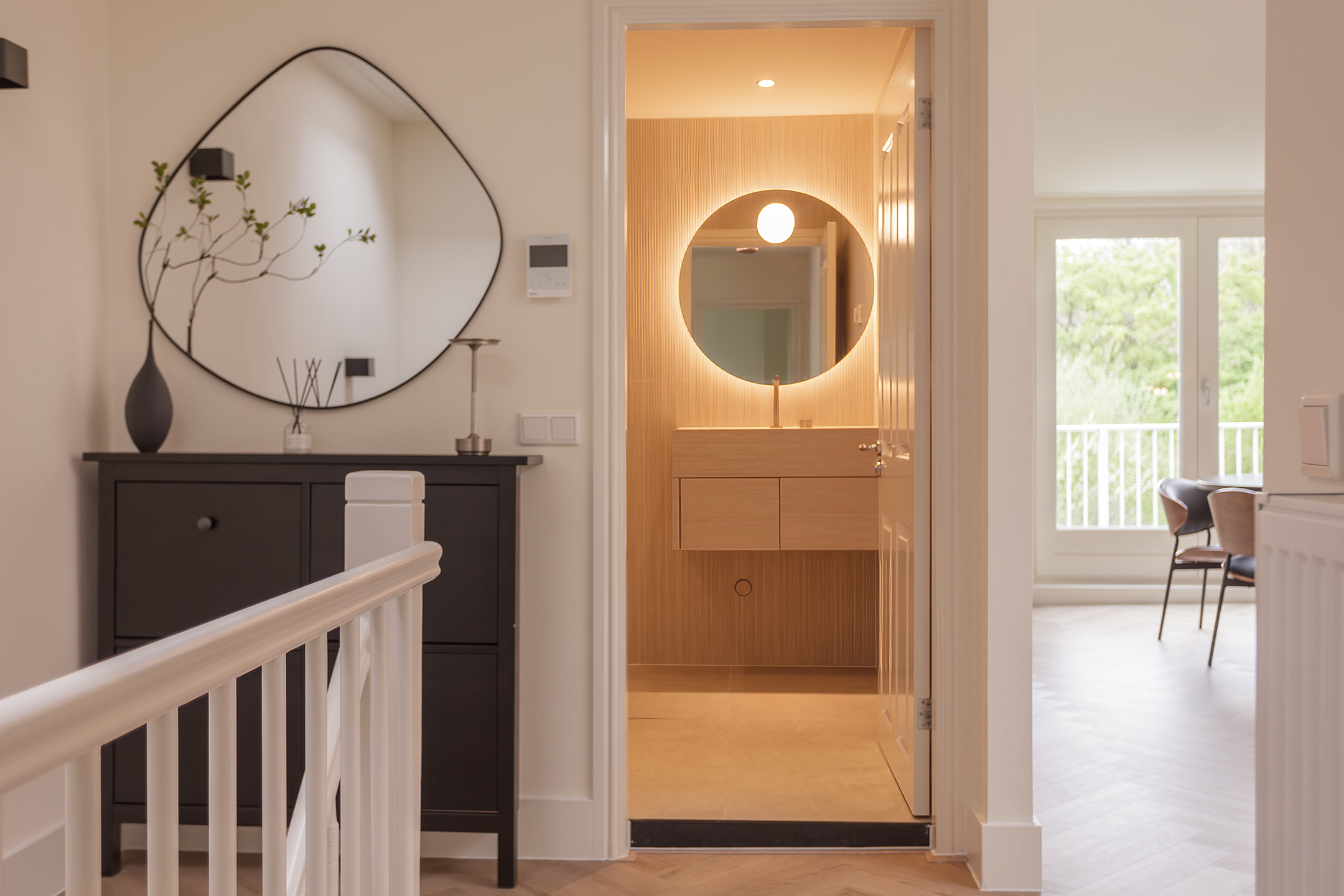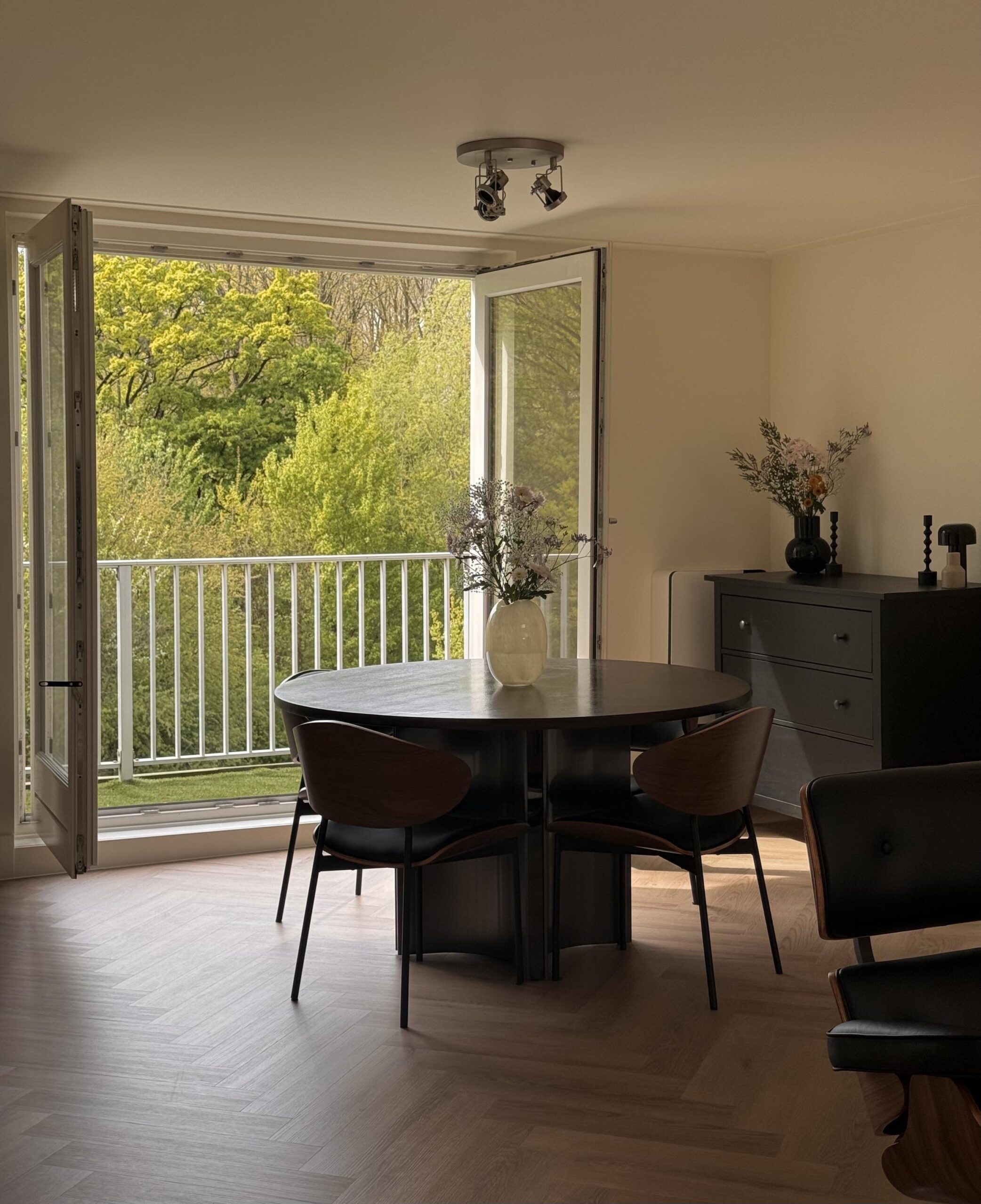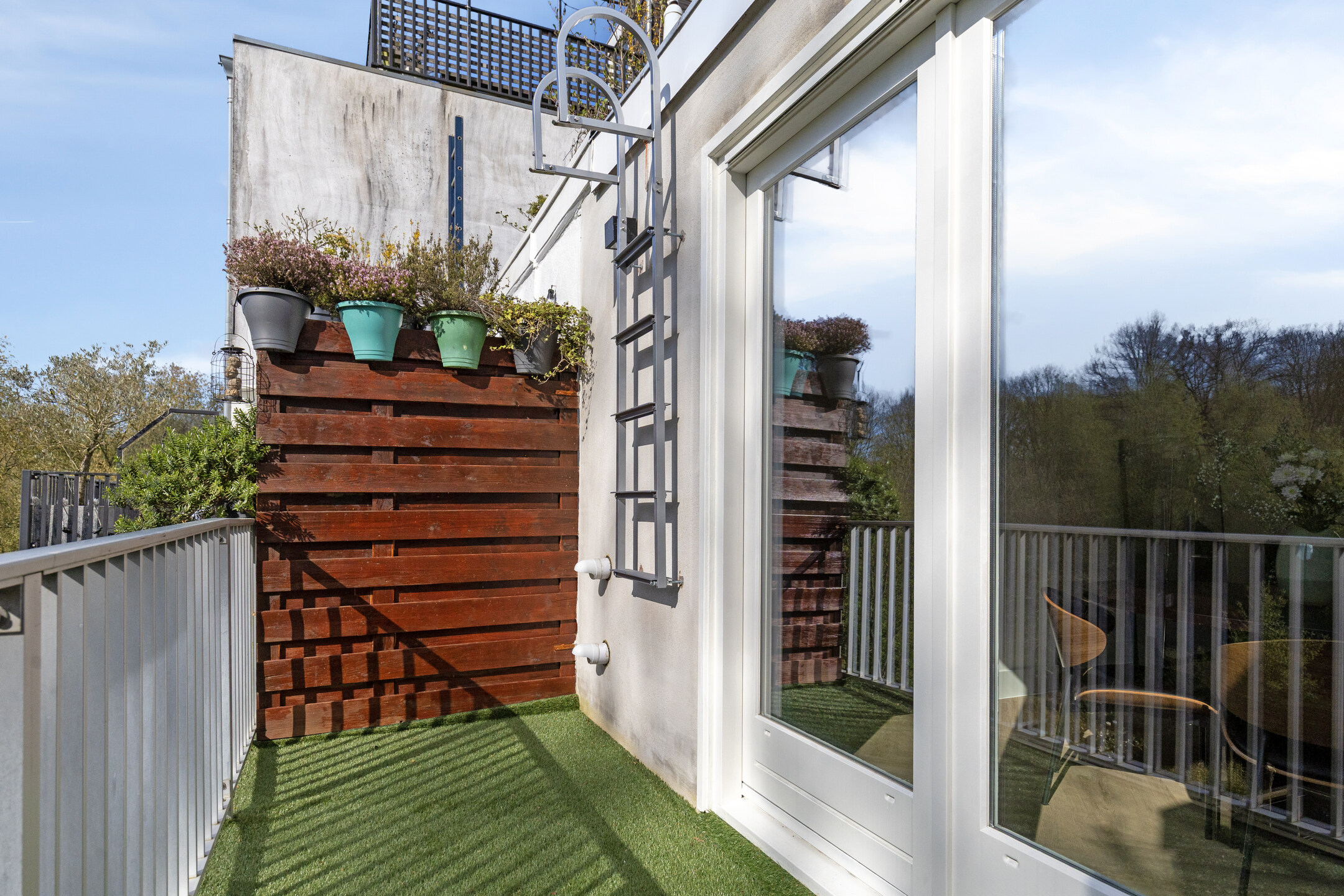 The west-facing balcony gets the afternoon sun and looks straight out over the green. It’s the kind of spot you end up using more than you expect.