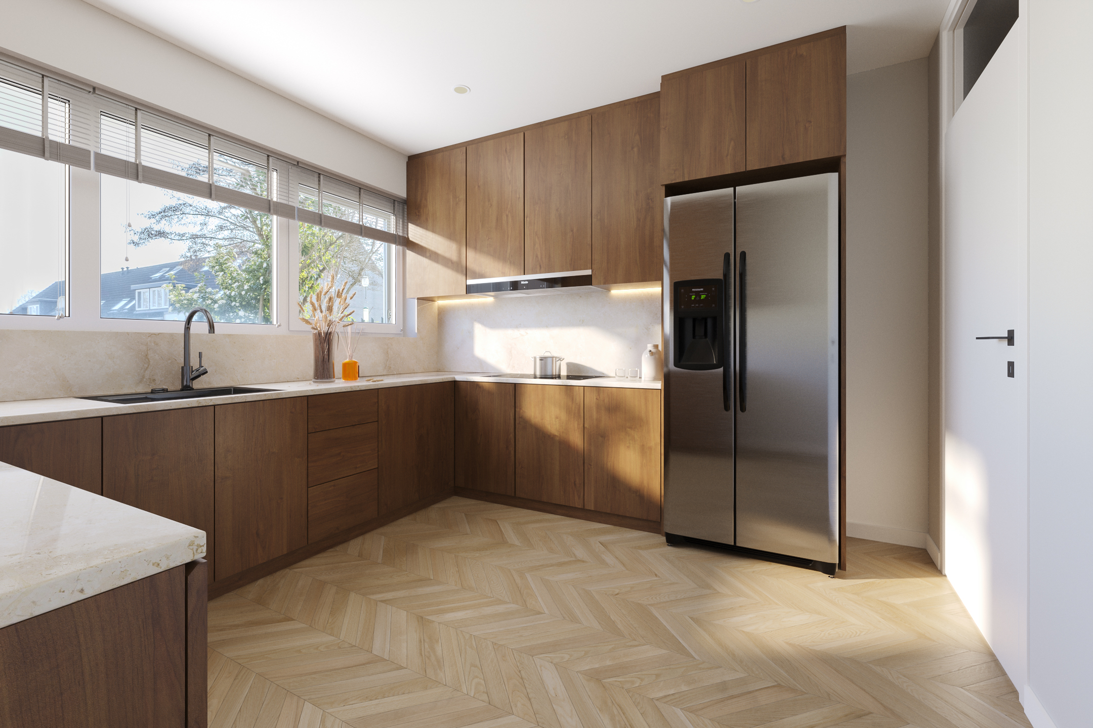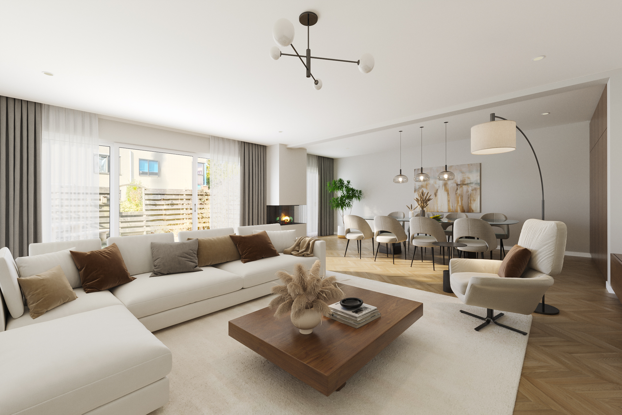Because the living room is fully garden-oriented, there is no overlooking from the street and you sit here wonderfully private. The floor-to-ceiling windows provide an abundance of natural light while the large sliding doors guarantee a seamless transition between the indoor and outdoor life. There is a cozy fireplace in the room and the whole is finished with a tiled floor with underfloor heating.