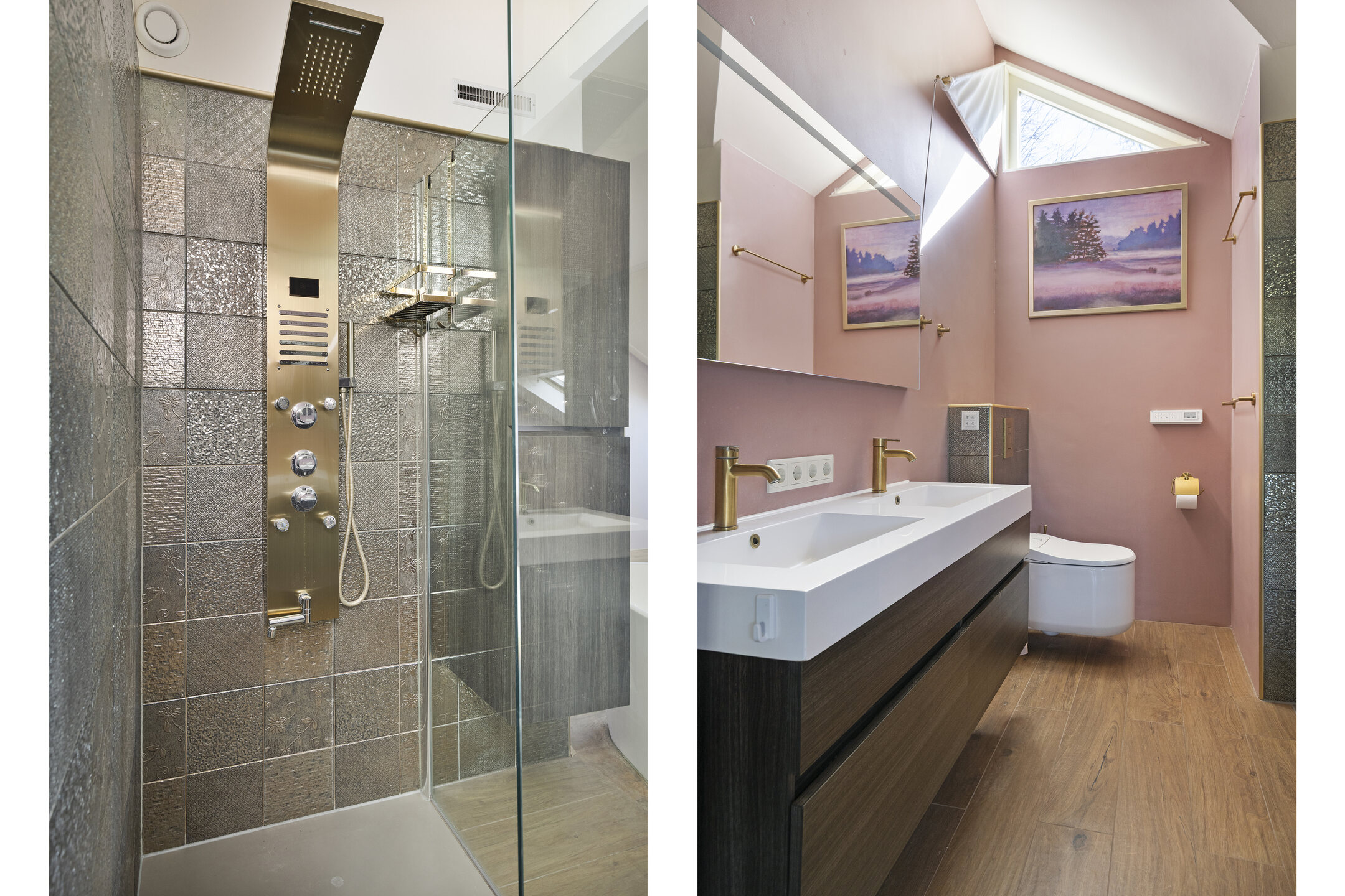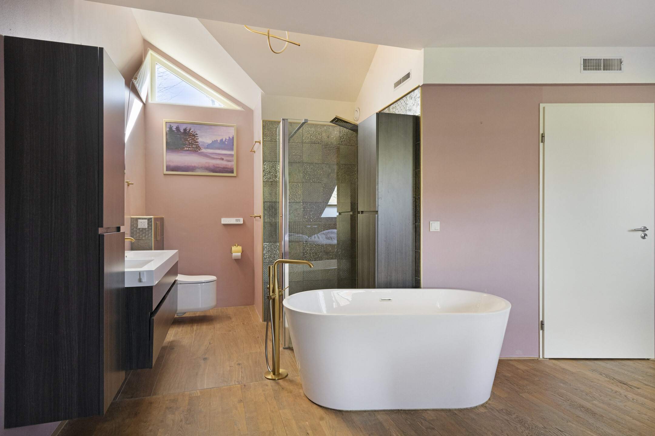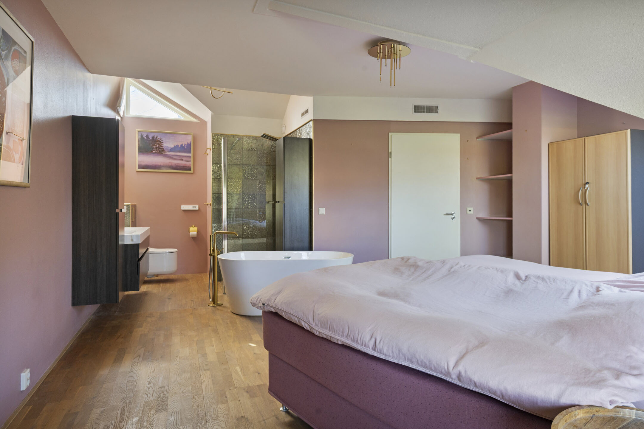 On the first floor, the landing provides access to four bedrooms and a bathroom. The highlight of this level is undoubtedly the spacious master bedroom (18.5 m²), which features a luxurious open-plan bathroom. It includes a freestanding bathtub, a large walk-in shower, a double vanity unit, and a toilet, giving the space a distinctly comfortable and unique character.