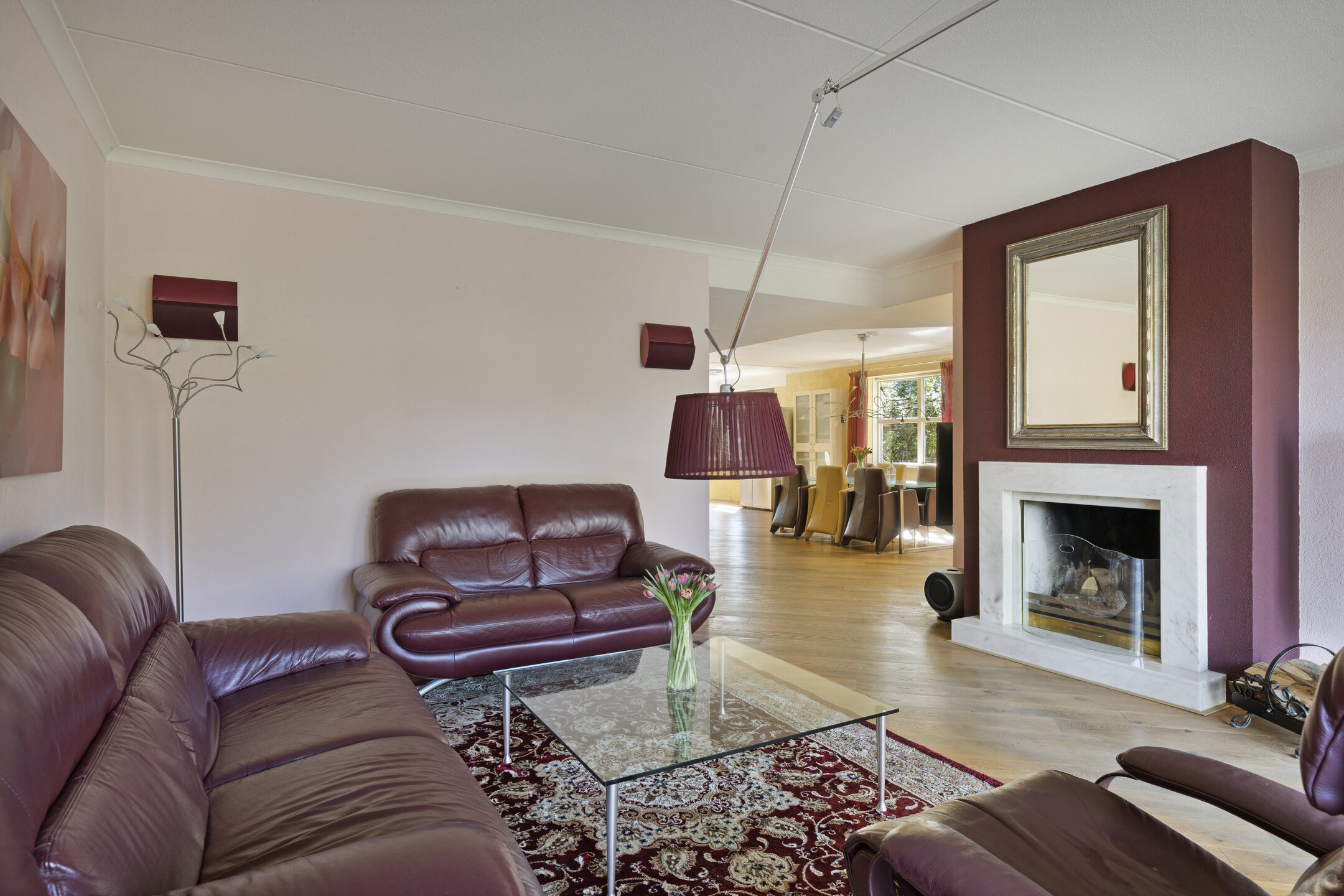 The living room (54.3 m²) is located at the rear and, thanks to the wide sliding doors, has a direct connection to the garden. The oak wooden floor and fireplace create a warm atmosphere, while the large glass surfaces bring the greenery indoors.