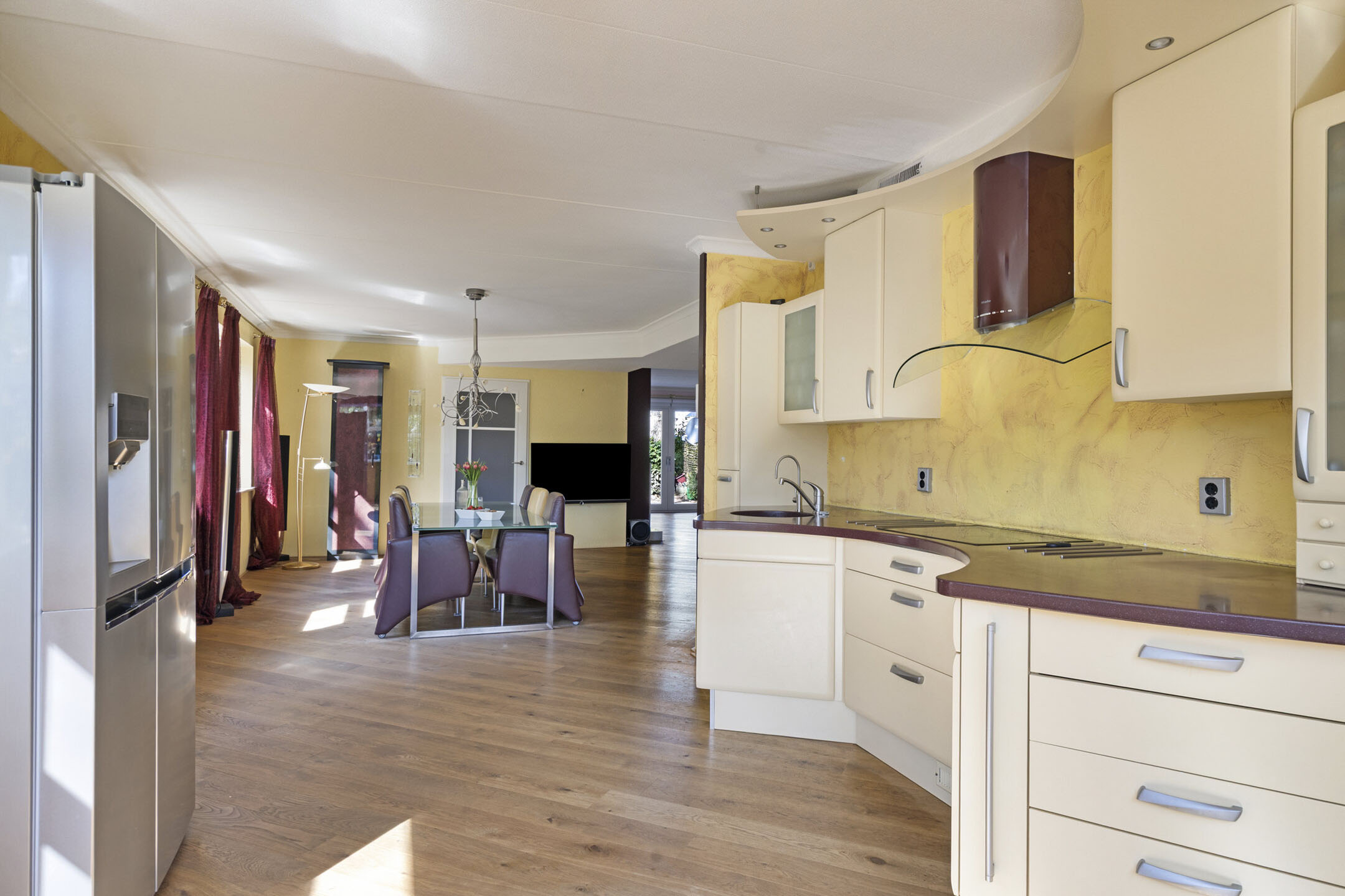At the front is the kitchen, designed in a playful layout with plenty of workspace and storage. The impressive window provides abundant natural light and a beautiful view. The kitchen is equipped with various appliances, including an induction cooktop, extractor hood, boiling water tap, combi oven, and dishwasher.