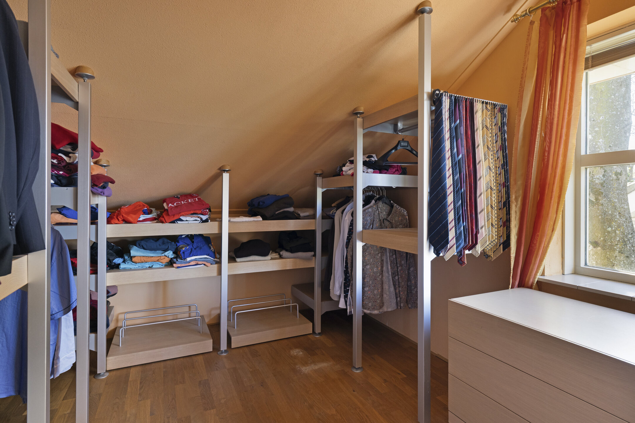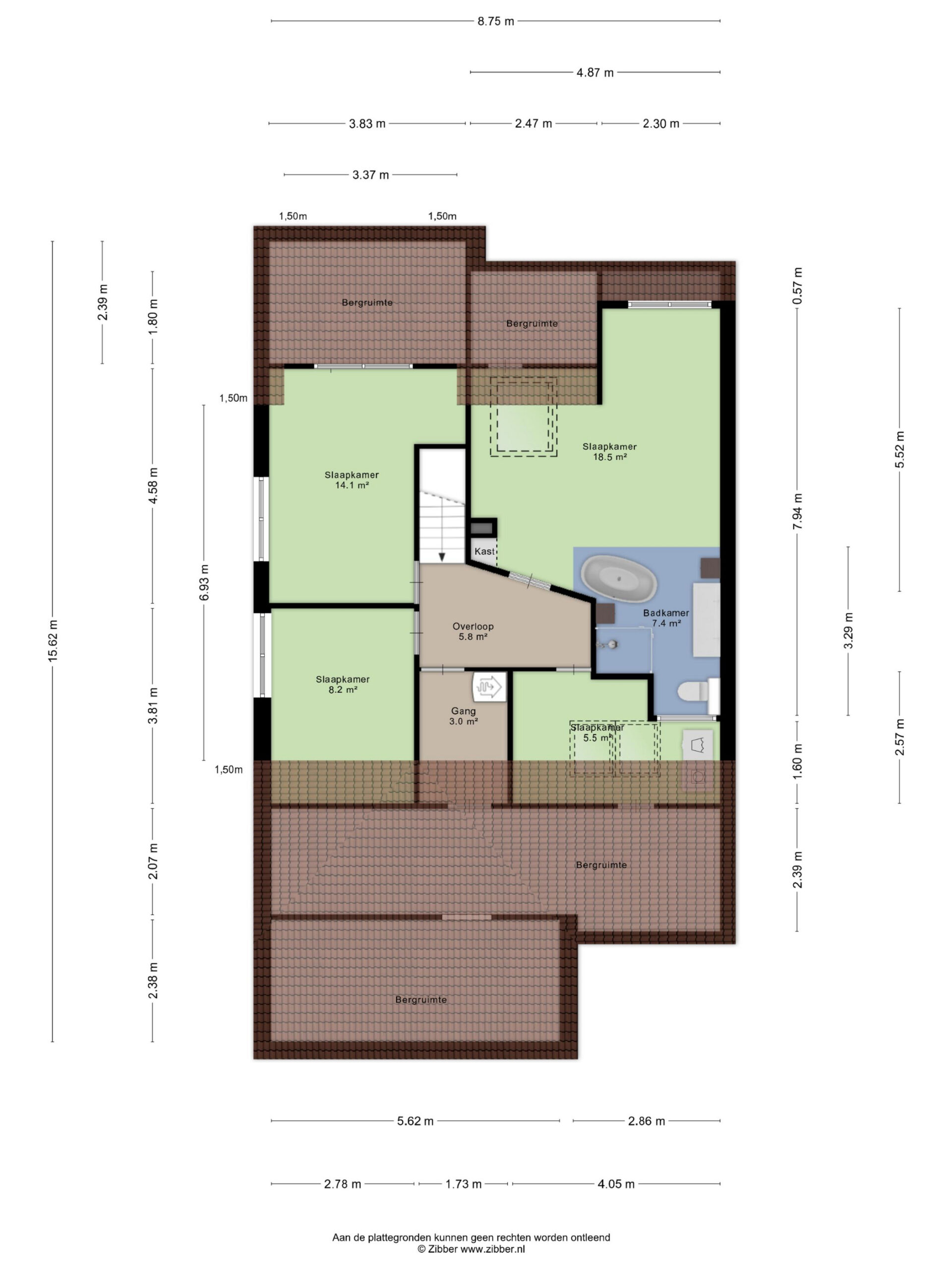 The other bedrooms (14.1 m², 8.2 m², and 5.5 m²) are also well laid out and benefit from pleasant natural light. One of the rooms is equipped with connections for laundry appliances, and the entire floor offers ample storage behind the knee walls.