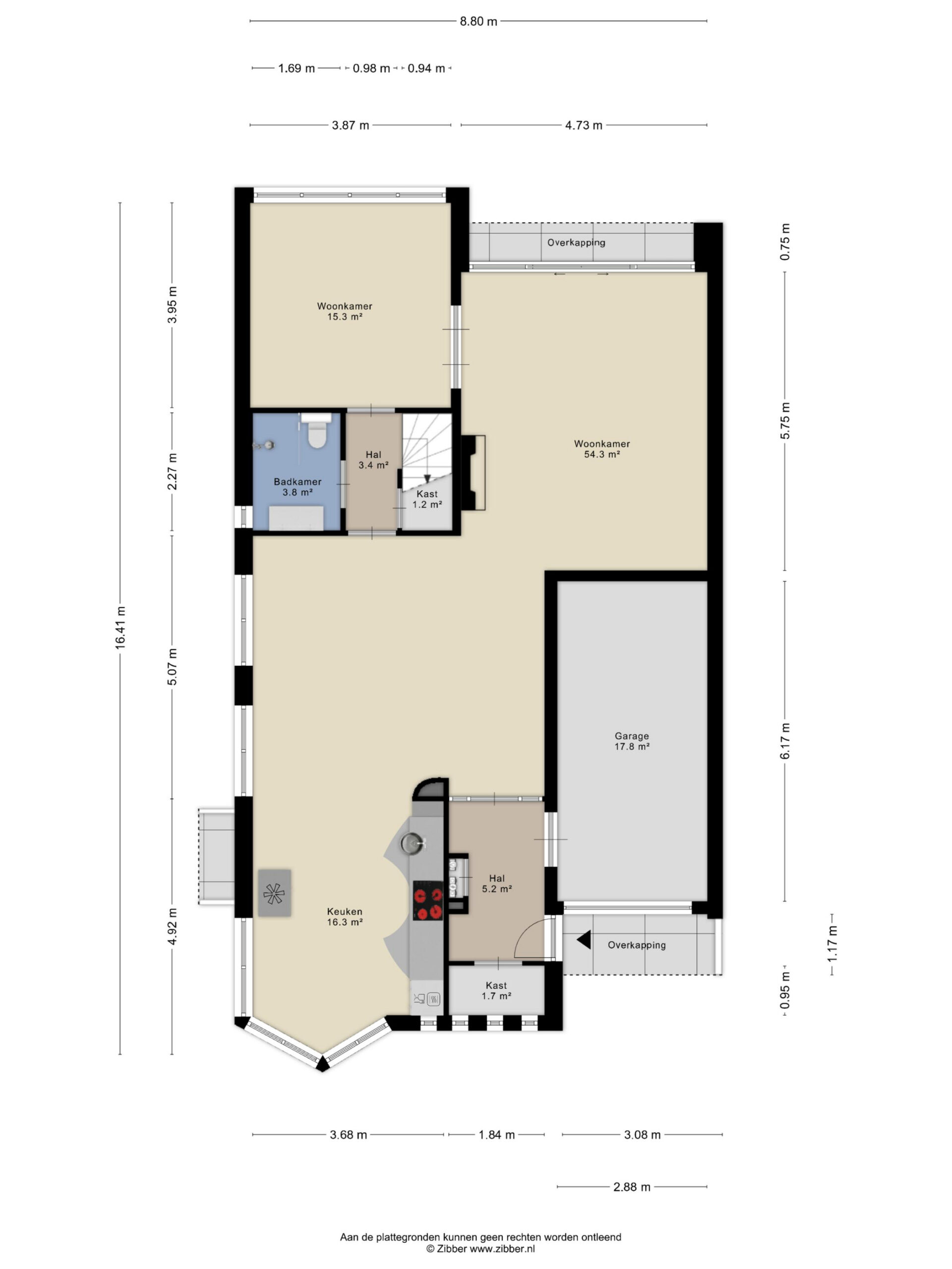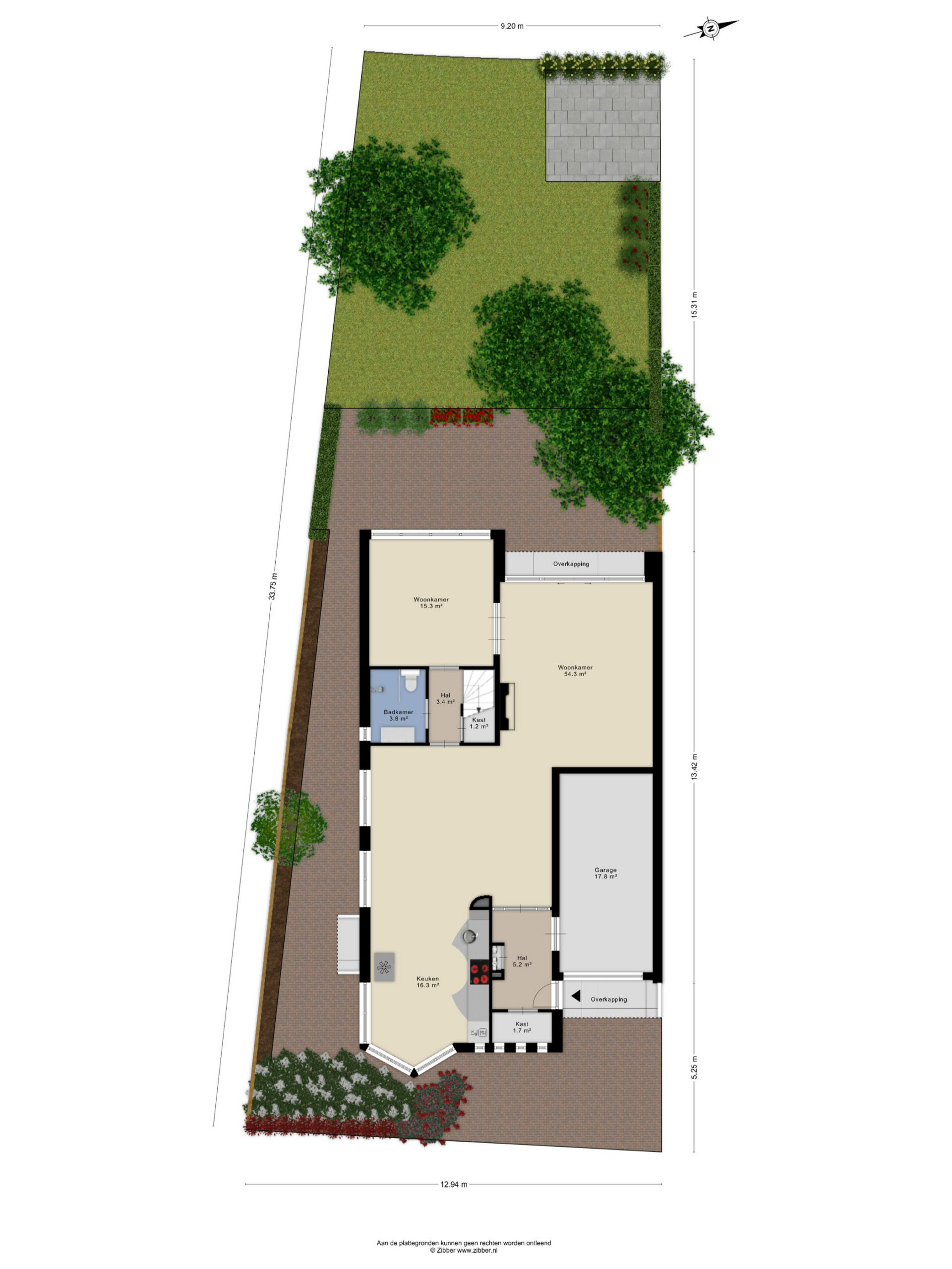 At the front, the property features a private driveway and access to the integrated garage (17.8 m²), providing convenient on-site parking and additional storage.