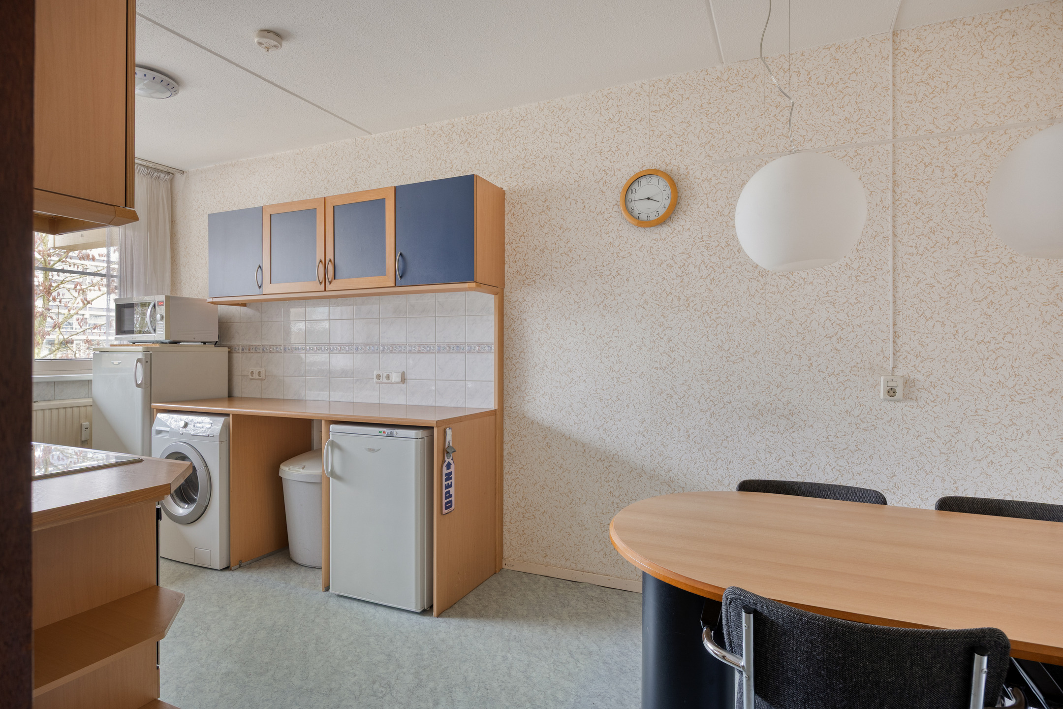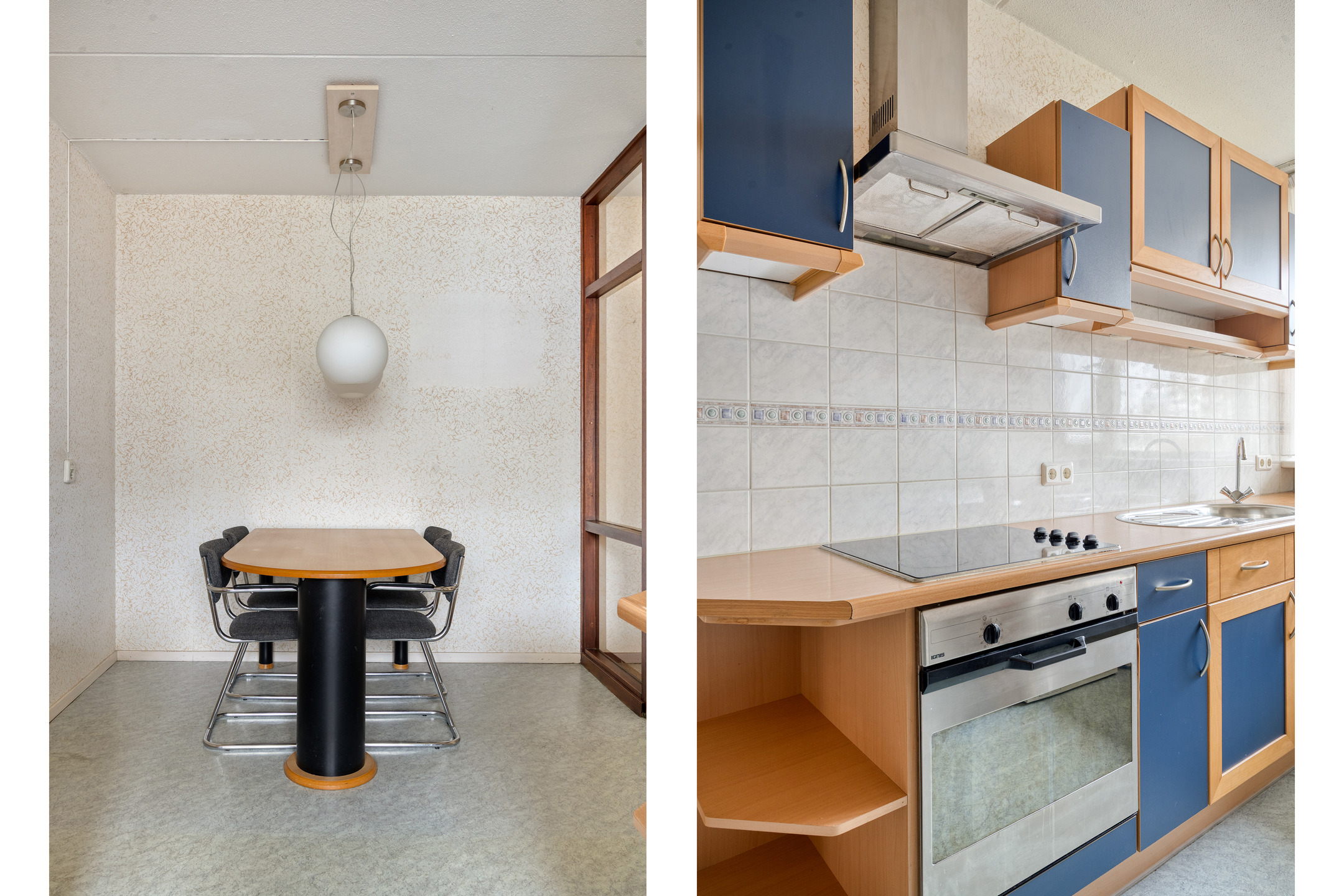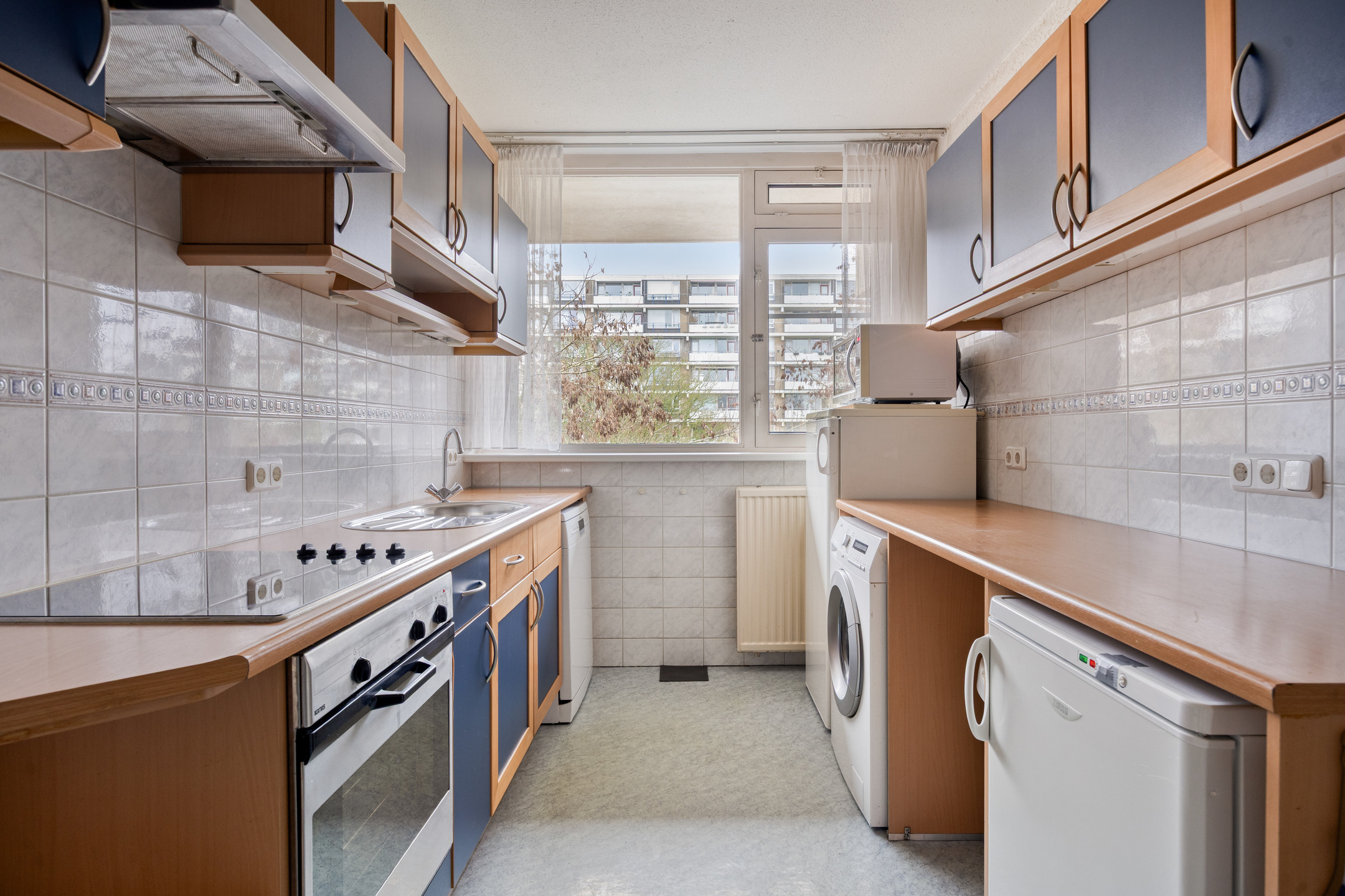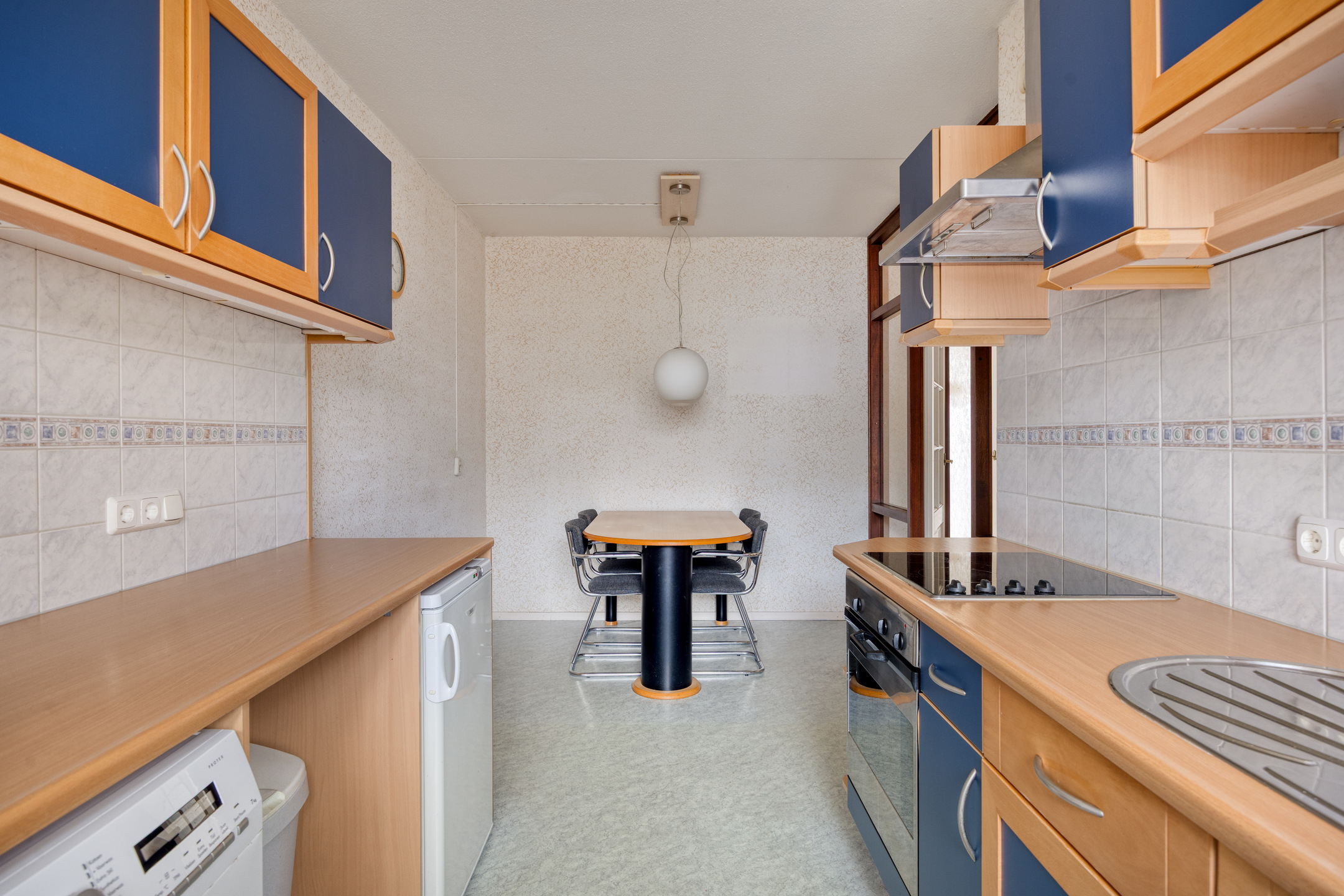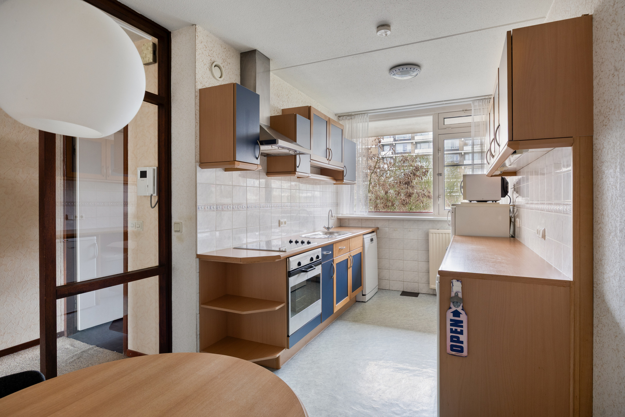The separate kitchen adjoins the hallway and is practically laid out with two worktops. It features an ceramic hob with extractor hood, a sink, various storage options and a built-in oven combination. There is also space for a dining table, allowing for informal meals. The kitchen provides a solid base and can be fully modernised to suit your own preferences.