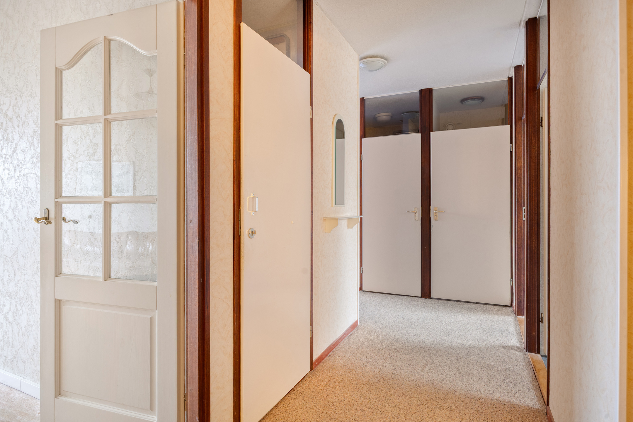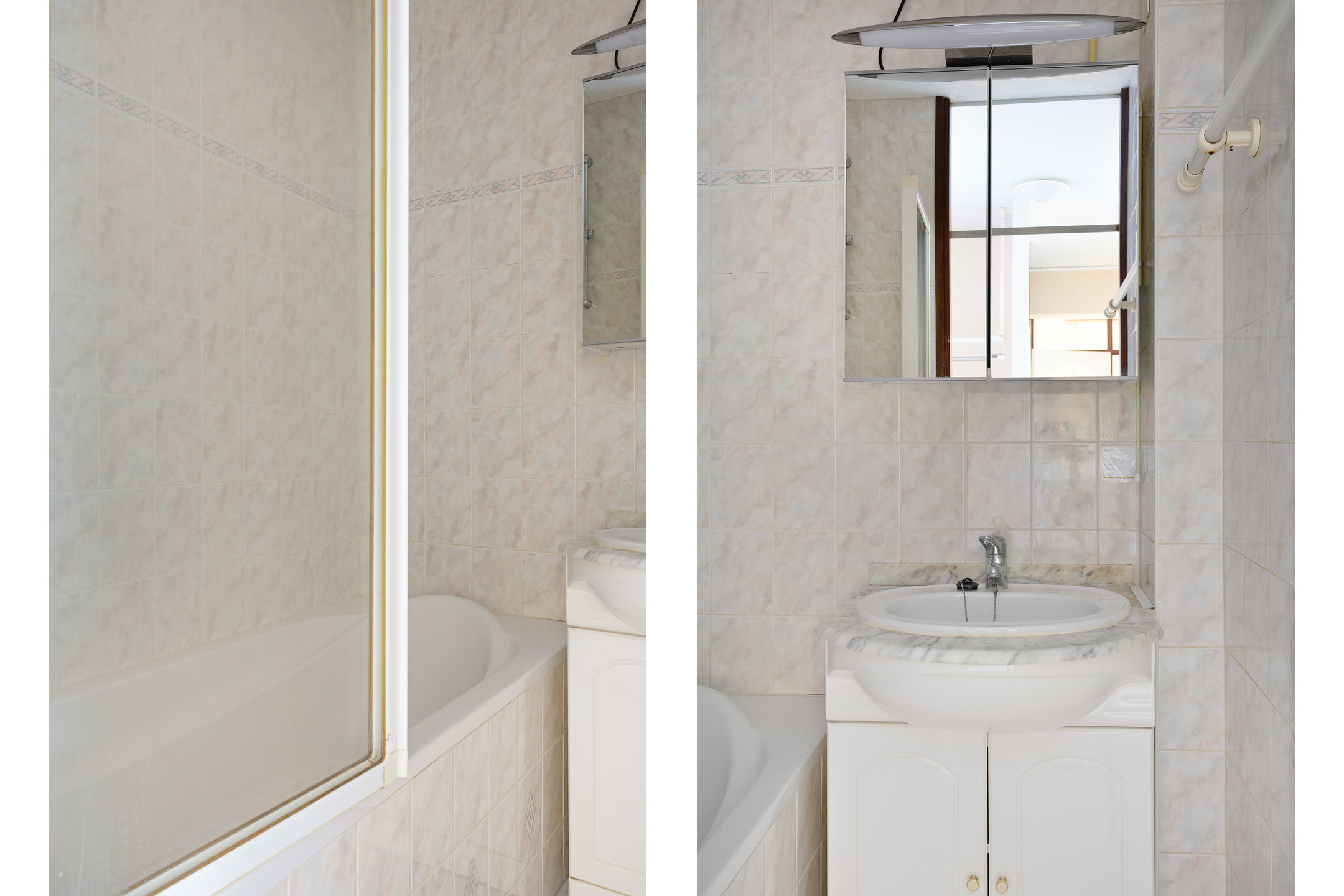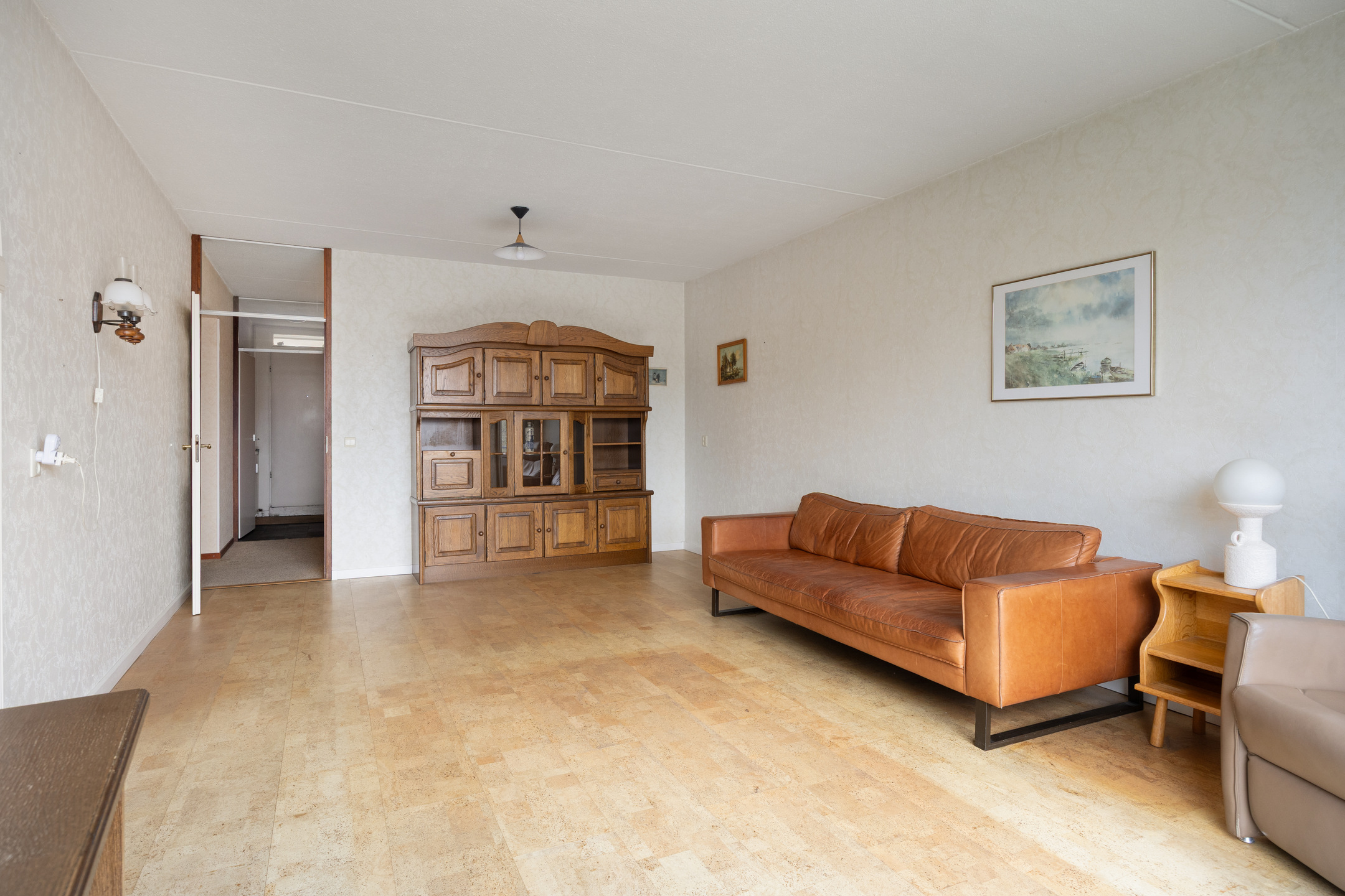 The tiled bathroom is accessible from the hallway and is equipped with a bathtub with shower, a washbasin with mirror and practical storage space. In addition, there is a separate toilet, providing extra comfort in daily use. Here too, you have the opportunity to modernise the space entirely to your own taste and style.