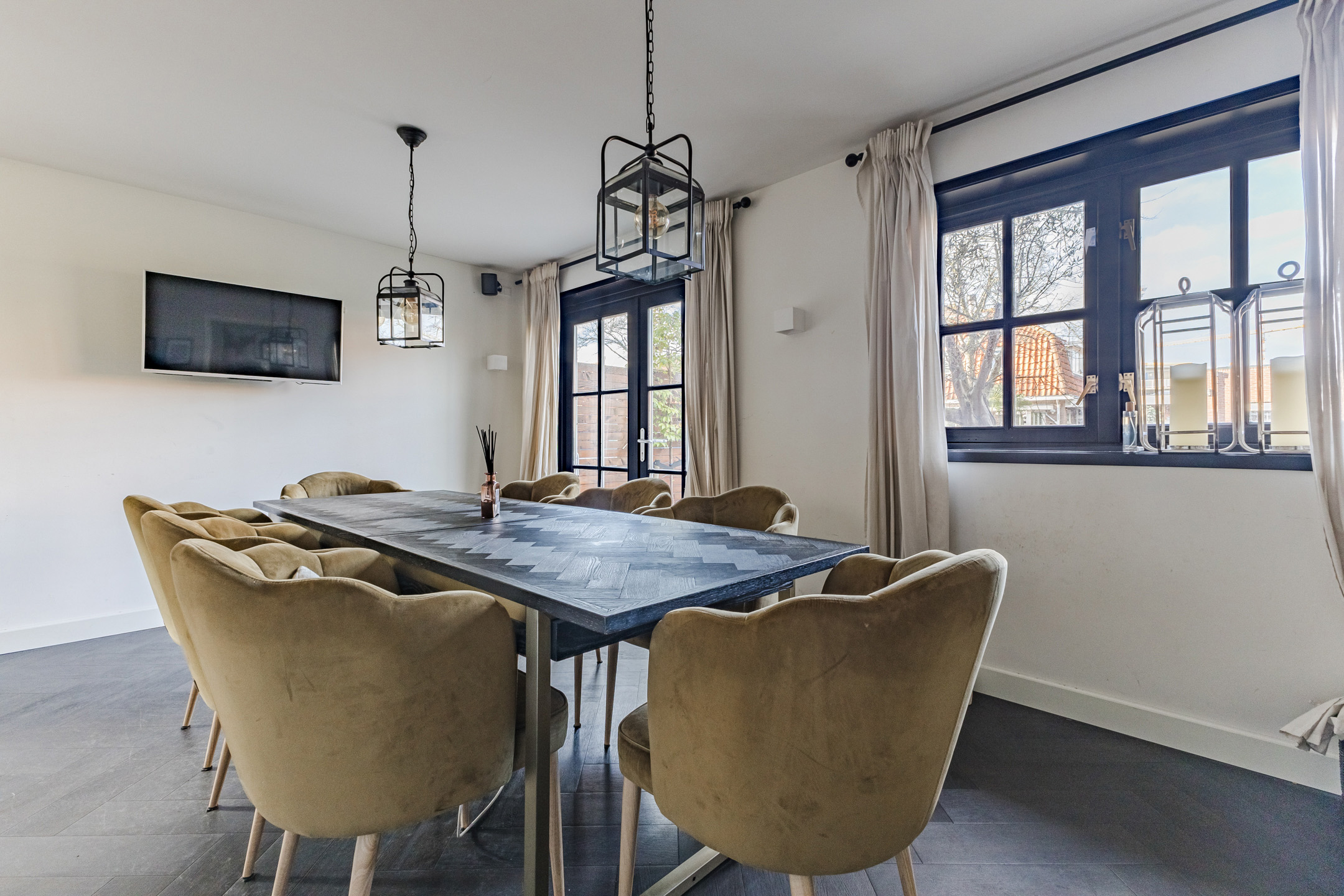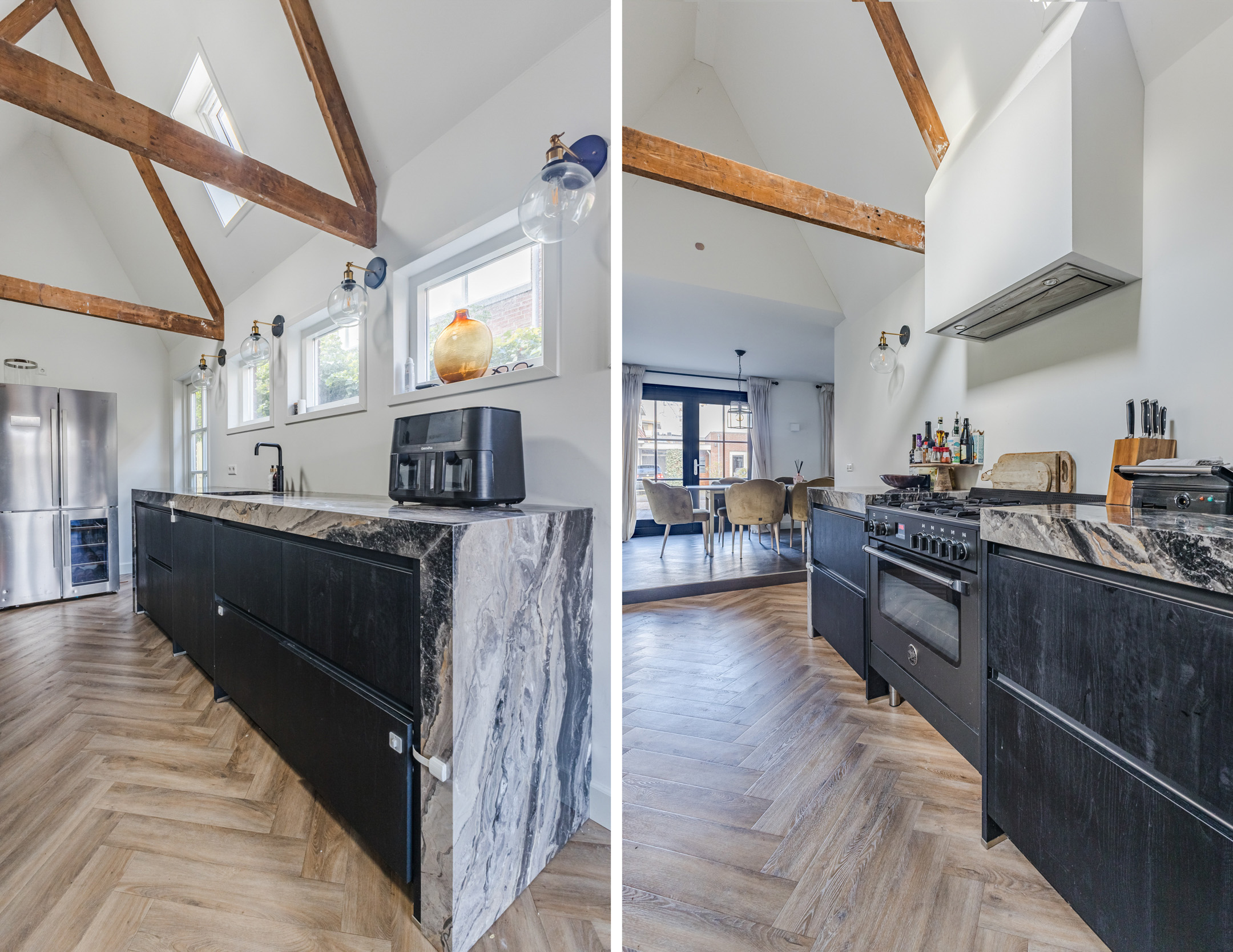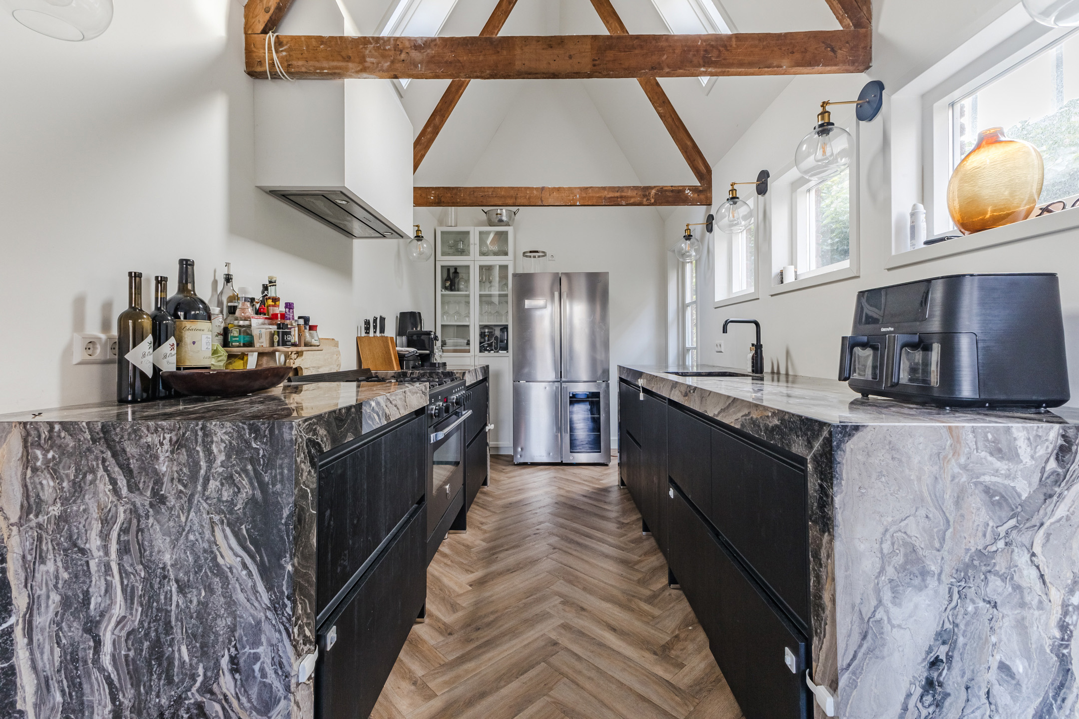The large kitchen/dining area is certainly not inferior to the living room in terms of its atmosphere! What a wonderful and sunny room this is, with patio doors to the garden and an extra back door. The high vaulted ceiling in the kitchen with exposed beams creates a rustic atmosphere, and the extra skylights provide even more natural light.