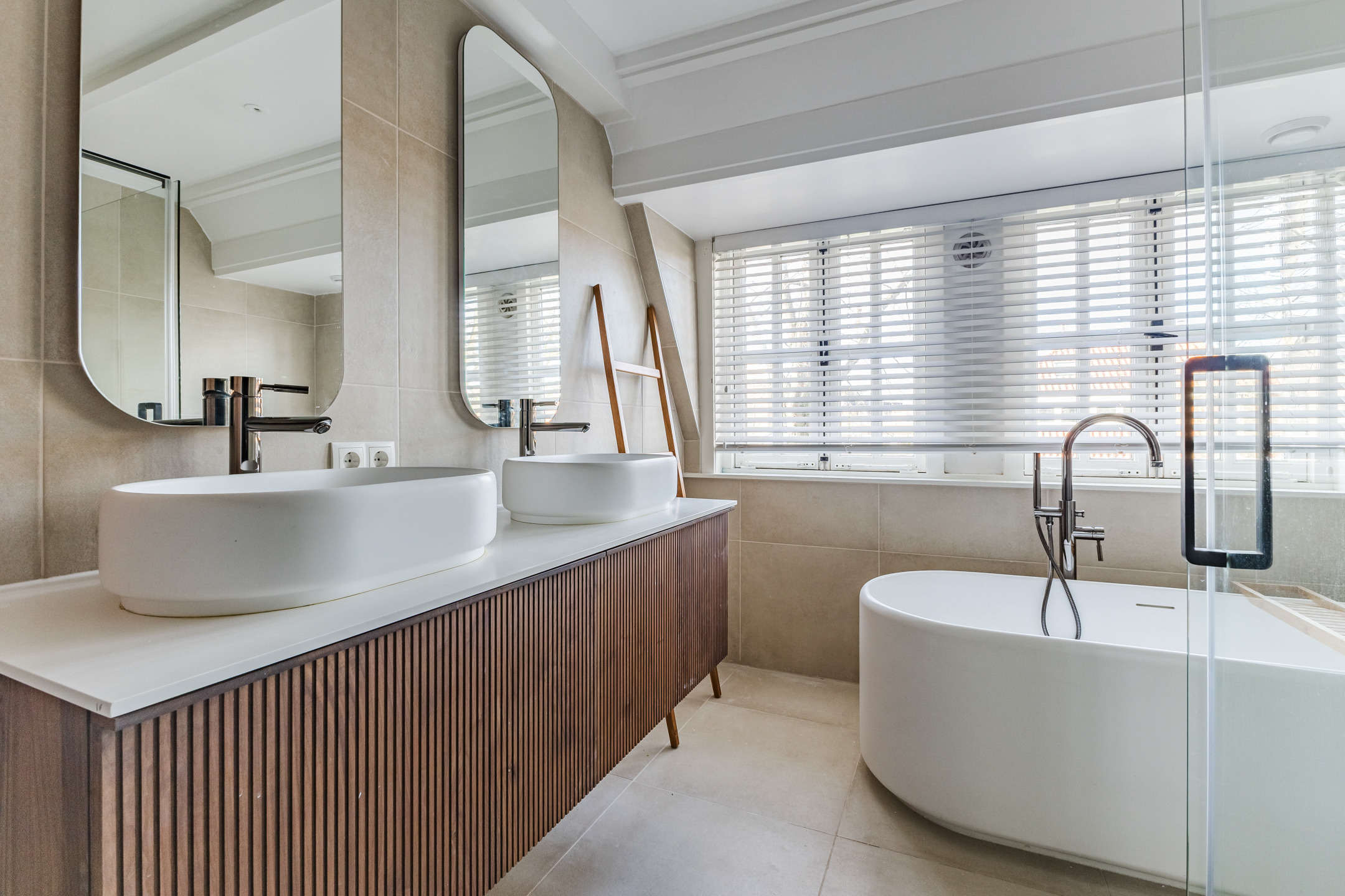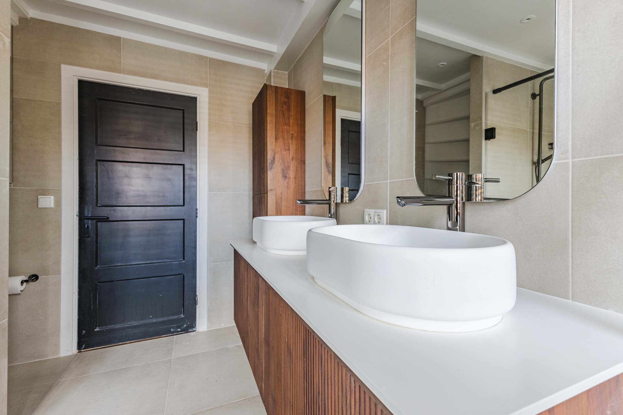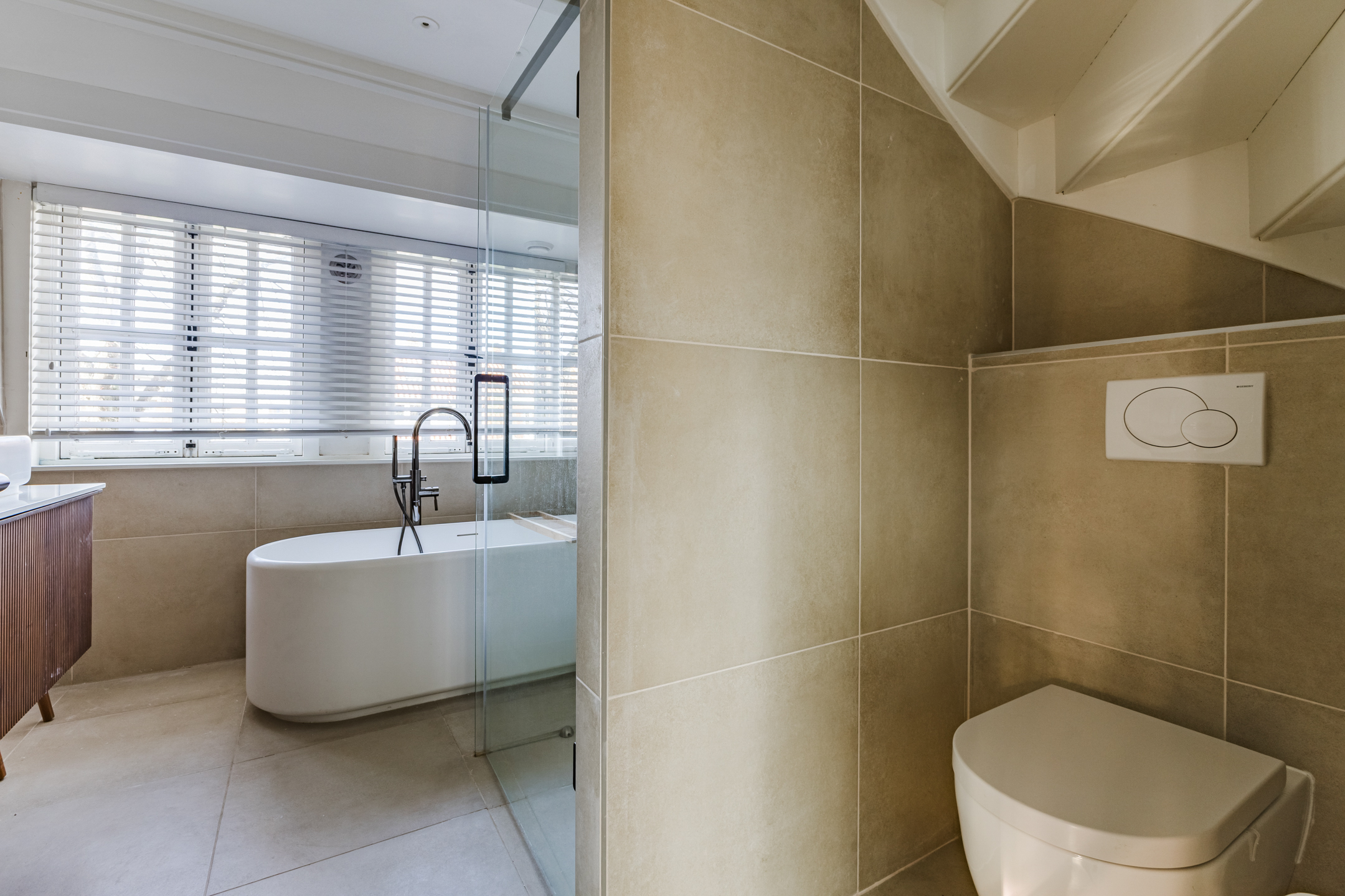 The landing provides access to 2 large bedrooms - both neatly finished with a wooden floor - and the new bathroom with a second toilet, double washbasin with vanity unit, freestanding bathtub and separate walk-in rain shower.