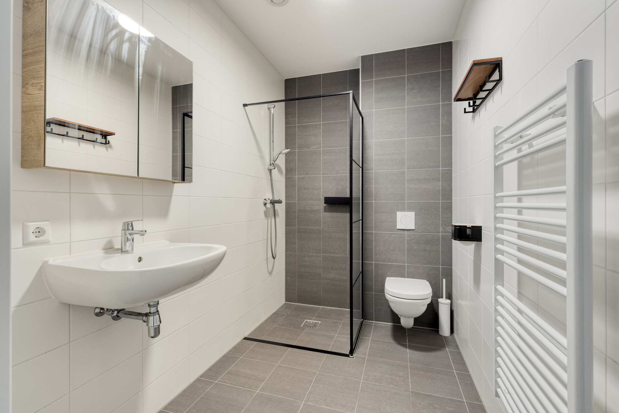 rooms. The bathroom is sleek and functional, fitted with a walk-in shower, washbasin