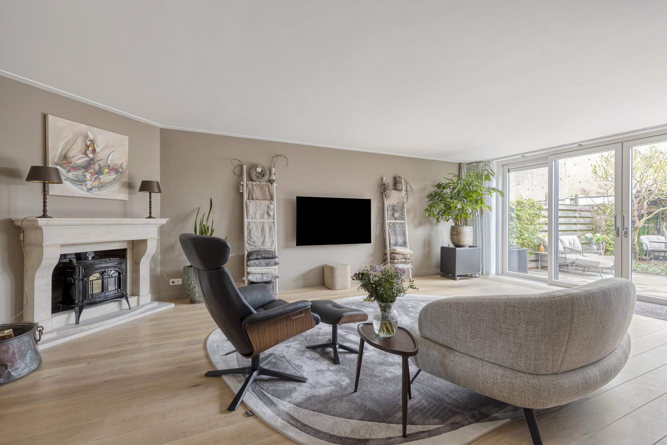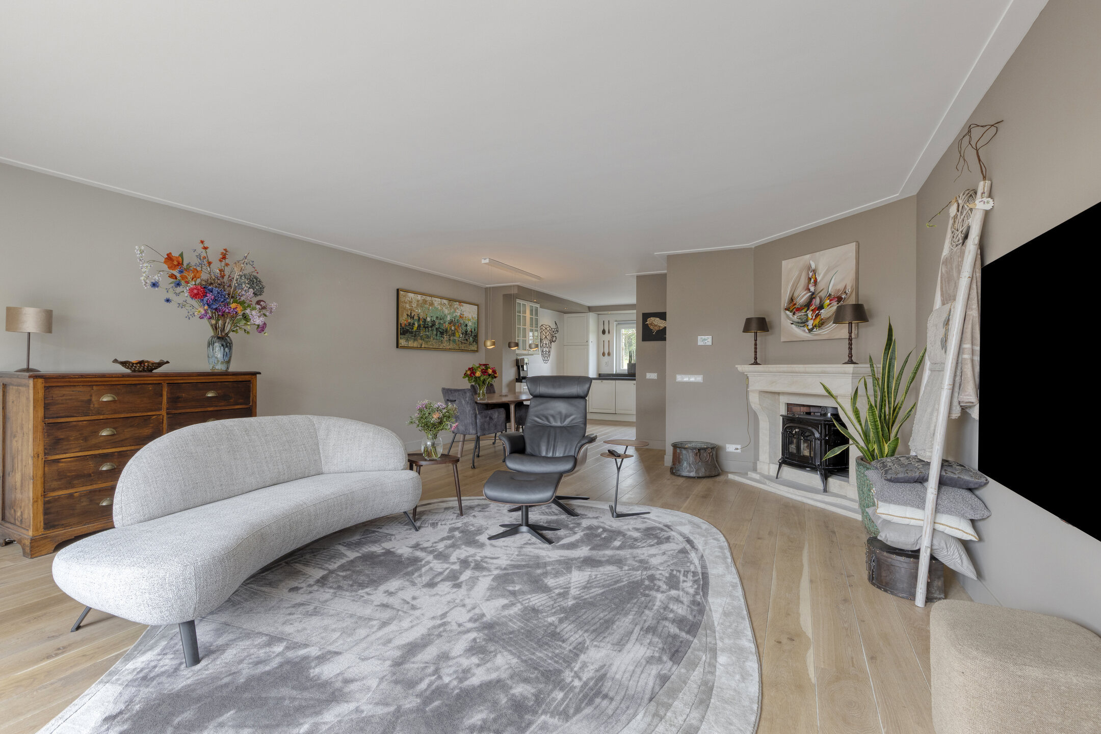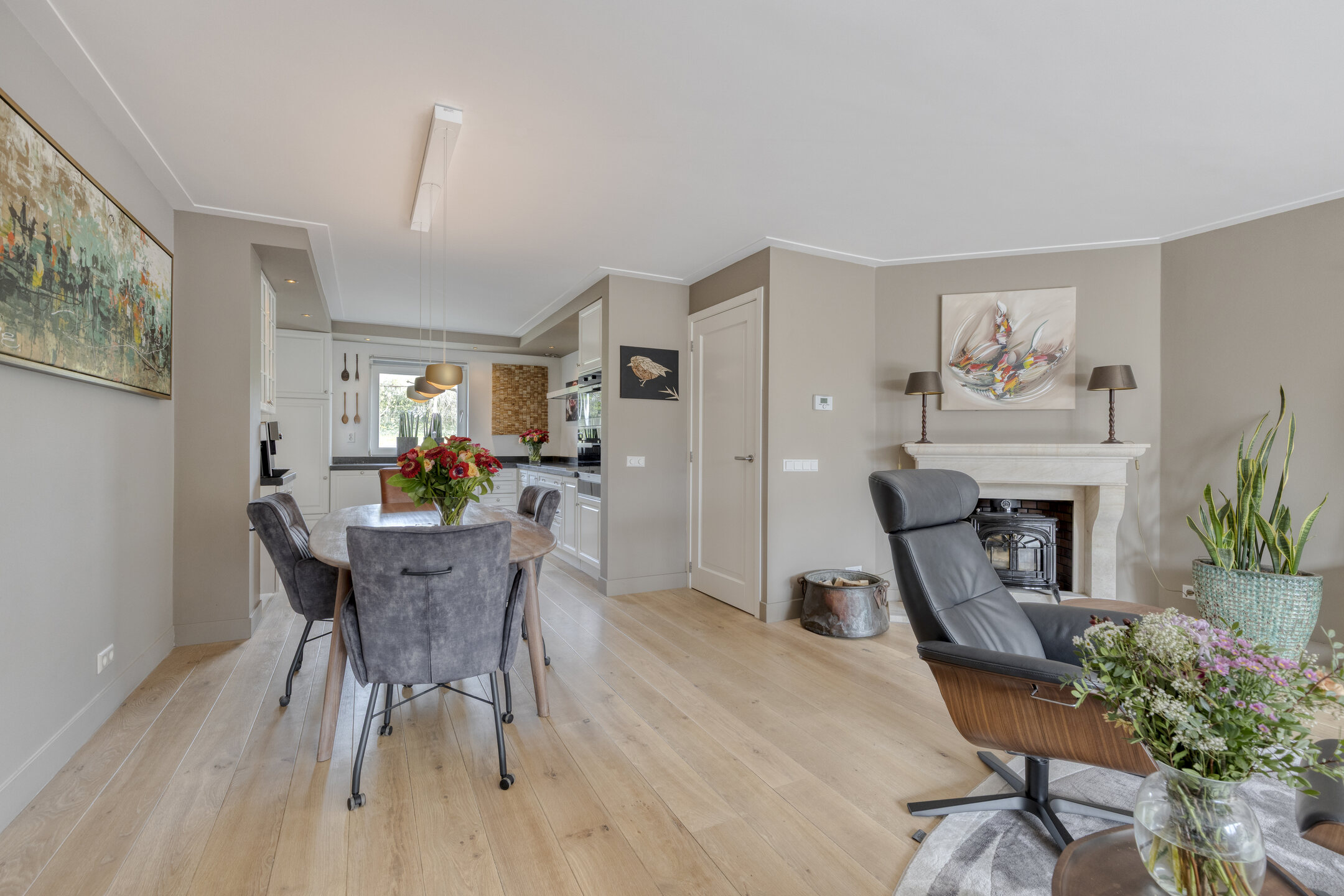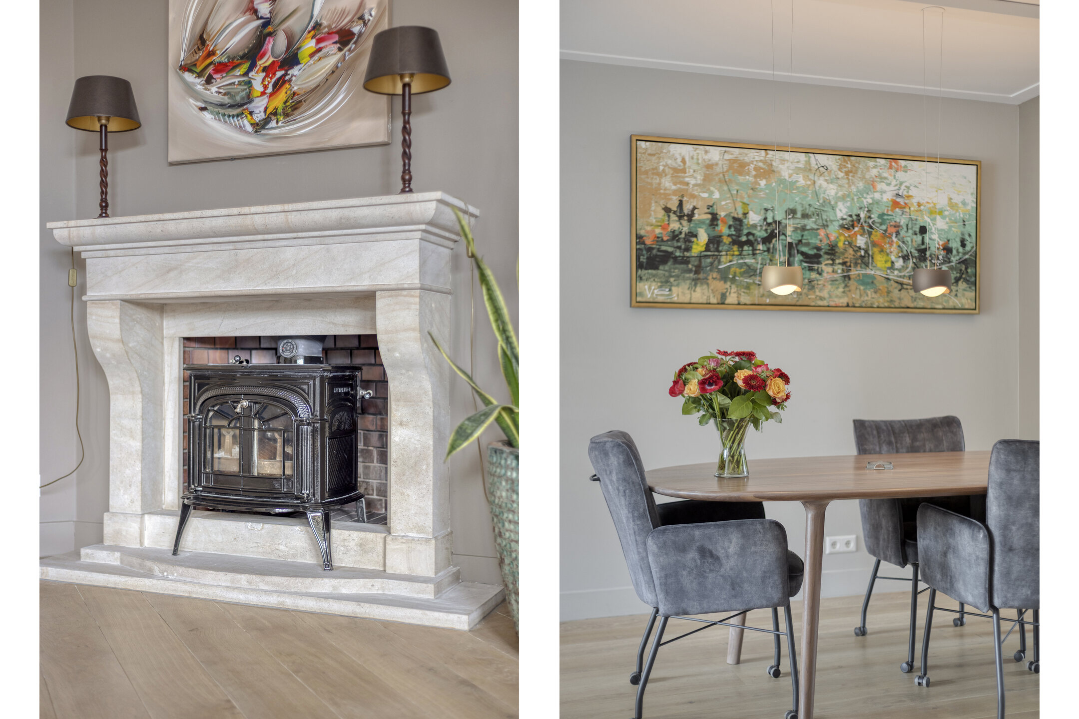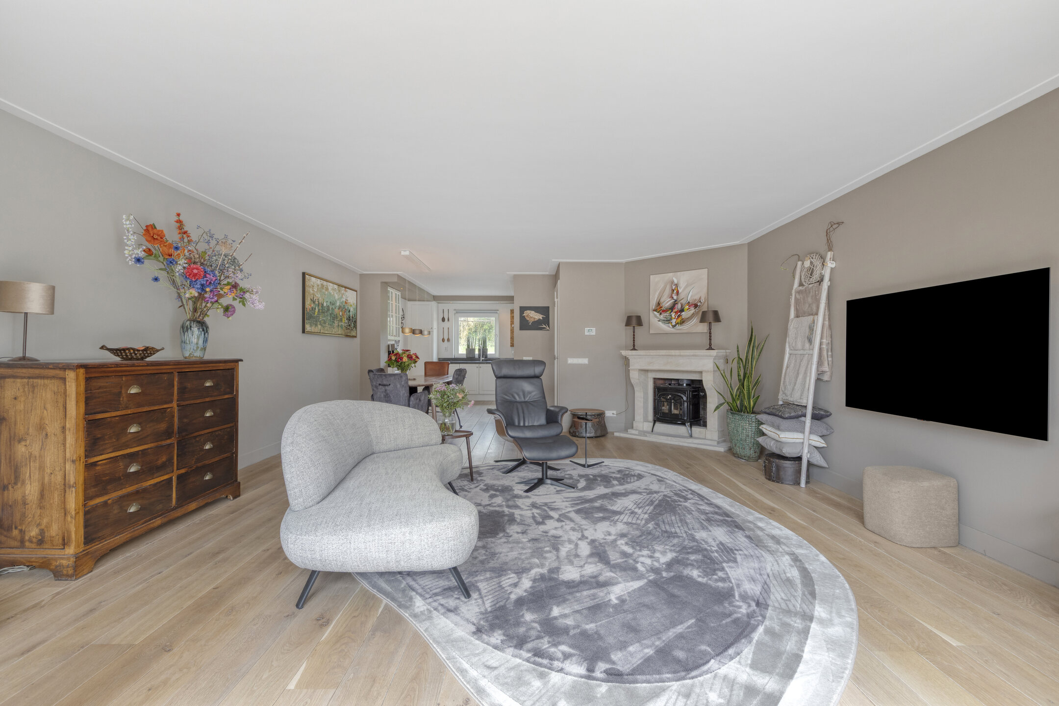 The living room with solid oak flooring forms the heart of the home. Thanks to its open layout and large windows, it enjoys plenty of natural light. There is ample space for a comfortable seating area and a cozy dining area. The sliding doors to the garden create a beautiful connection between indoor and outdoor living. The fireplace with mantel serves as an attractive focal point, making the space even more inviting.