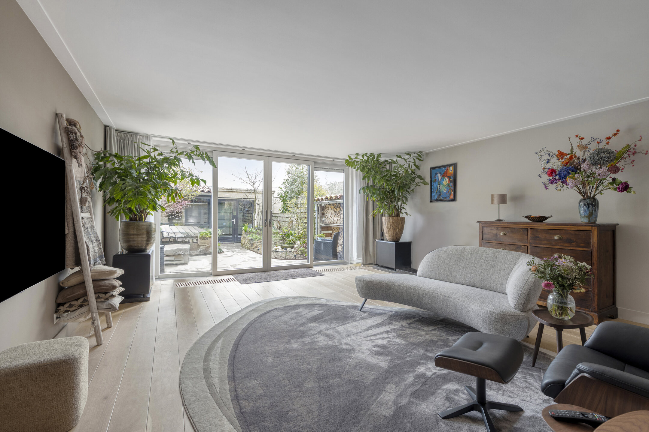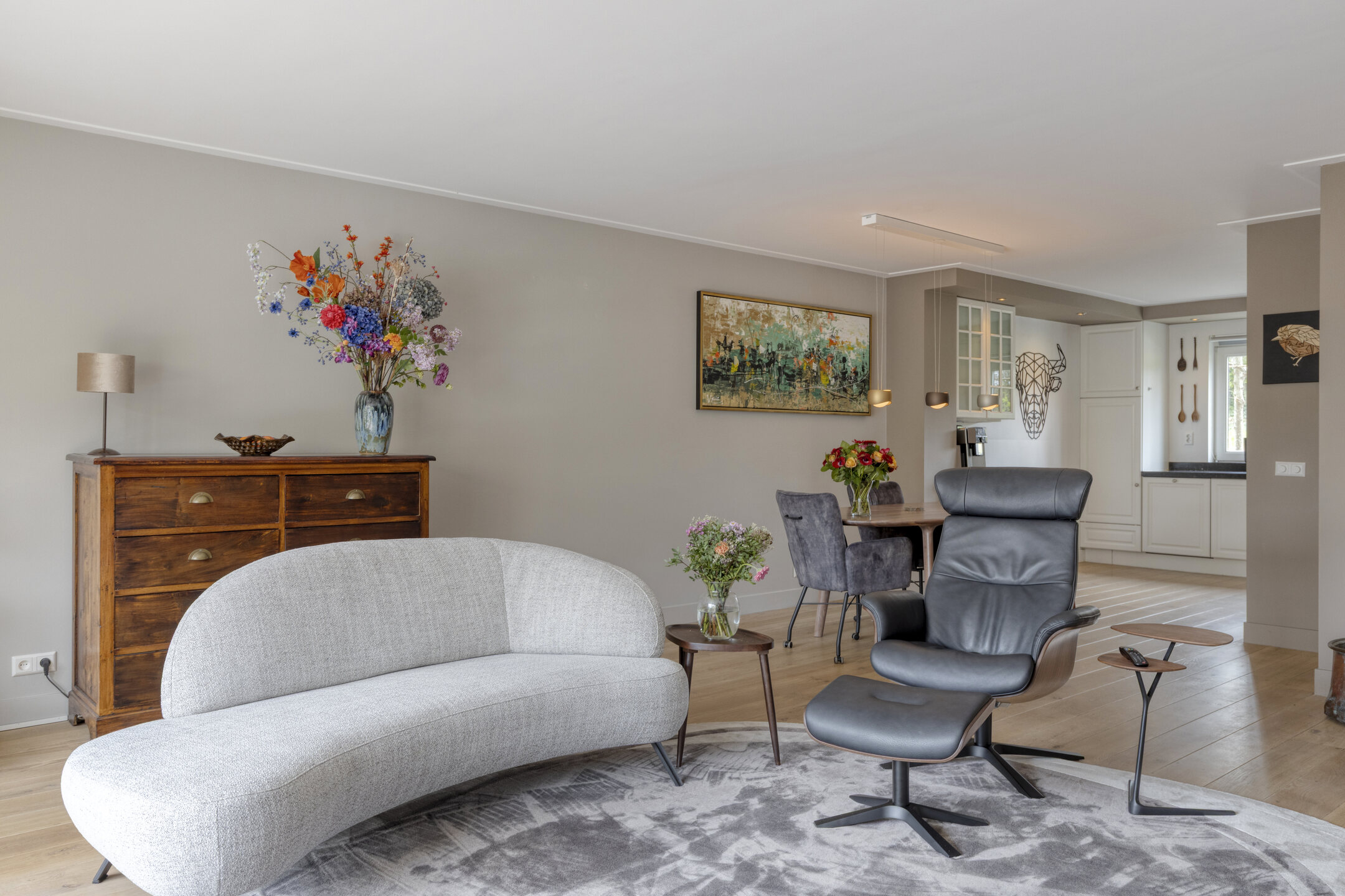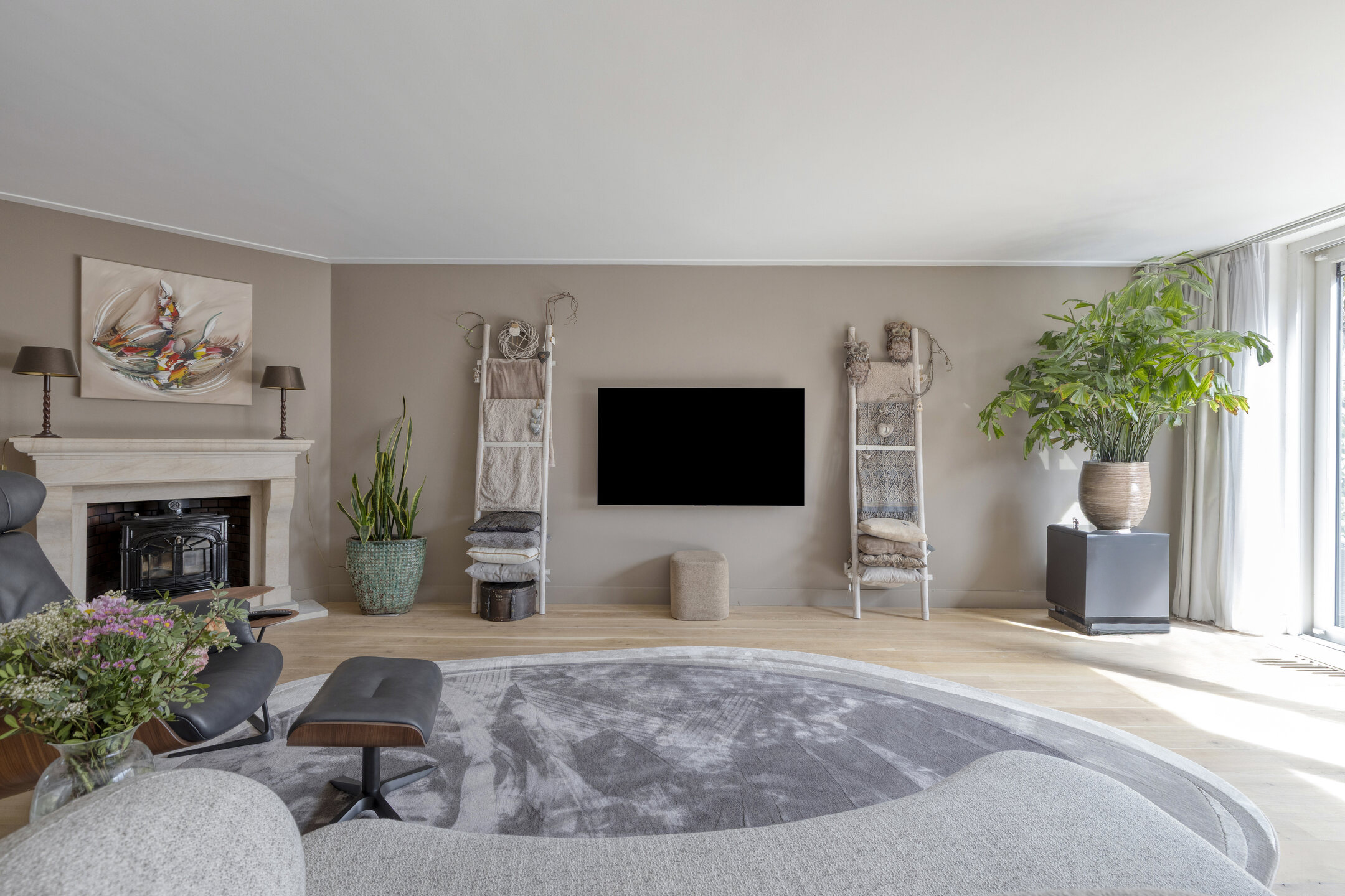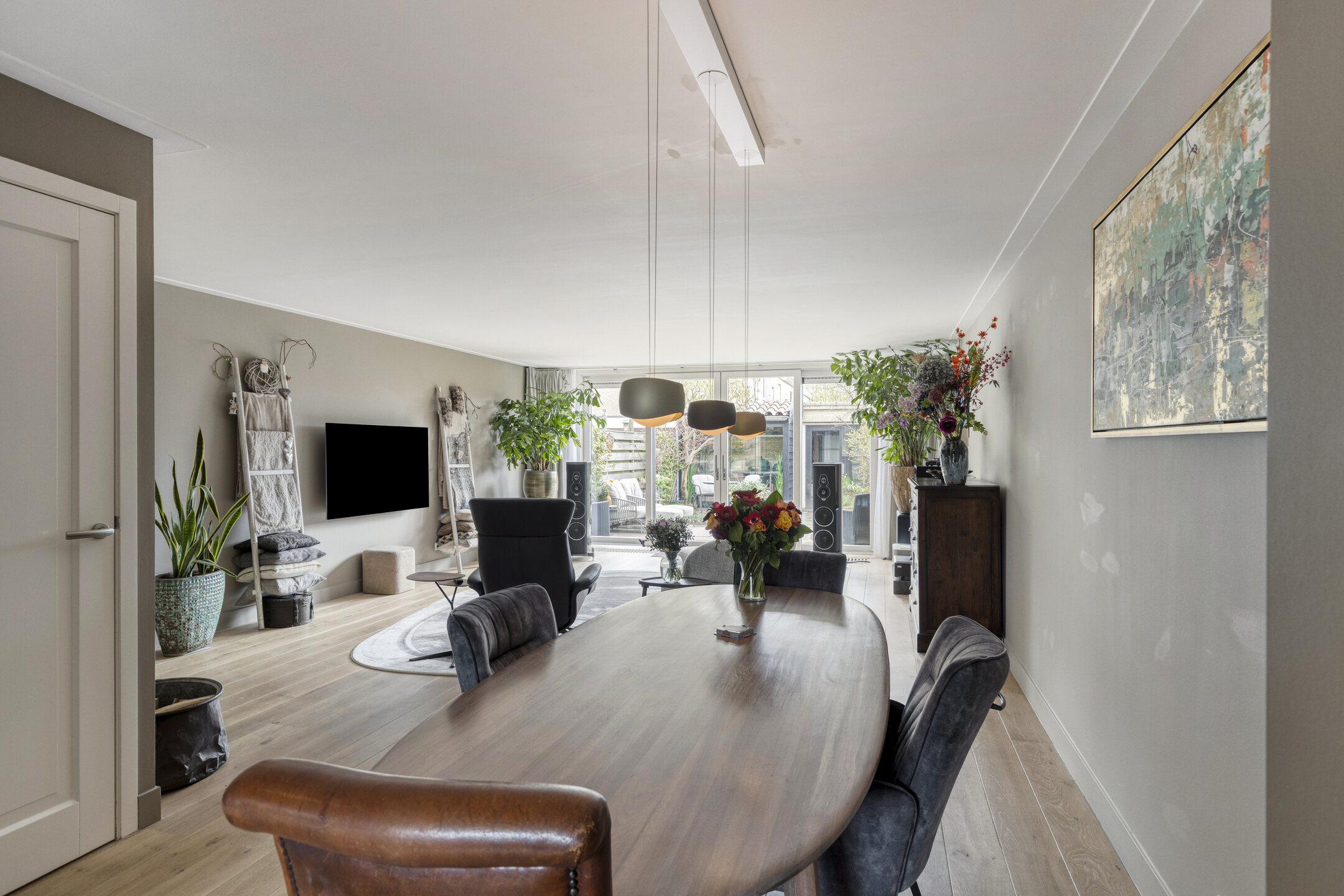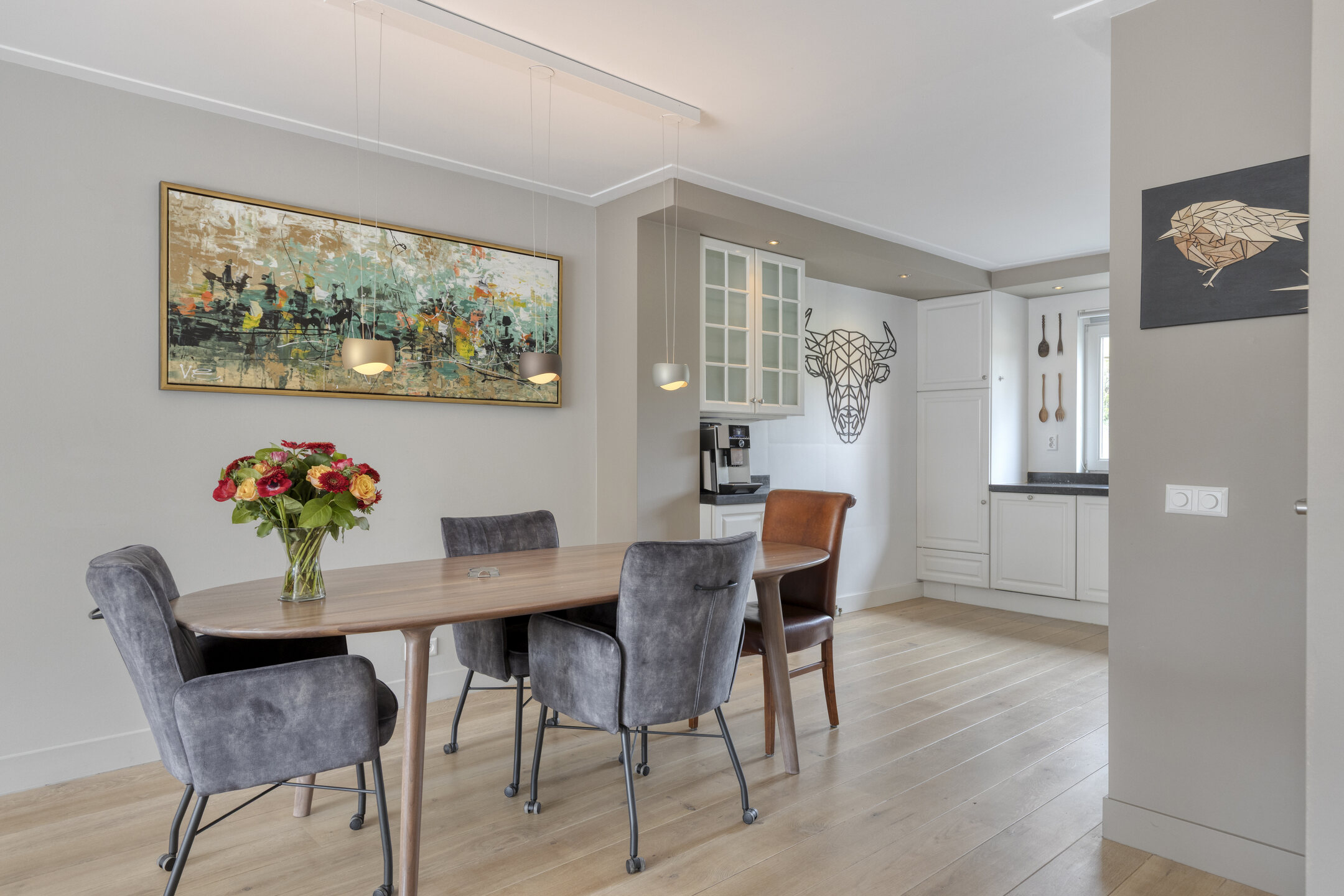 The living room with solid oak flooring forms the heart of the home. Thanks to its open layout and large windows, it enjoys plenty of natural light. There is ample space for a comfortable seating area and a cozy dining area. The sliding doors to the garden create a beautiful connection between indoor and outdoor living. The fireplace with mantel serves as an attractive focal point, making the space even more inviting.