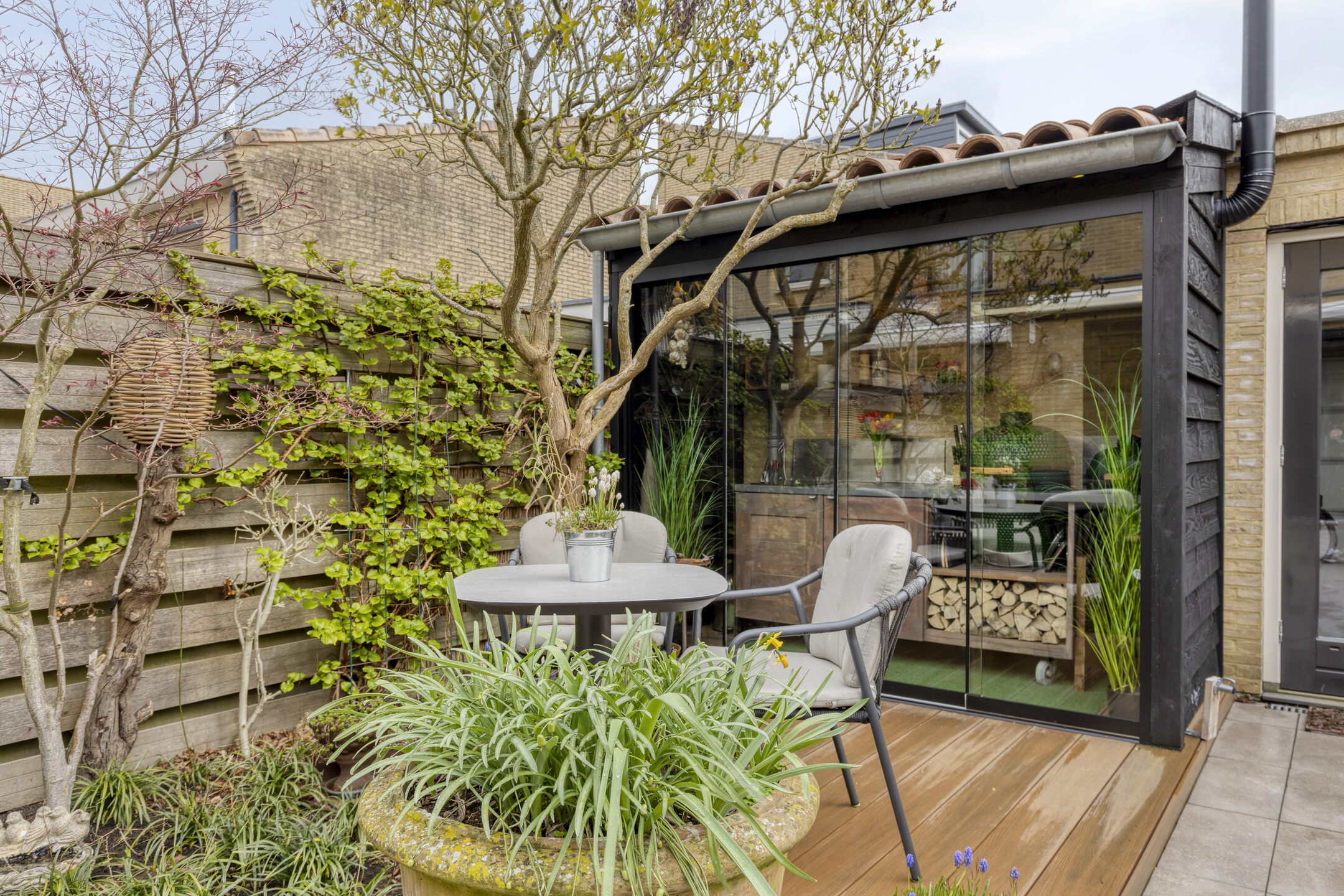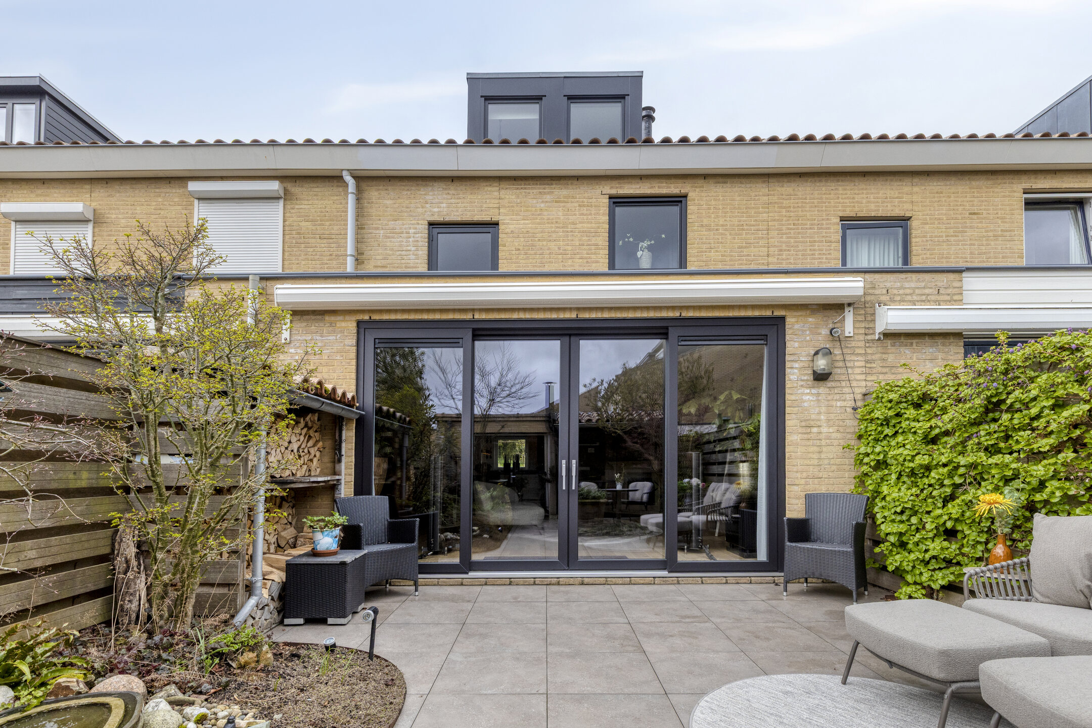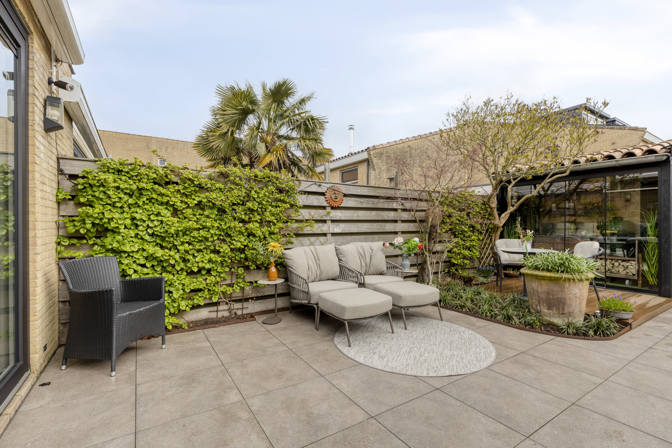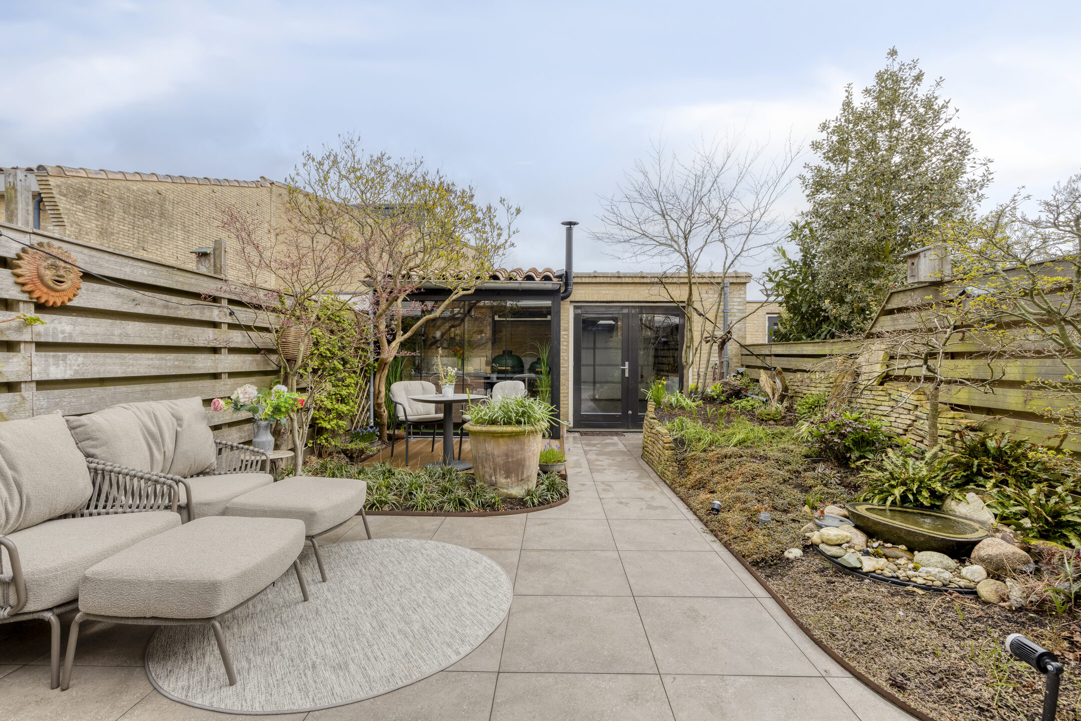 The backyard is a wonderful place to relax. It is open and sunny, with a combination of paving and greenery. There is plenty of space for a terrace where you can enjoy long summer days. The garden also includes a storage shed and a canopy, providing extra comfort and storage. The sunshade completes the space.