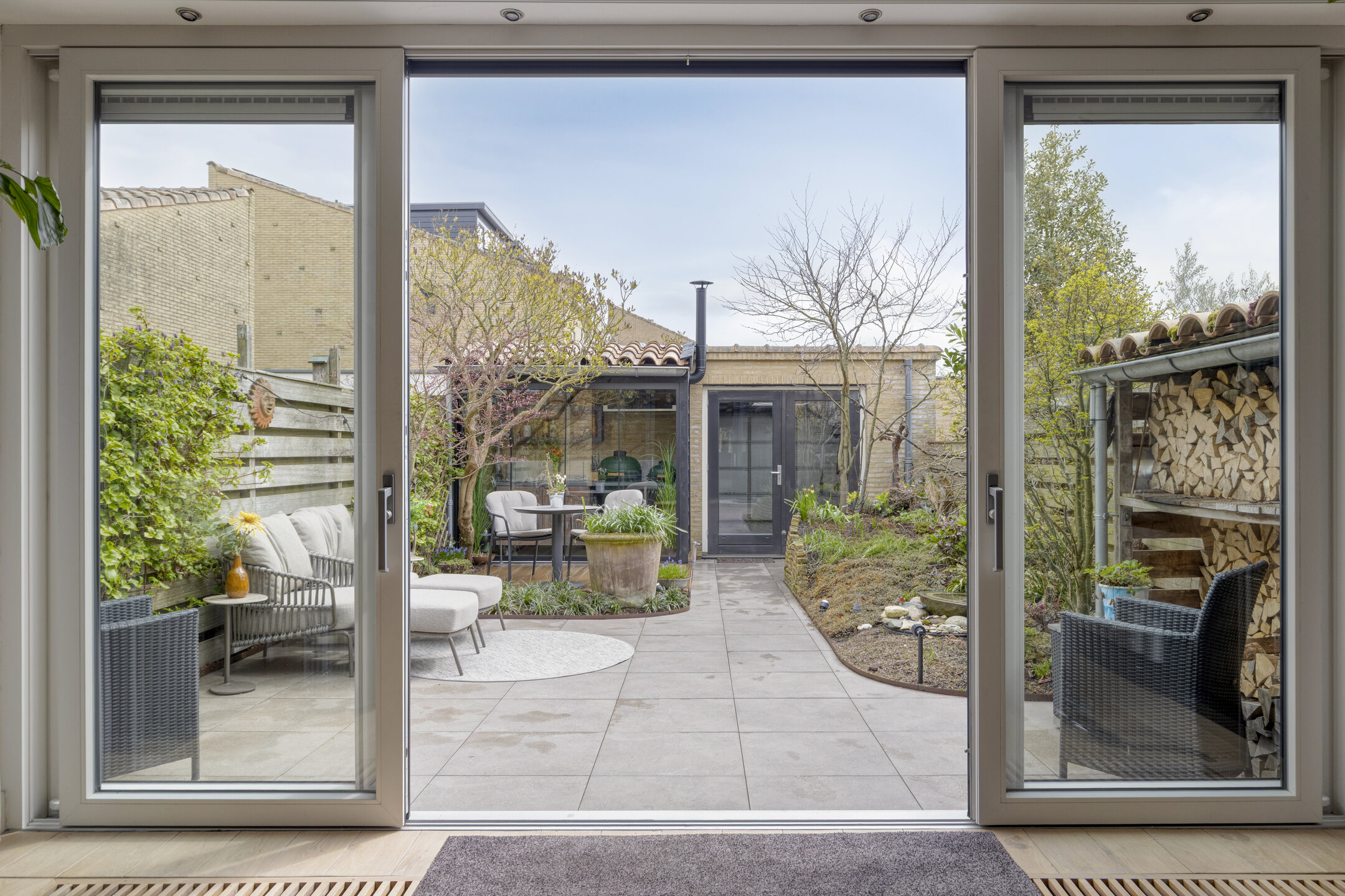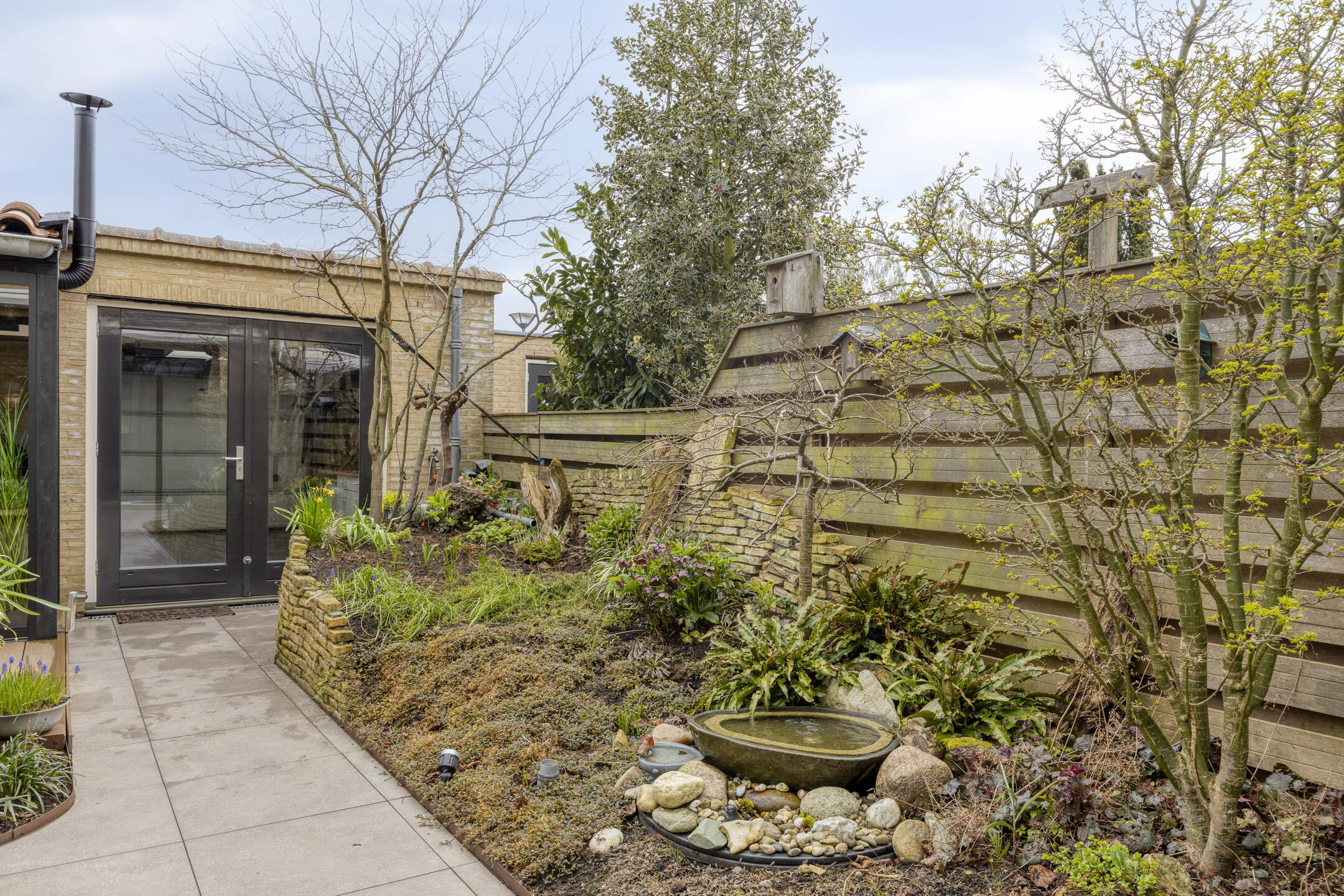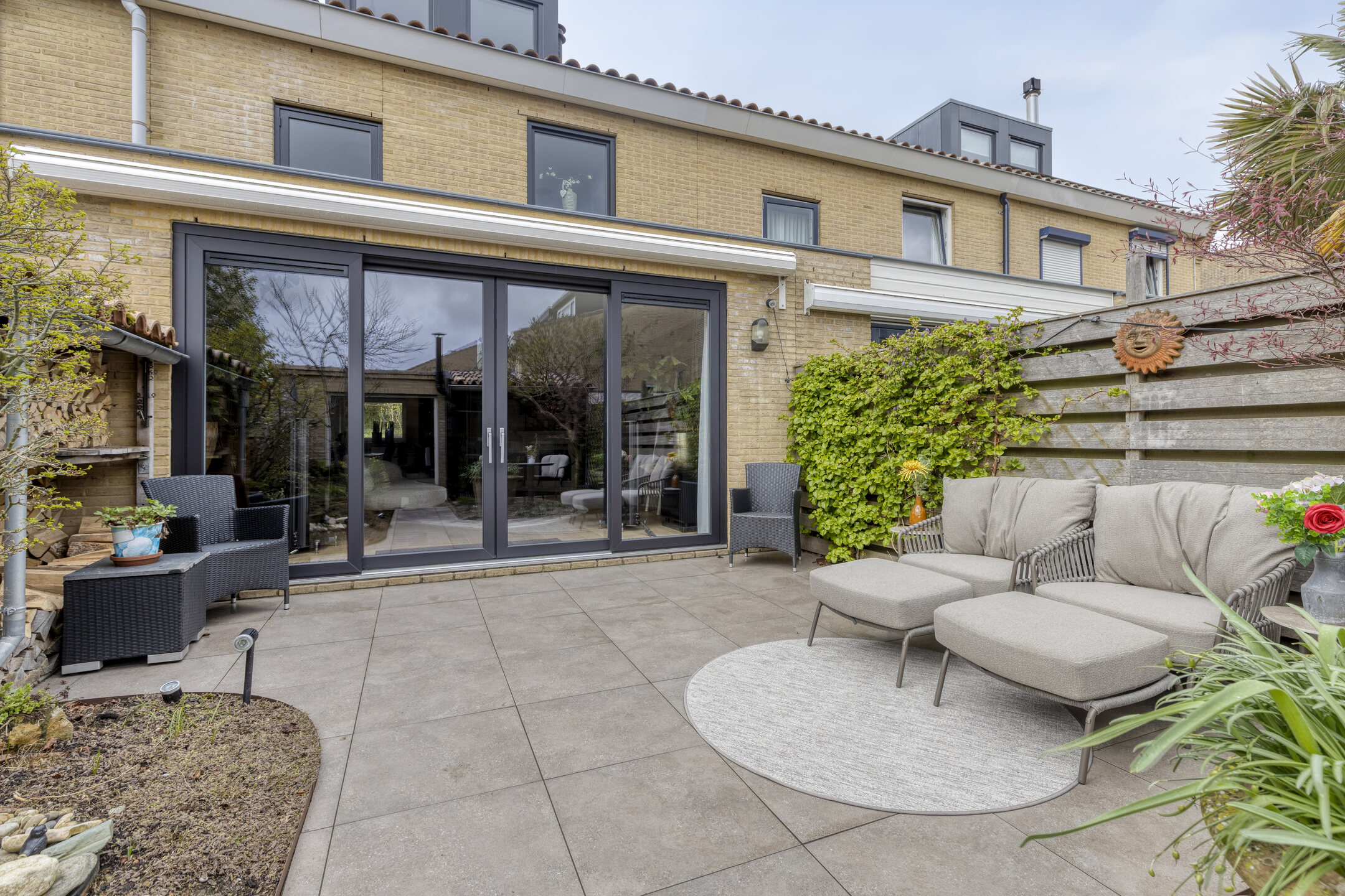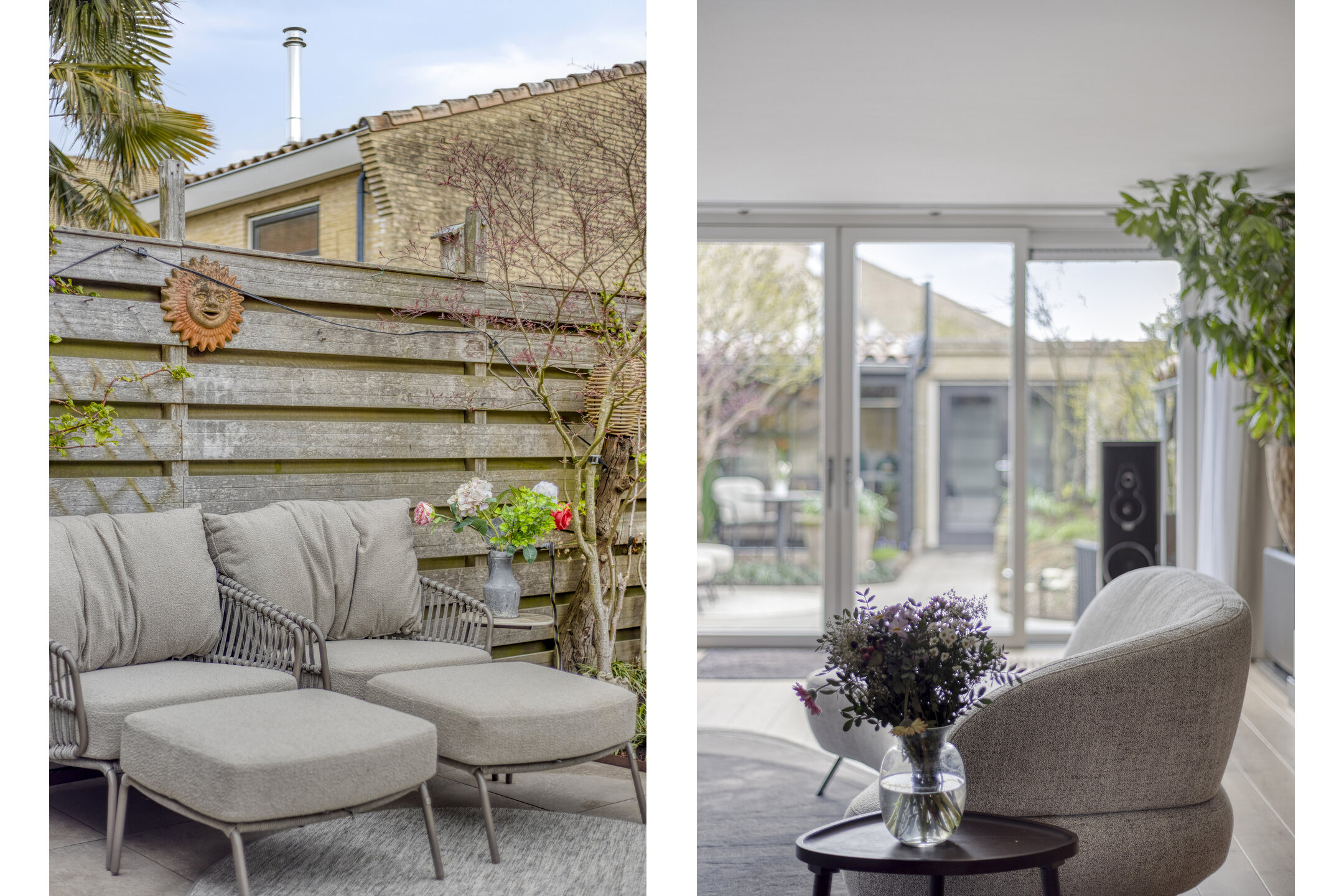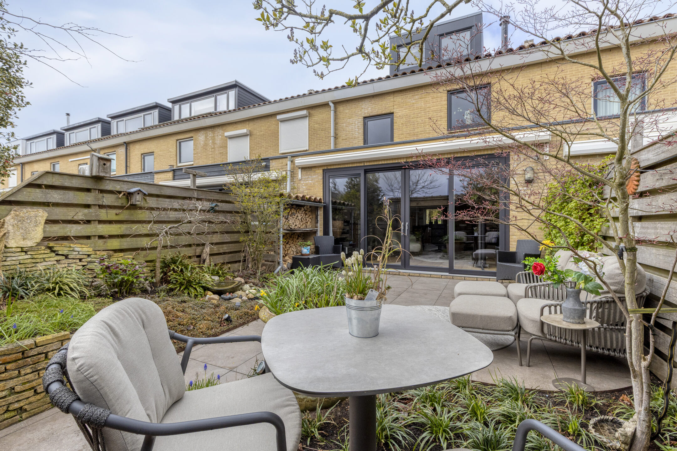 The backyard is a wonderful place to relax. It is open and sunny, with a combination of paving and greenery. There is plenty of space for a terrace where you can enjoy long summer days. The garden also includes a storage shed and a canopy, providing extra comfort and storage. The sunshade completes the space.
