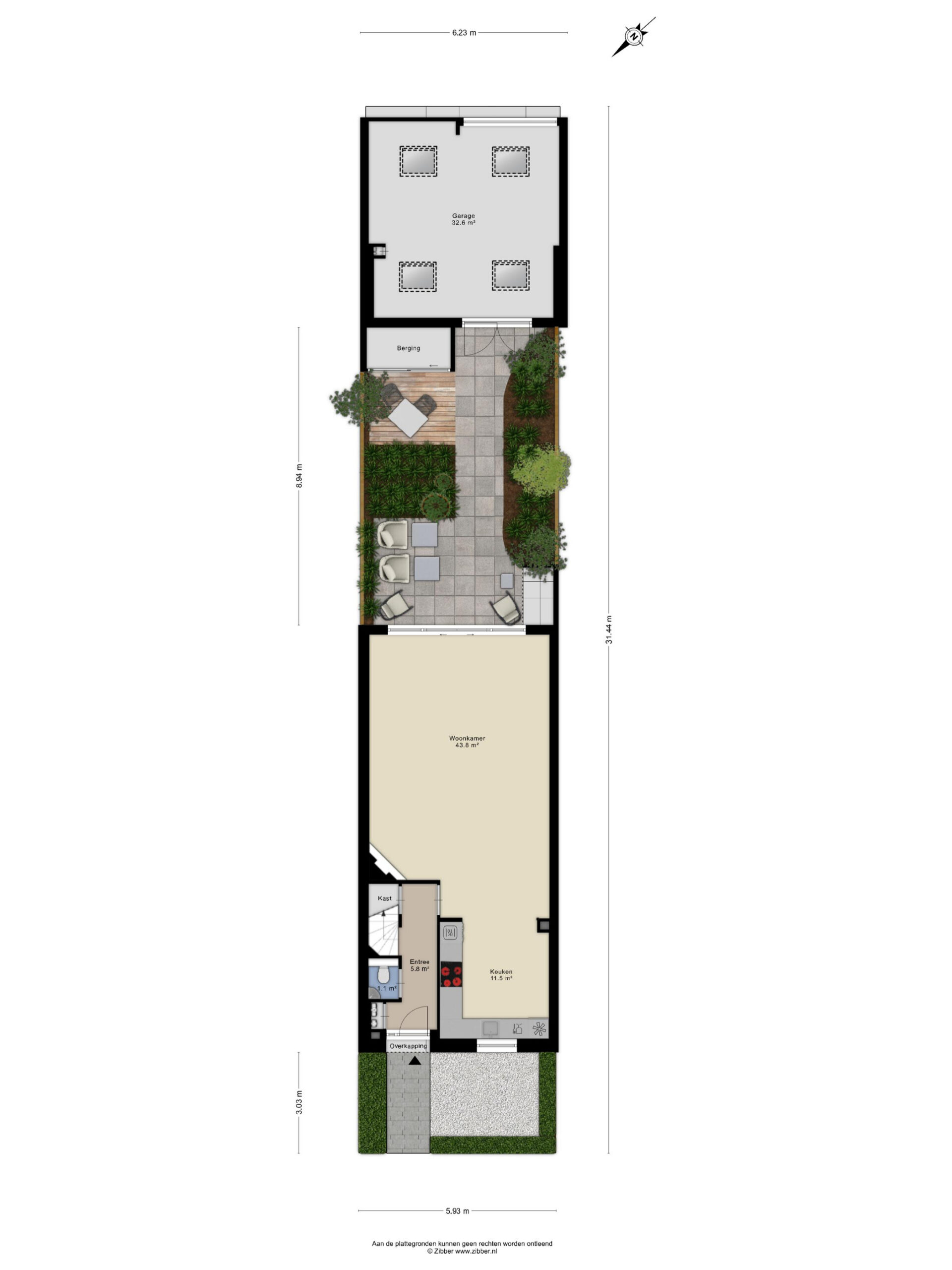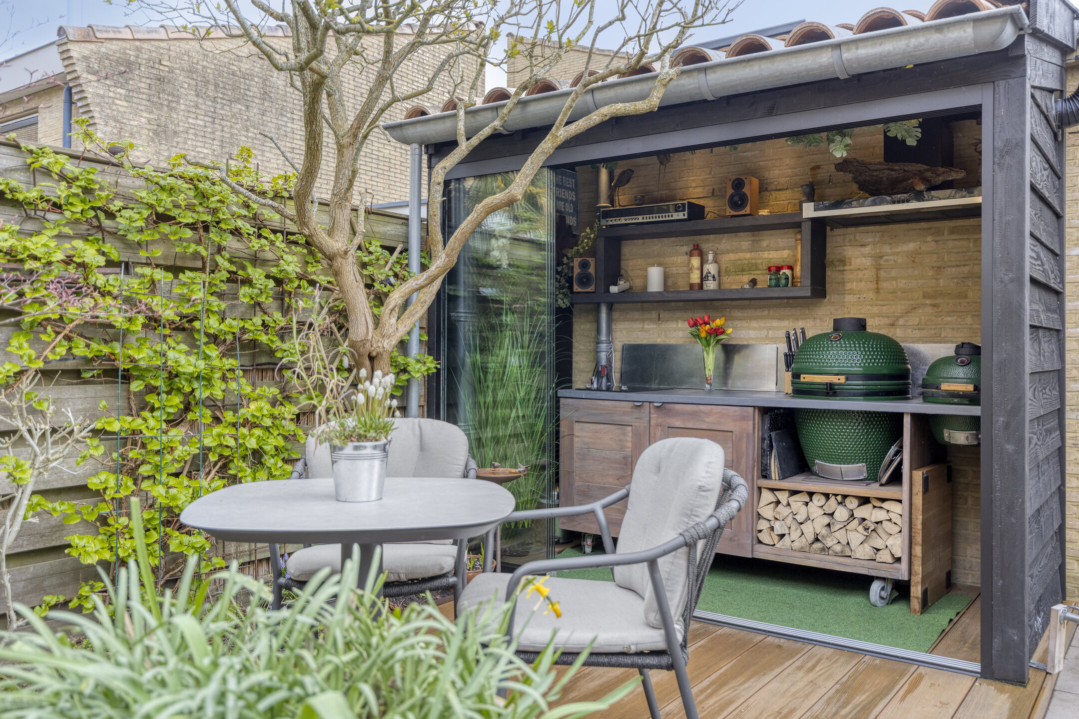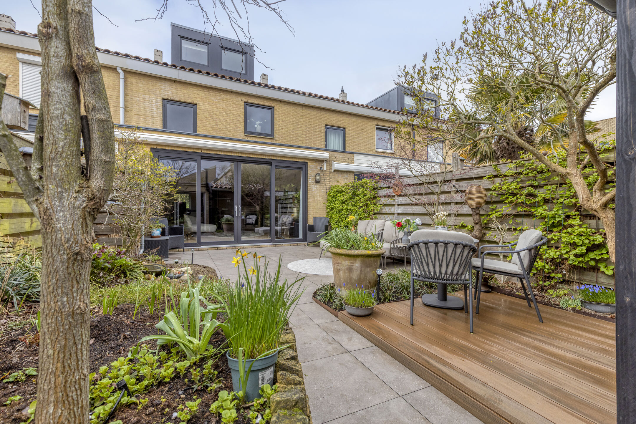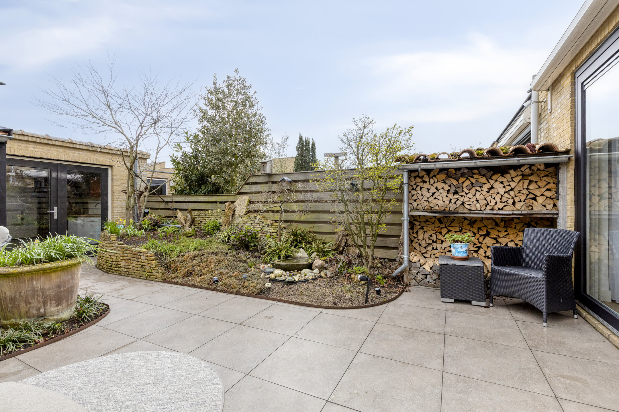 The backyard is a wonderful place to relax. It is open and sunny, with a combination of paving and greenery. There is plenty of space for a terrace where you can enjoy long summer days. The garden also includes a storage shed and a canopy, providing extra comfort and storage. The sunshade completes the space.