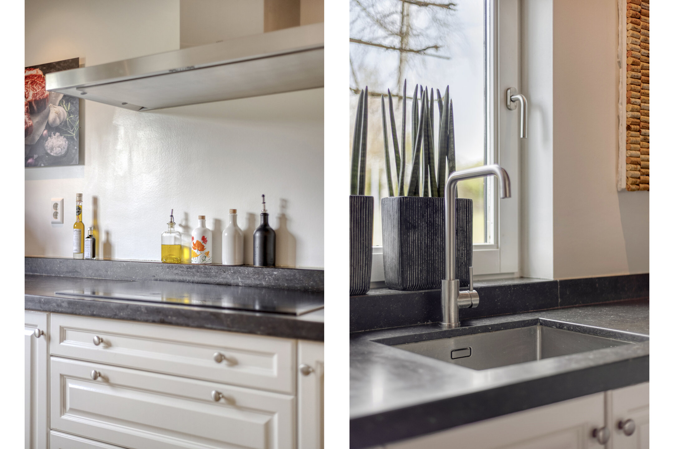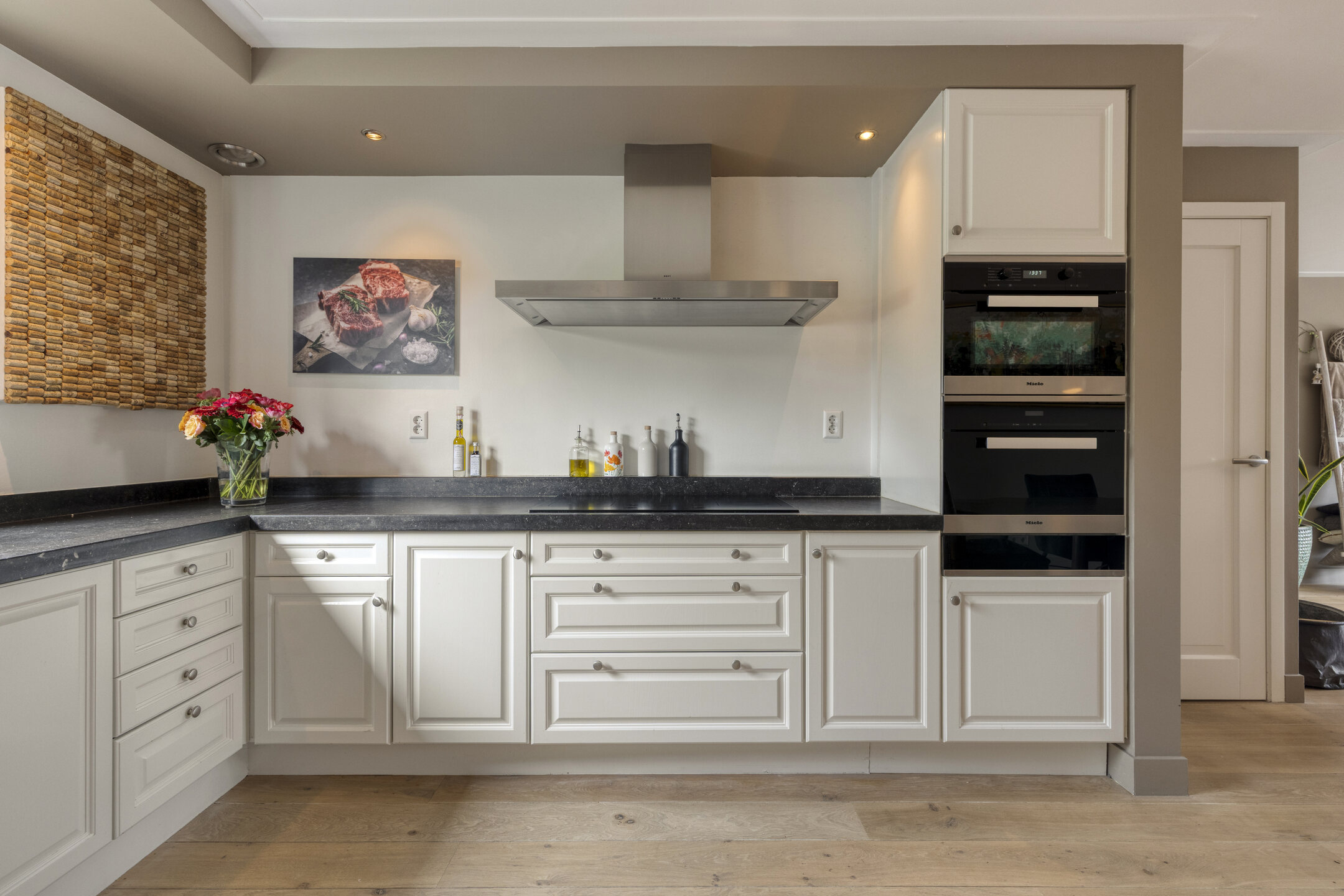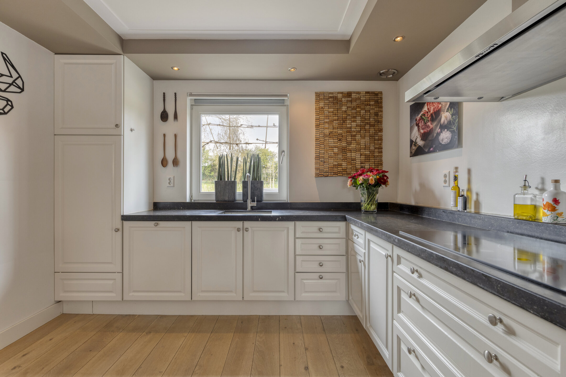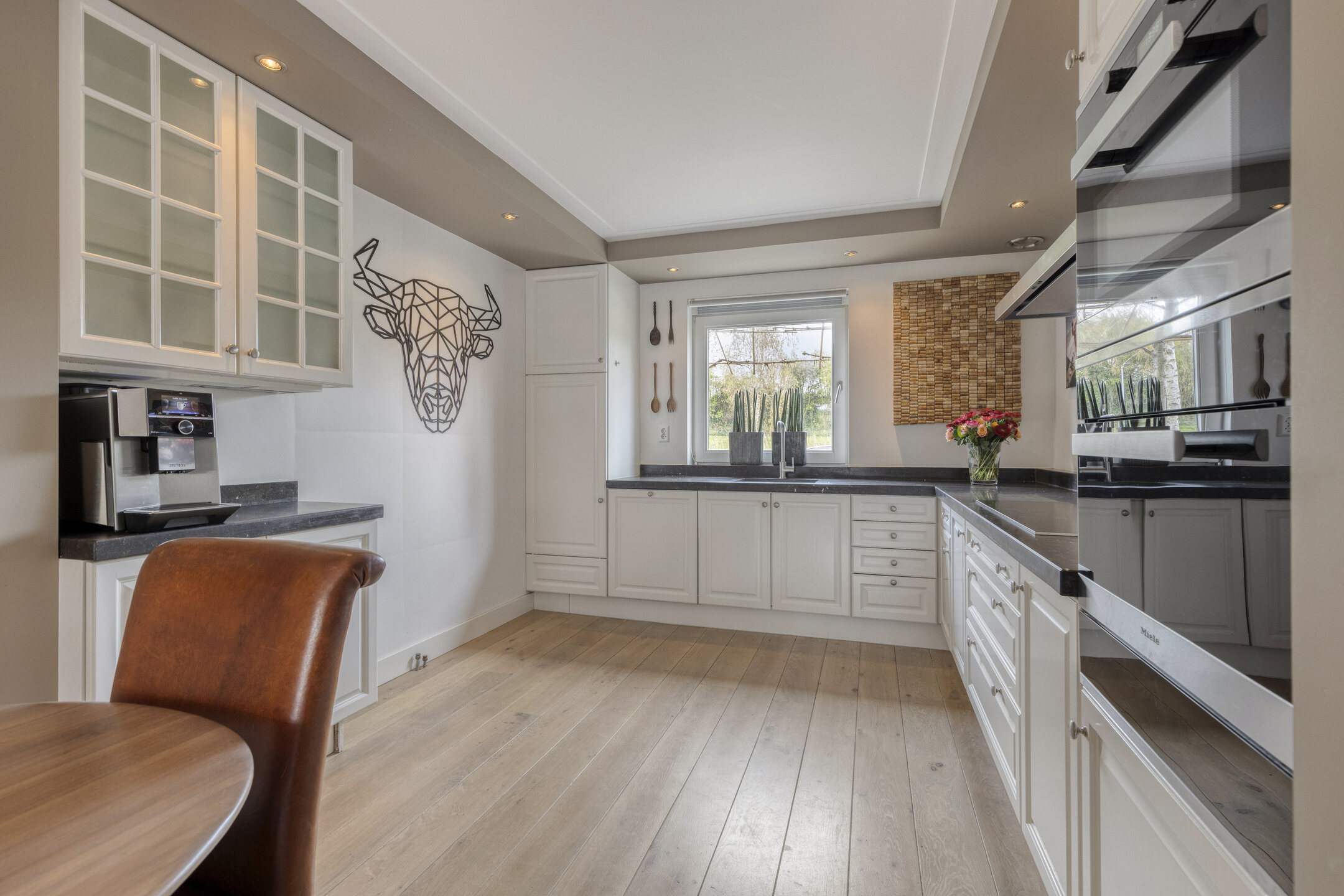 At the front of the house is the modern open kitchen. It is practically designed and equipped with all conveniences, including an induction cooktop with extractor hood, sink, dishwasher, and plenty of cabinet space. The kitchen also features a built-in oven combination and refrigerator. A move-in-ready kitchen where you can enjoy cooking and gathering.