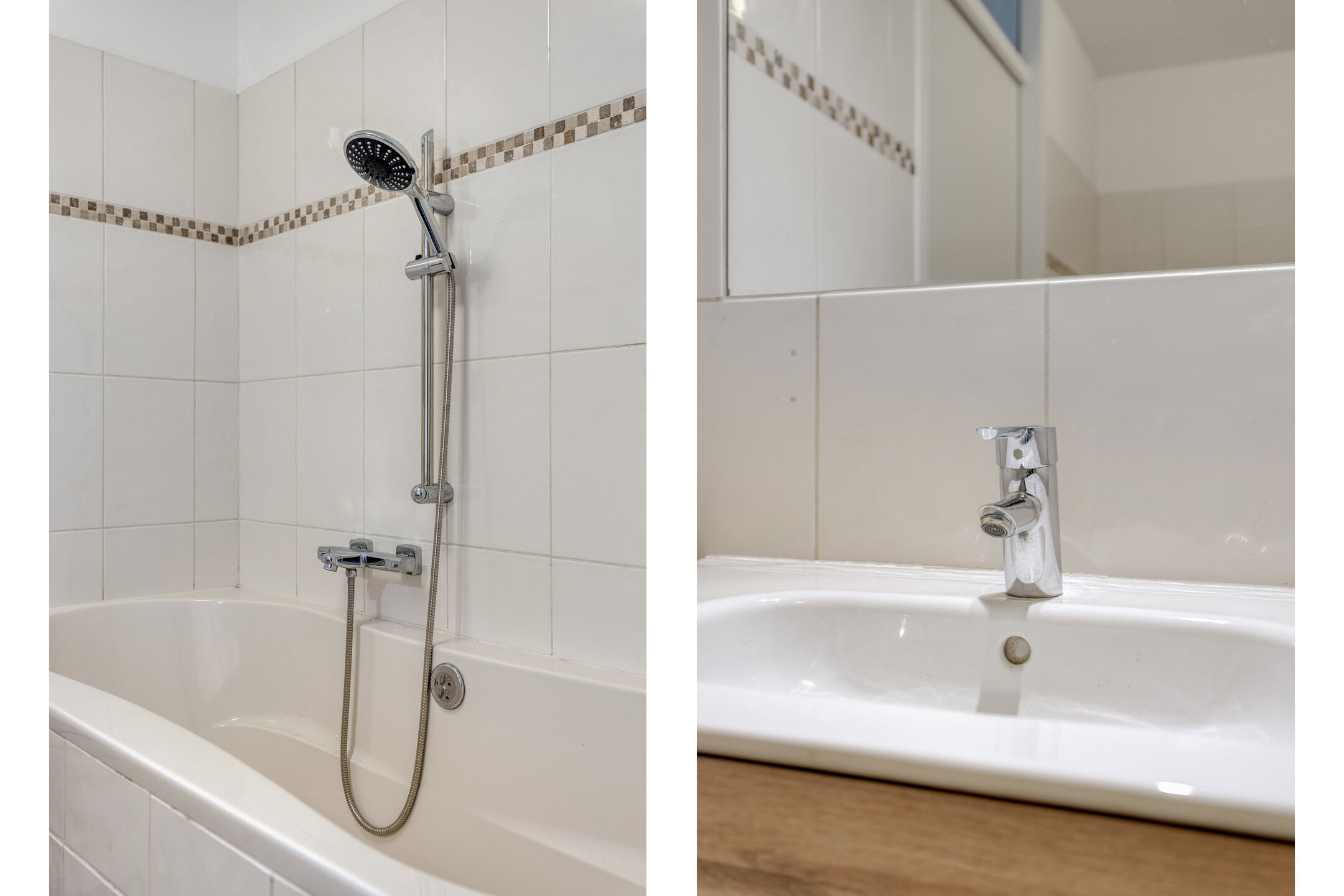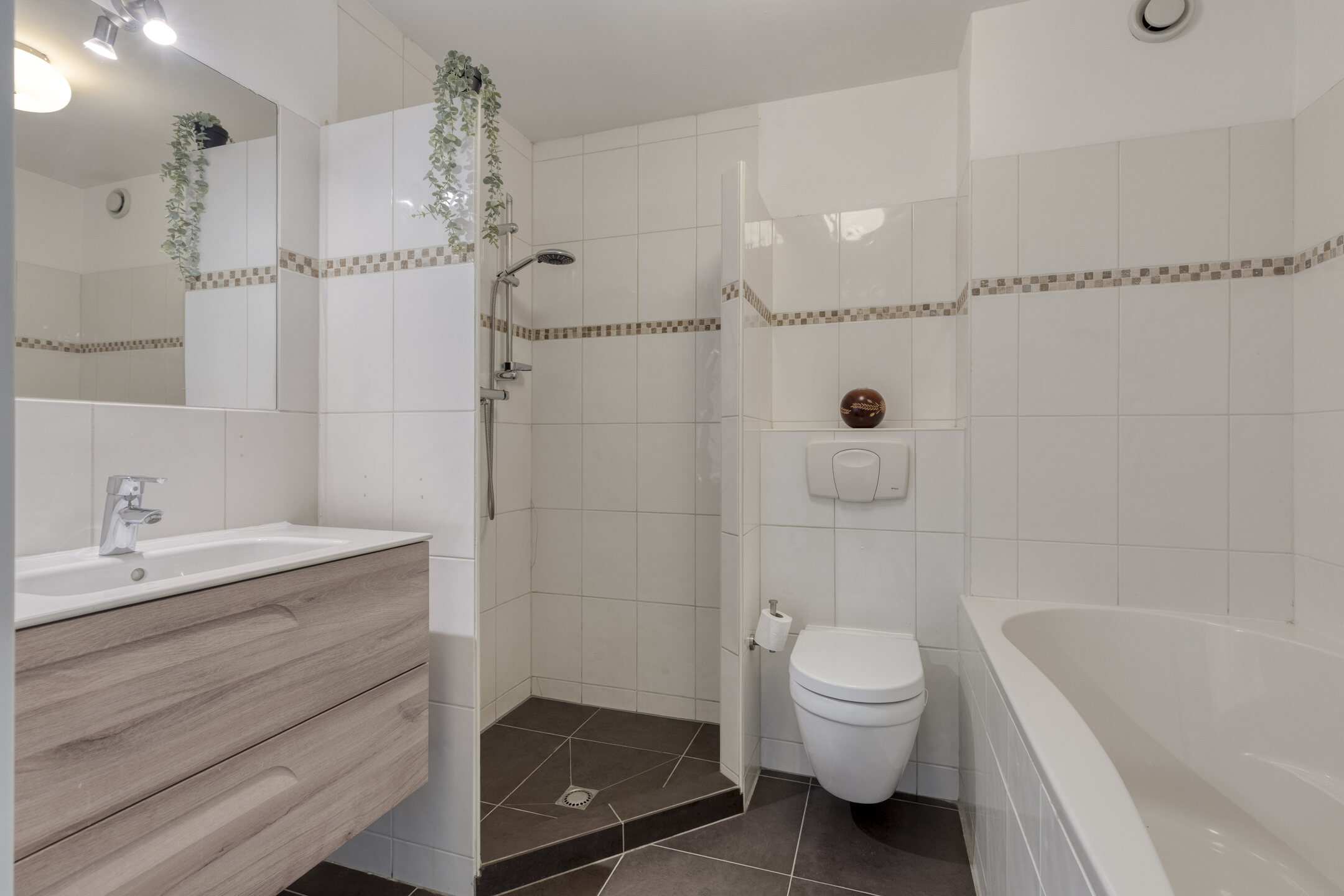 The bathroom is fully tiled and practically designed. It features a spacious bathtub, a shower, a sink with mirror and storage unit and a wall-mounted toilet. The bathroom is well maintained but also offers the opportunity to modernize according to your own taste.