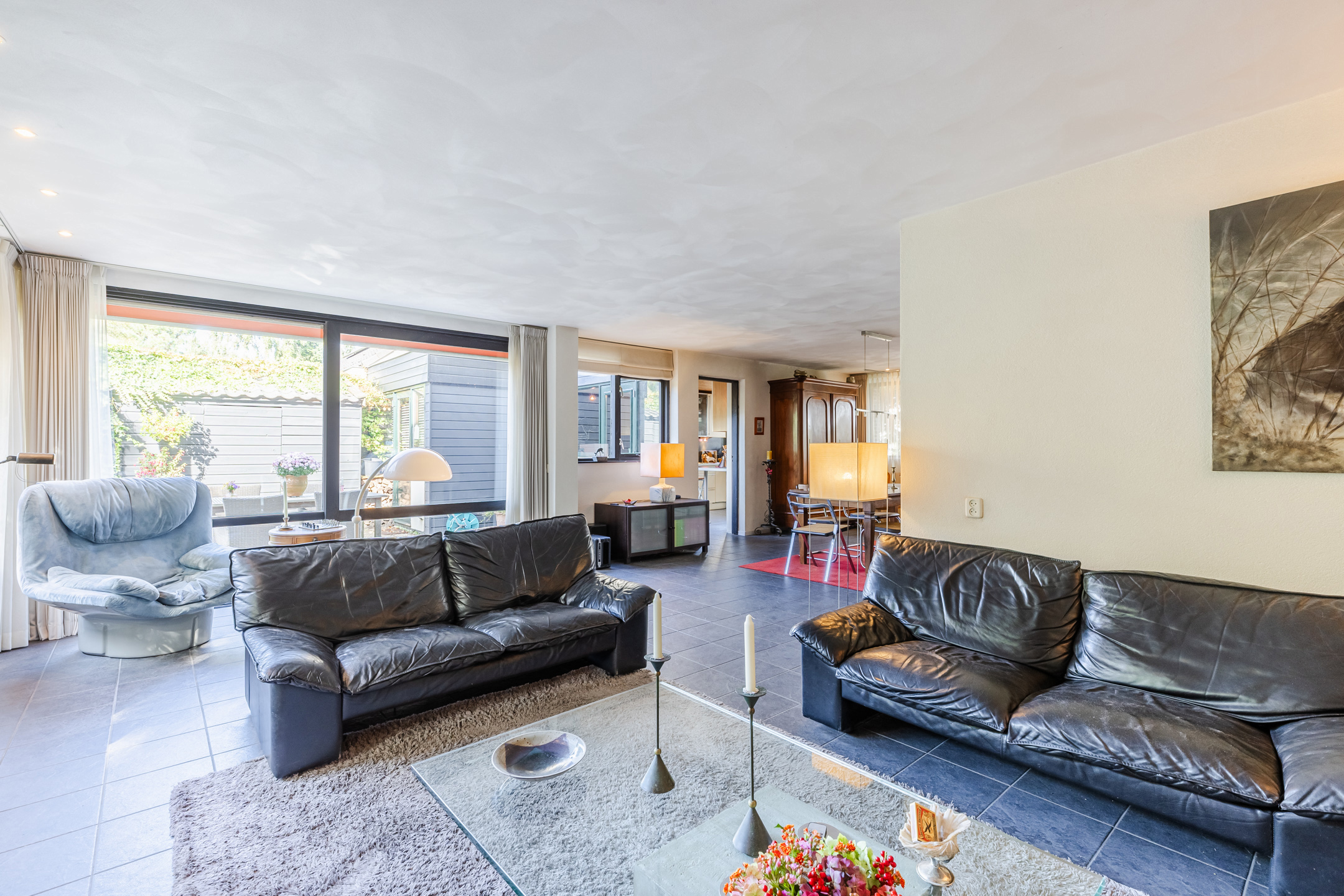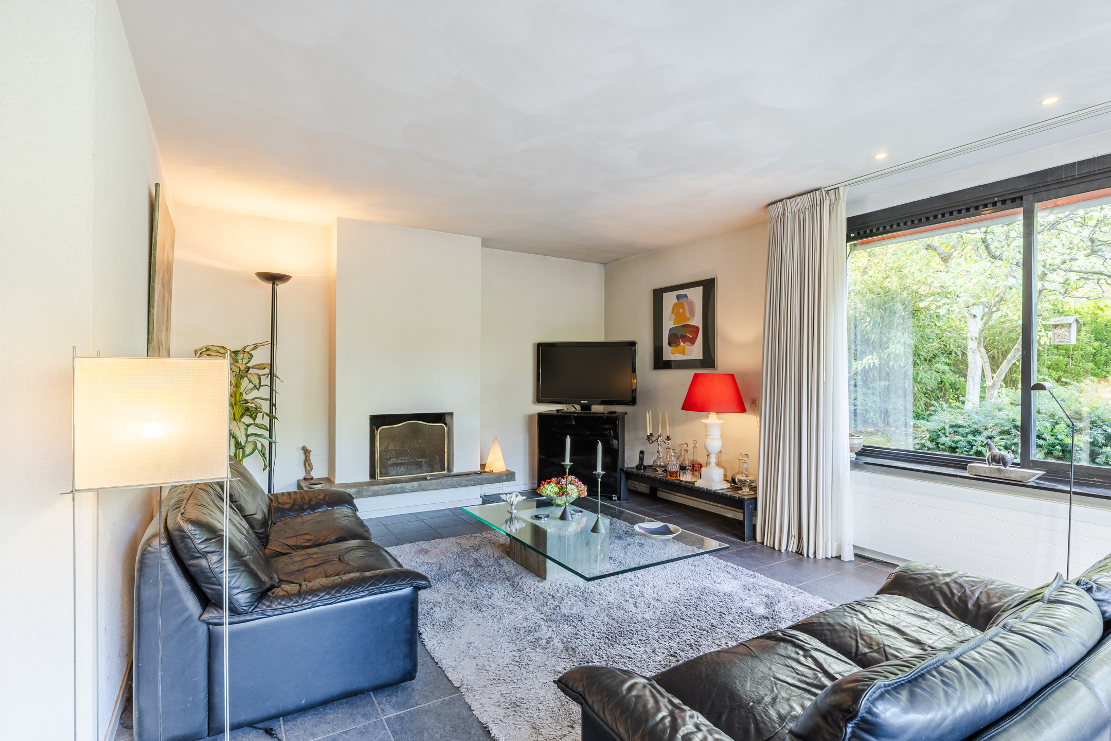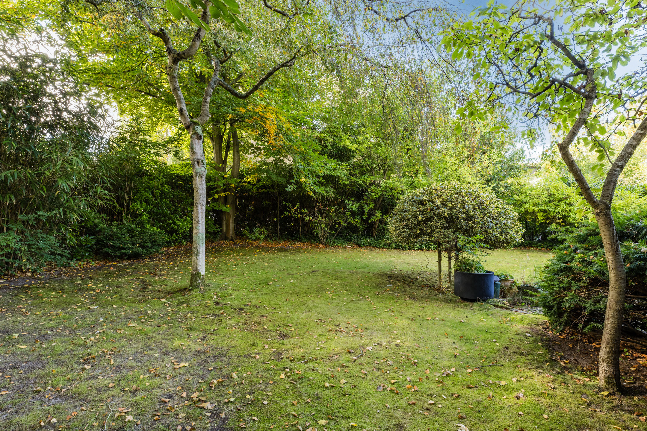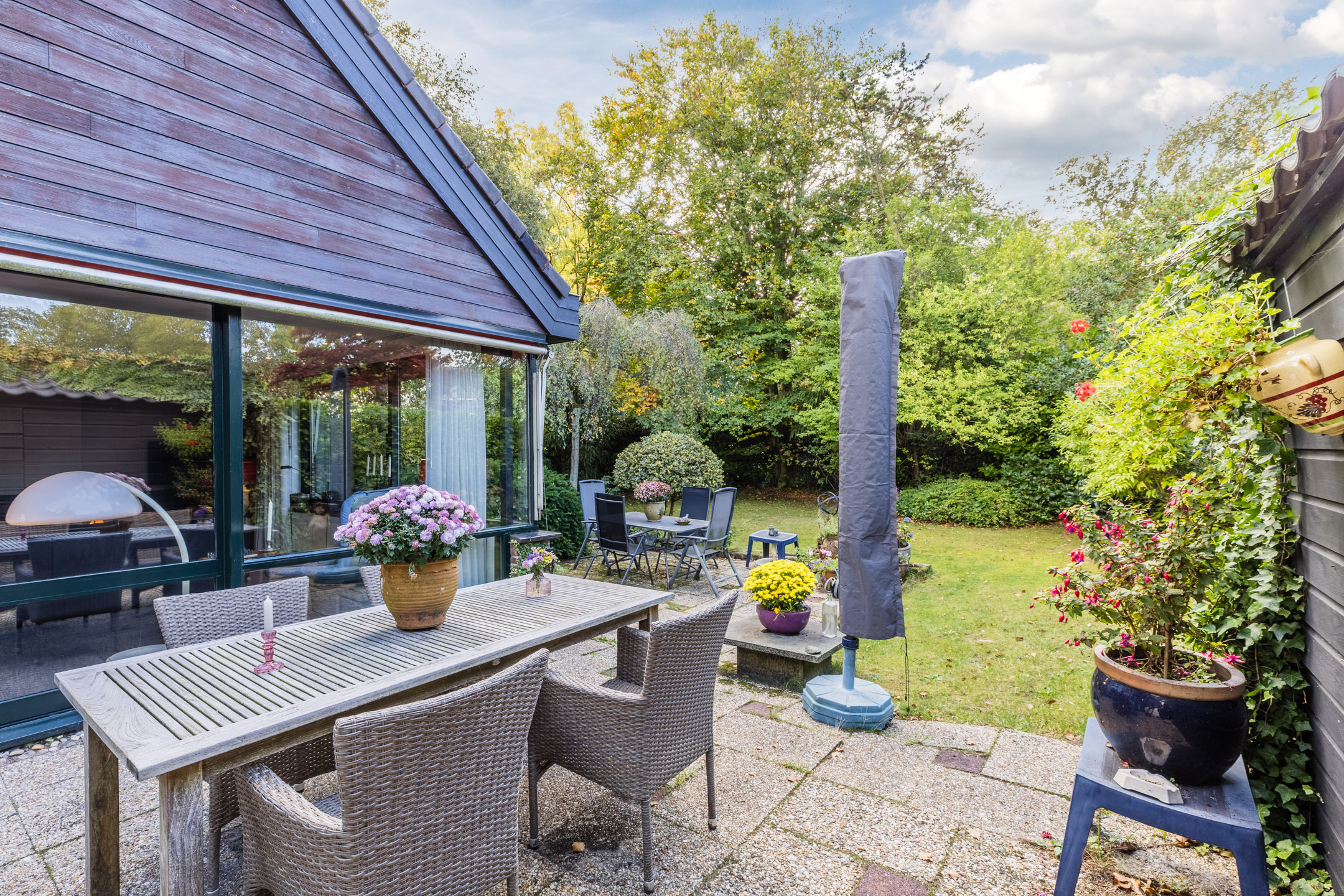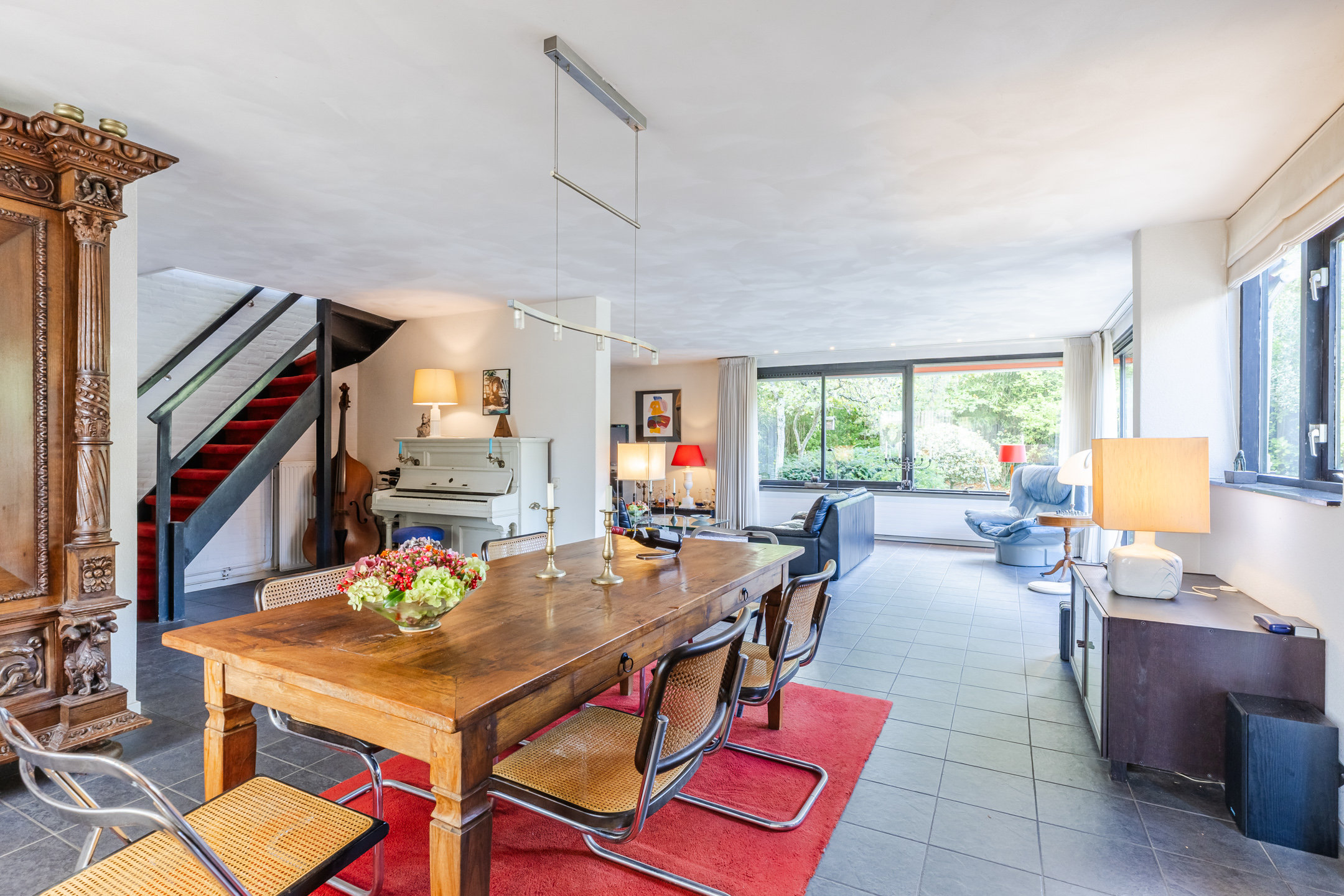 The house stands on a spacious plot with a large, green garden surrounding the house. There are several tiled terraces, beautifully landscaped green borders, grass and tall trees. The sheltered location and park-like layout of the garden ensure that you can enjoy the outdoors in complete privacy.