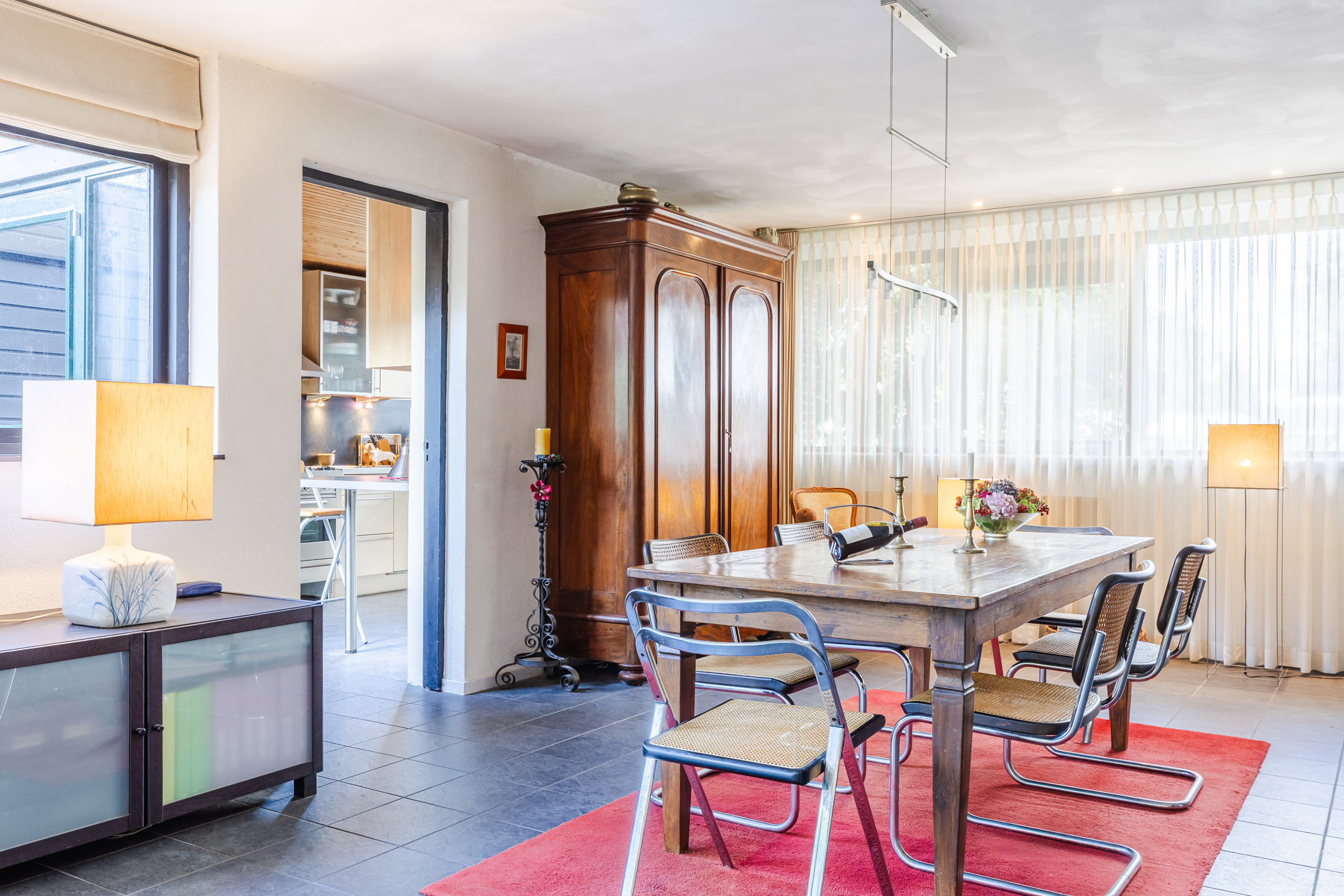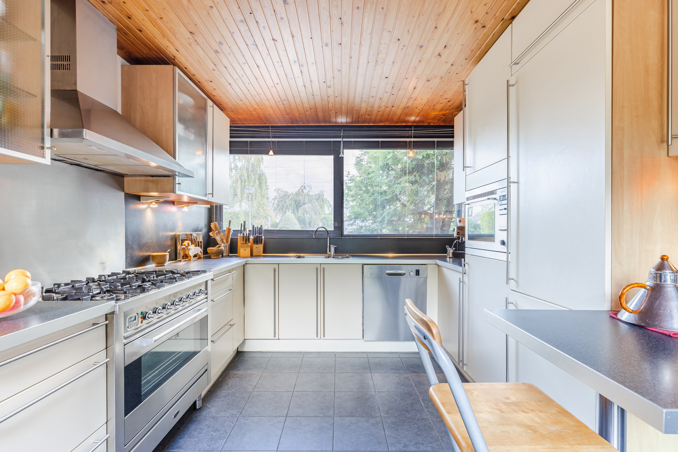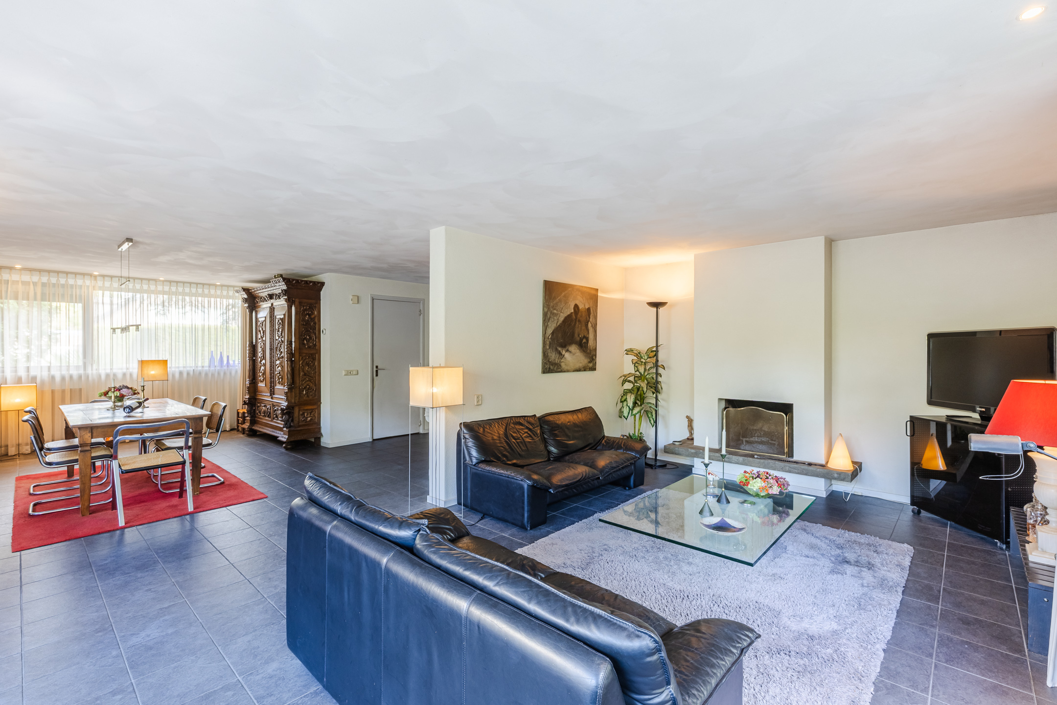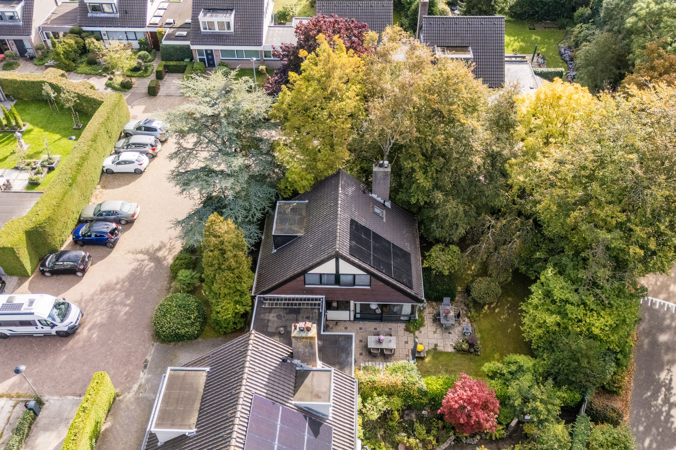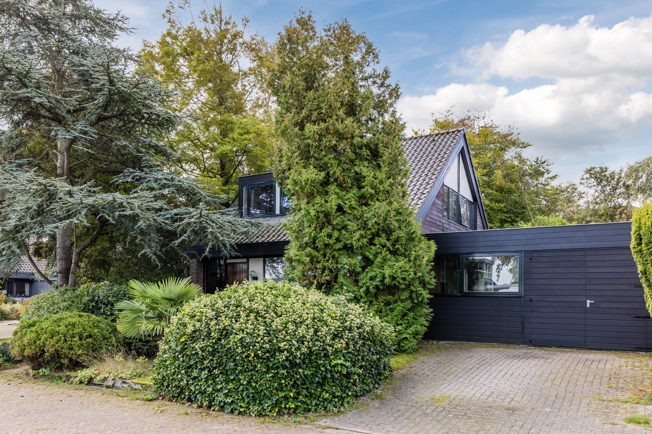 The house stands on a spacious plot with a large, green garden surrounding the house. There are several tiled terraces, beautifully landscaped green borders, grass and tall trees. The sheltered location and park-like layout of the garden ensure that you can enjoy the outdoors in complete privacy.