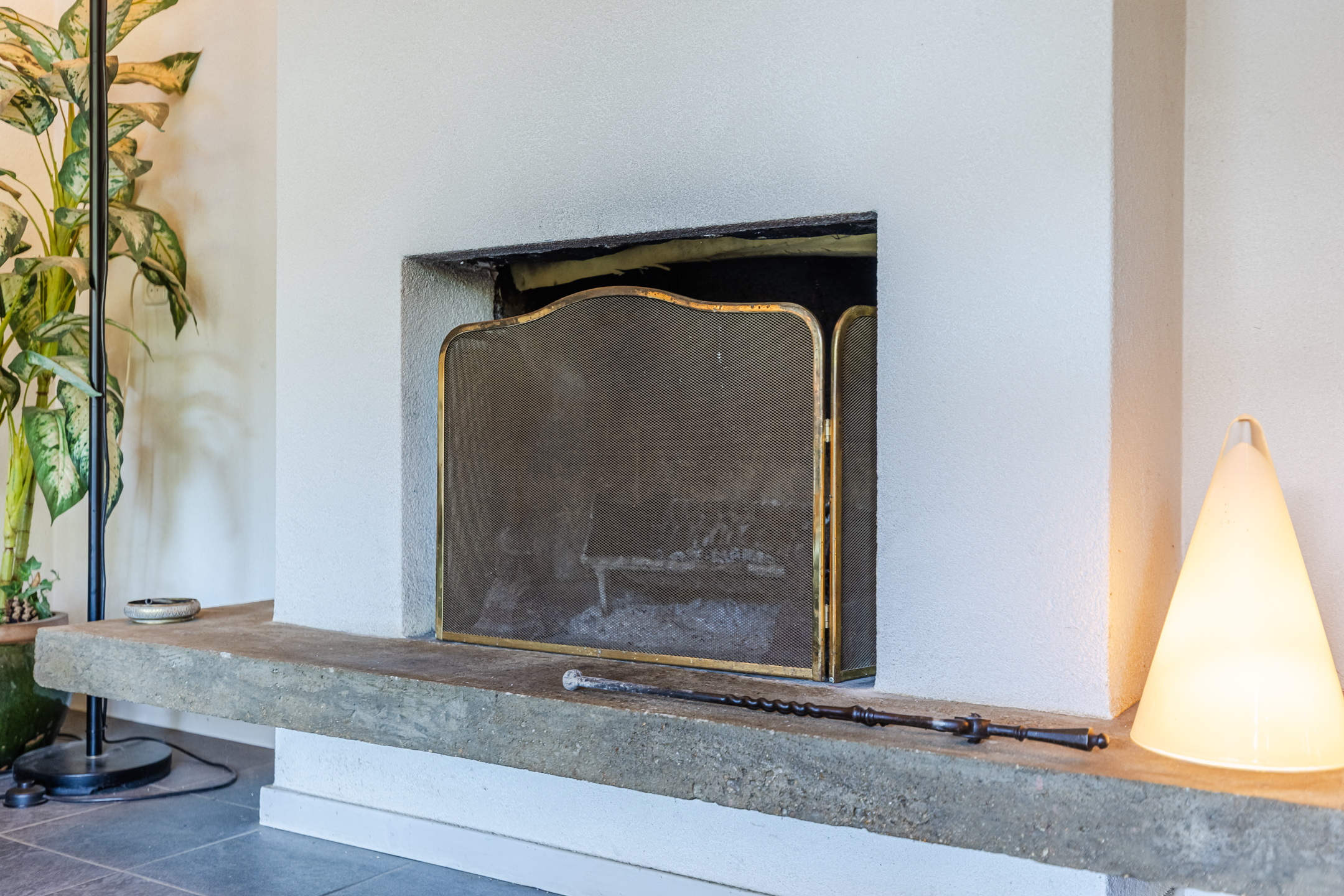 Large, sunny living room with large windows along 3 sides, a sliding door and a fireplace
