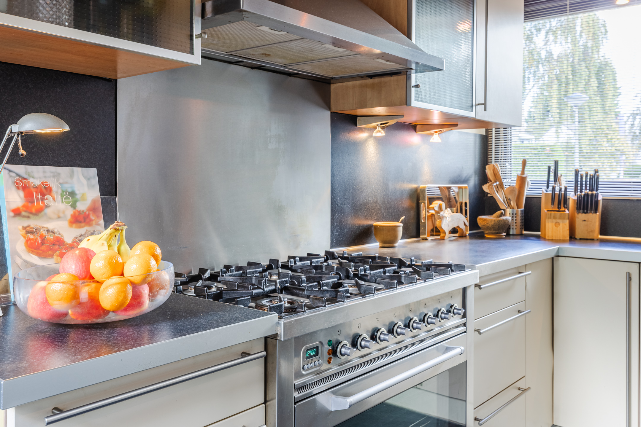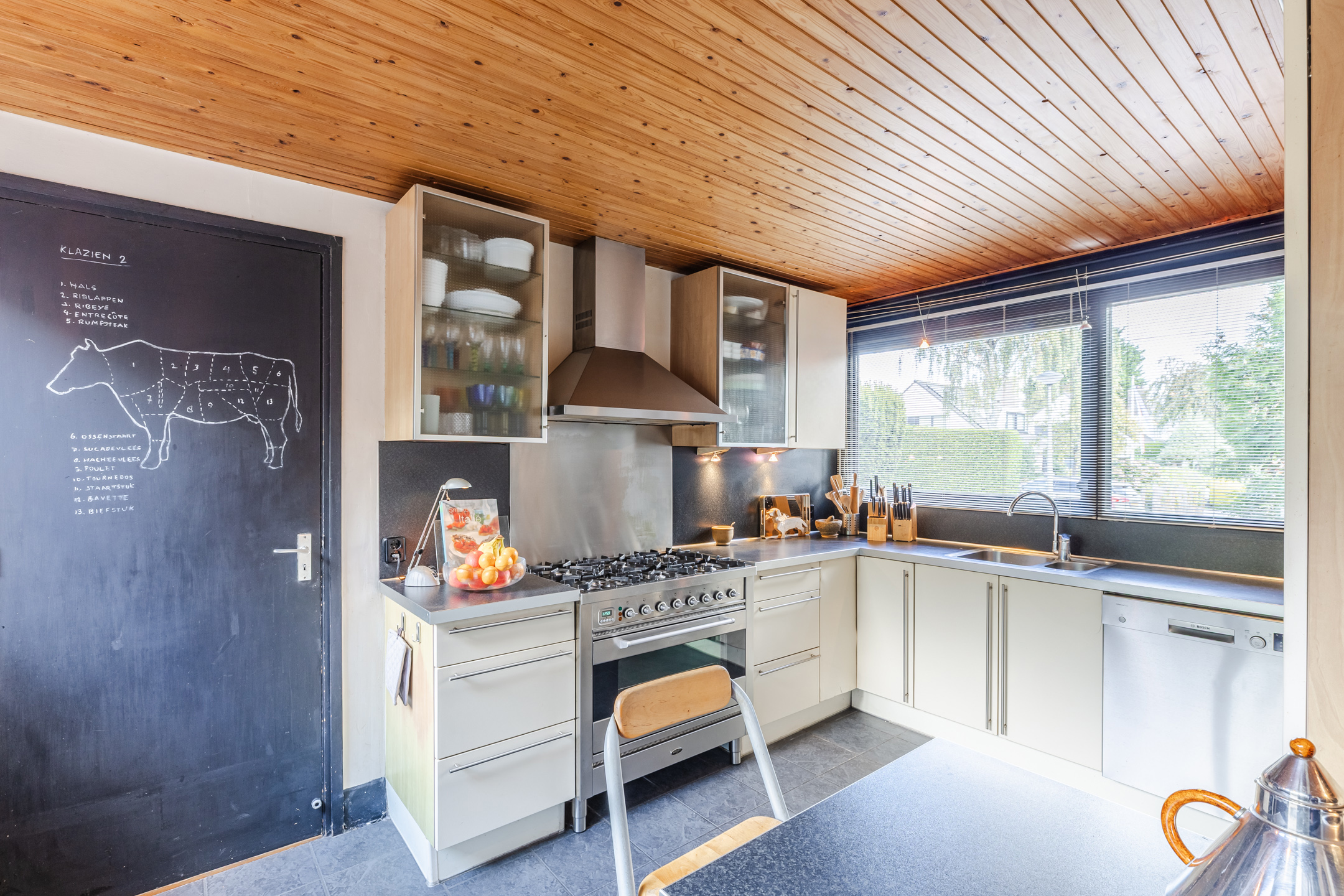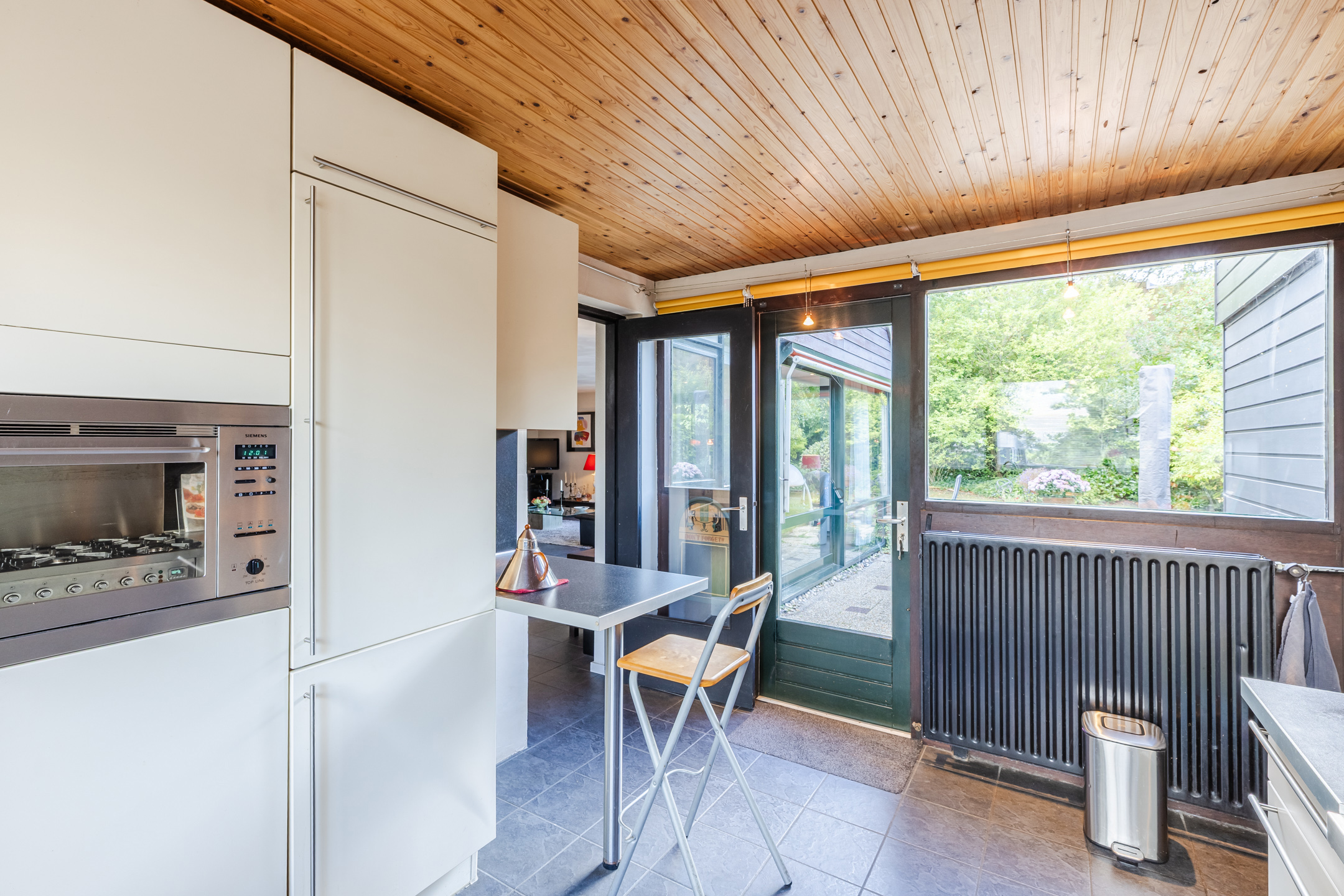 Enclosed kitchen with a gas stove (6 burners) with oven, fridge, freezer and a dishwasher. In the kitchen there is a back door to the garden and indoor access to the garage.