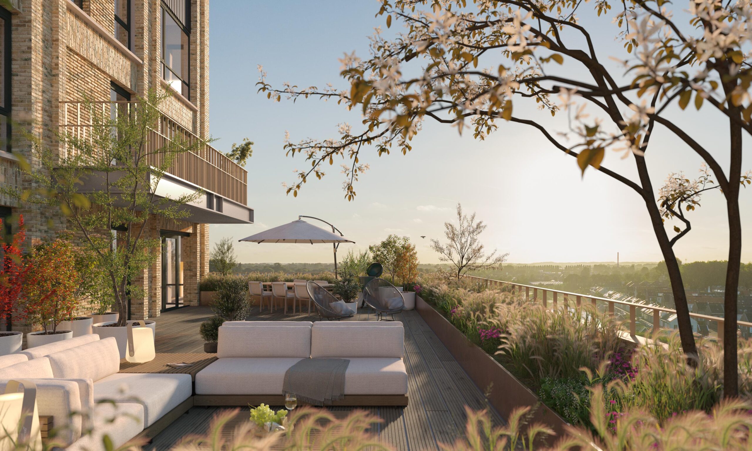 De ruime living heeft een oppervlakte van circa 37 m2 en biedt ruimte voor een woonkeuken met kookeiland. En door de vele raampartijen aan twee zijdes geeft dit een heerlijk licht en ruimtelijk gevoel. Via de twee openslaande deuren loop je vanuit de living het riante dakterras op van ruim 90 m2 en biedt volop mogelijkheden voor tuinliefhebbers en te loungen met prachtige vergezichten. Het terras wordt rondom voorzien van beplanting voor direct een groene uitstraling. Vanuit de hoofdslaapkamer bereik je ook via twee openslaande deuren het terras, om je dag te kunnen starten met een kop koffie en croissant in de ochtendzon.