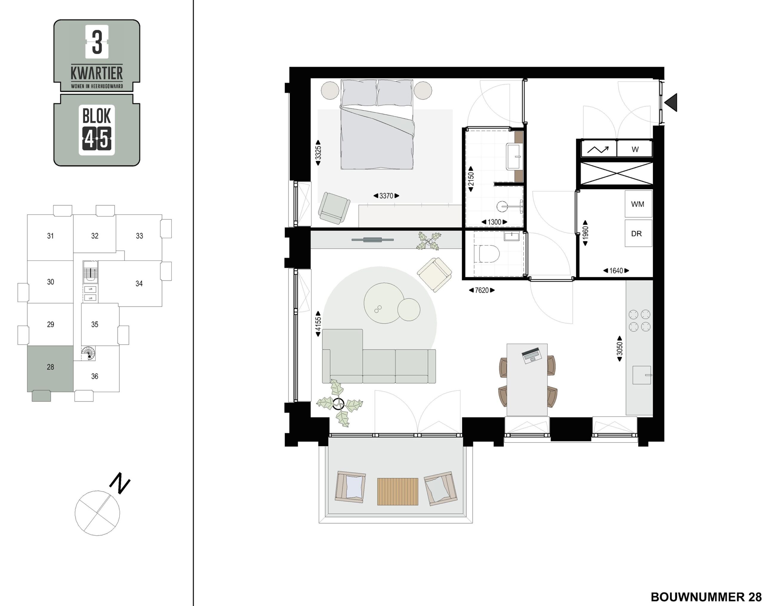 Bouwnummer 28 is een prachtig 3-kamer hoekappartement en gelegen op de 5e verdieping in BLOK45 met zicht op de rijk beplante binnentuin. Het appartement met een woonoppervlakte van 58,5 m2 heeft 2 slaapkamers. De buitenruimte van 5 m2 op het zuidoosten (bij bouwnummer 1, 10, 19 en 28) en op het zuidwesten (bij bouwnummer 37, 46 en 52) is via de ruime living te bereiken. De living geeft een licht en ruimtelijk gevoel door de vele raampartijen.