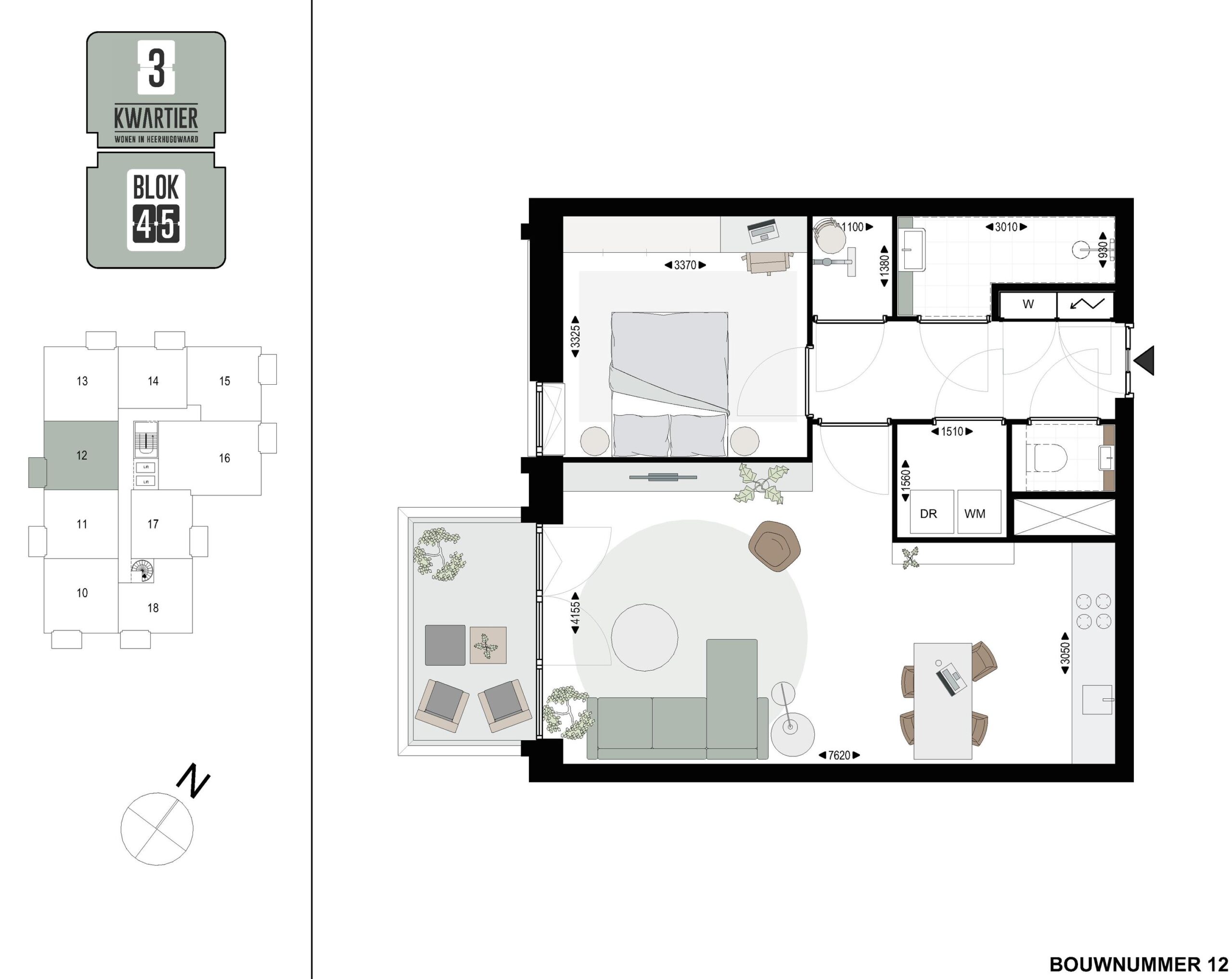 Bouwnummer 12 is een tussen 3-kamerappartement en gelegen op de 3e verdieping in BLOK45. Het appartement heeft een woonoppervlakte van 58,3 m2, 1 slaapkamer en ruimte voor een werk of hobby-kamer. De buitenruimte van 5 m2 op het zuidwesten is via de ruime living te bereiken. (Of er kan ook gekozen worden voor 1 grote slaapkamer)