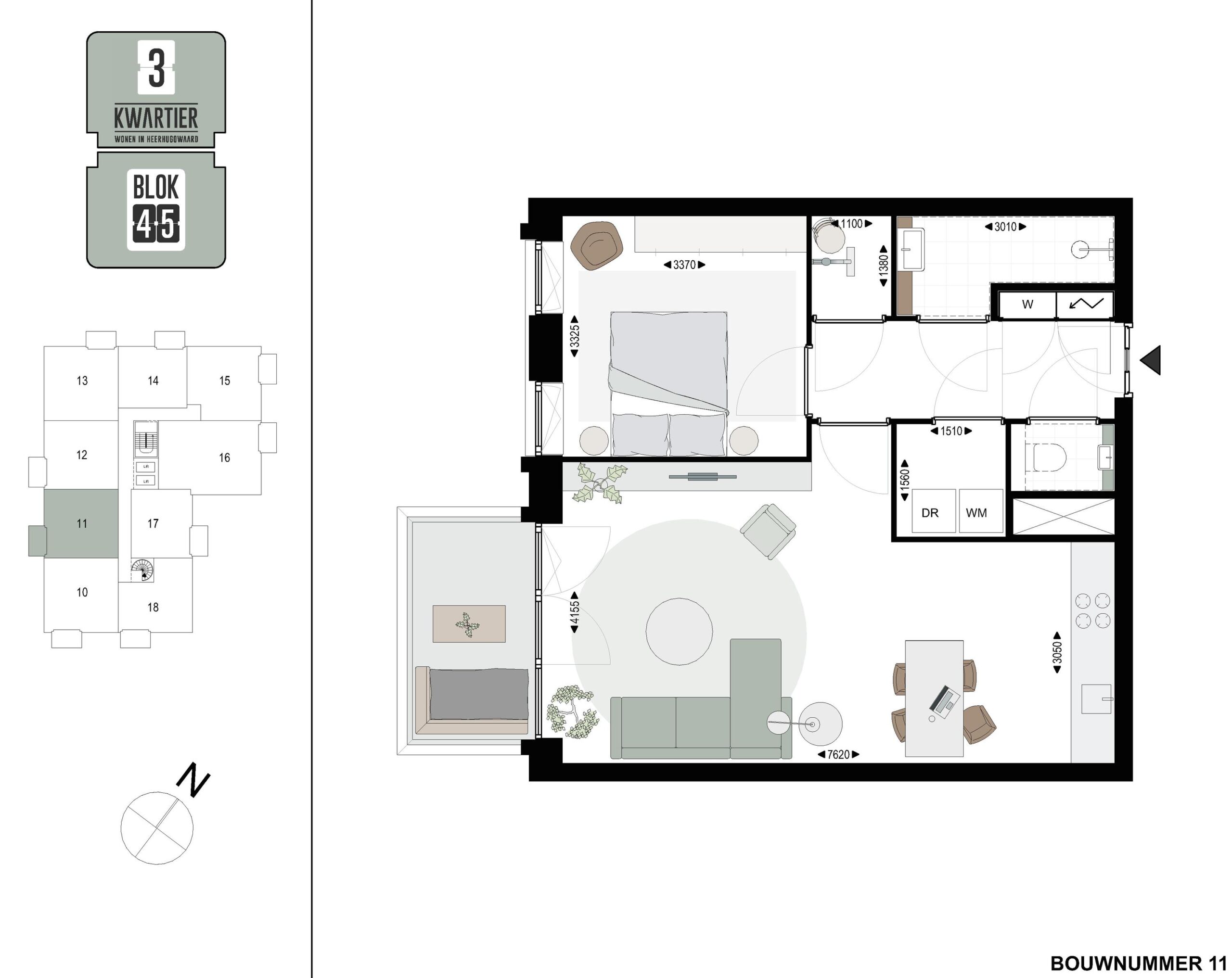 Bouwnummer 11 is een tussen 3-kamerappartement en gelegen op de 3e verdieping in BLOK45. Het appartement heeft een woonoppervlakte van 58,3 m2, 1 slaapkamer en ruimte voor een werk of hobby-kamer. De buitenruimte van 5 m2 op het zuidwesten is via de ruime living te bereiken. (Of er kan ook gekozen worden voor 1 grote slaapkamer)