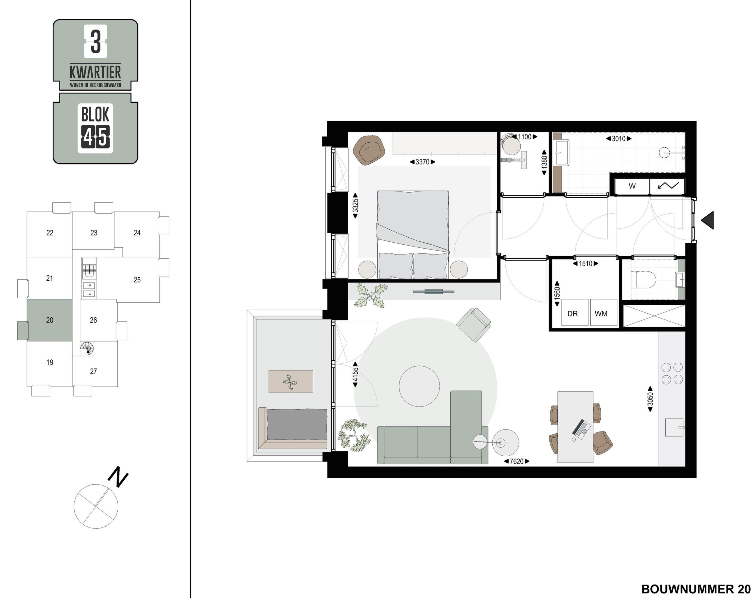 Bouwnummer 20 is een tussen 3-kamerappartement en gelegen op de 4e verdieping in BLOK45. Het appartement heeft een woonoppervlakte van 58,3 m2, 1 slaapkamer en ruimte voor een werk of hobby-kamer. De buitenruimte van 5 m2 op het zuidwesten is via de ruime living te bereiken. (Of er kan ook gekozen worden voor 1 grote slaapkamer)