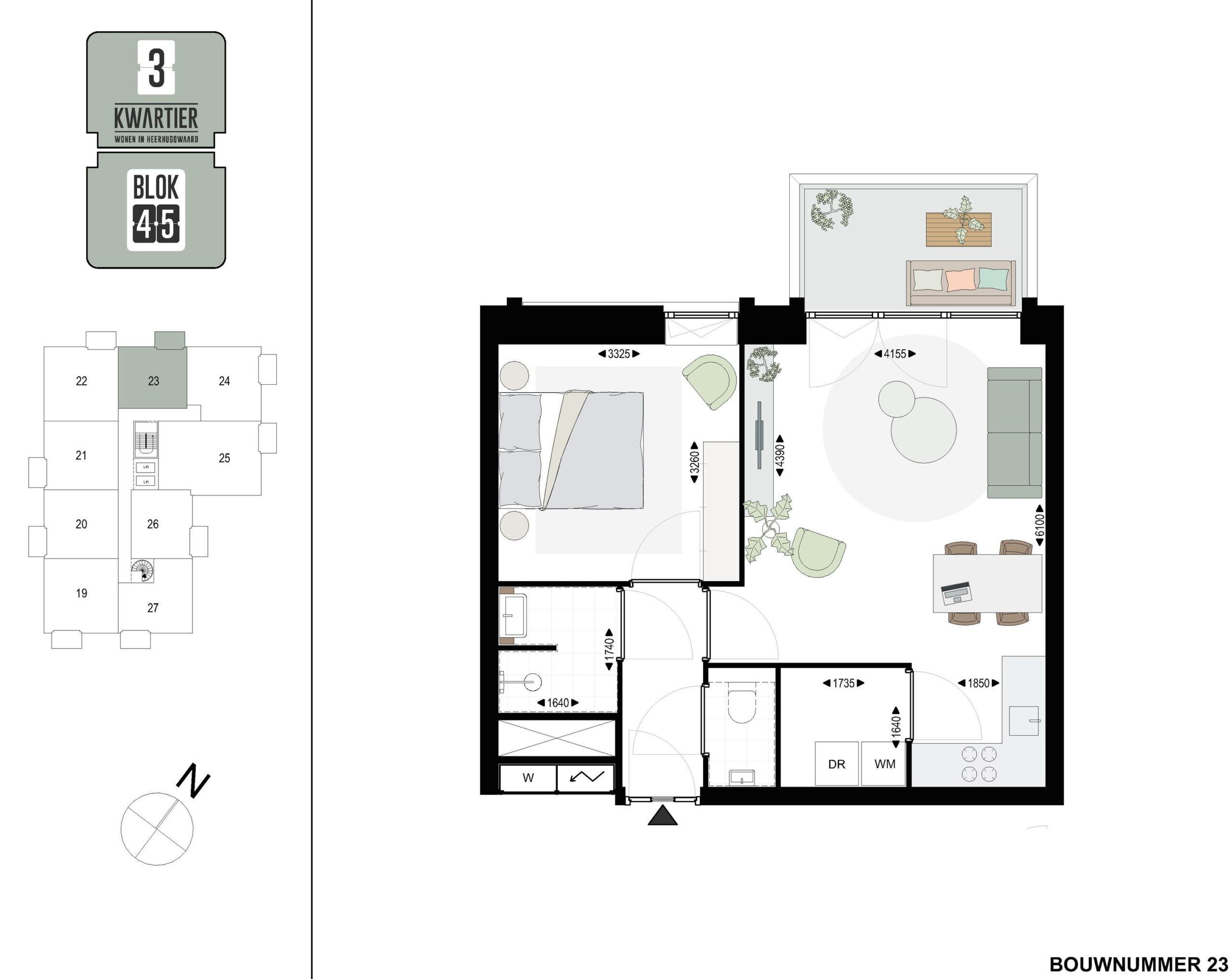 Bouwnummer 23 is een tussen appartement en gelegen op de vierde verdieping in BLOK45 aan de zijde van de Industriestraat. Het appartement heeft een woonoppervlakte van 47 m2 en 1 slaapkamer. De buitenruimte van 5 m2 op het noordwesten is via de ruime living te bereiken. Op de begane grond is een gemeenschappelijke fietsenberging aanwezig.