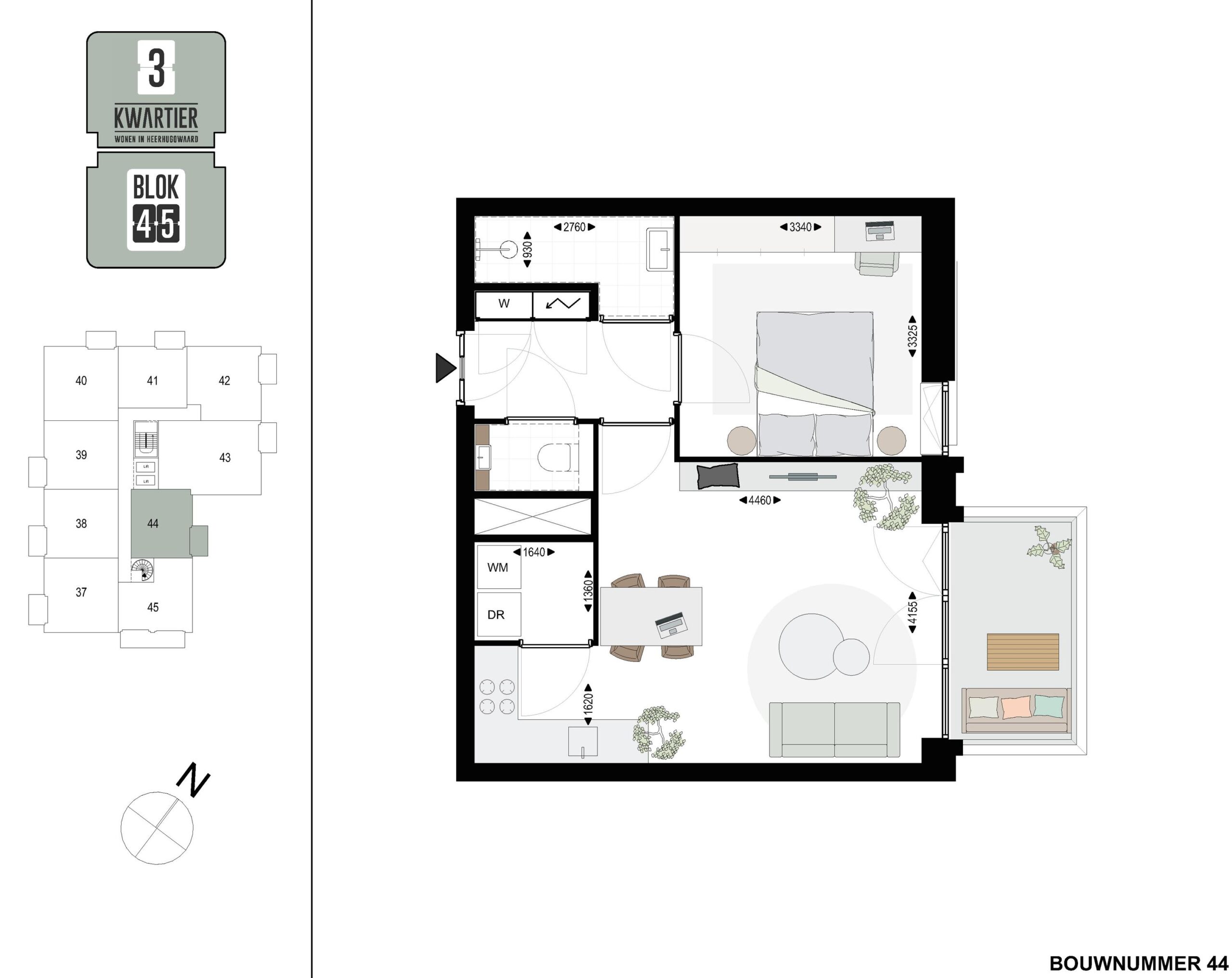 Bouwnummer 44 is een tussen appartement en gelegen op de zesde verdieping in BLOK45 met zicht op de rijk beplante binnentuin. Het appartement heeft een woonoppervlakte van 47,4 m2 en 1 slaapkamer. De buitenruimte van 5 m2 op het noordoosten is via de ruime living te bereiken. Op de begane grond is een gemeenschappelijke fietsenberging aanwezig.