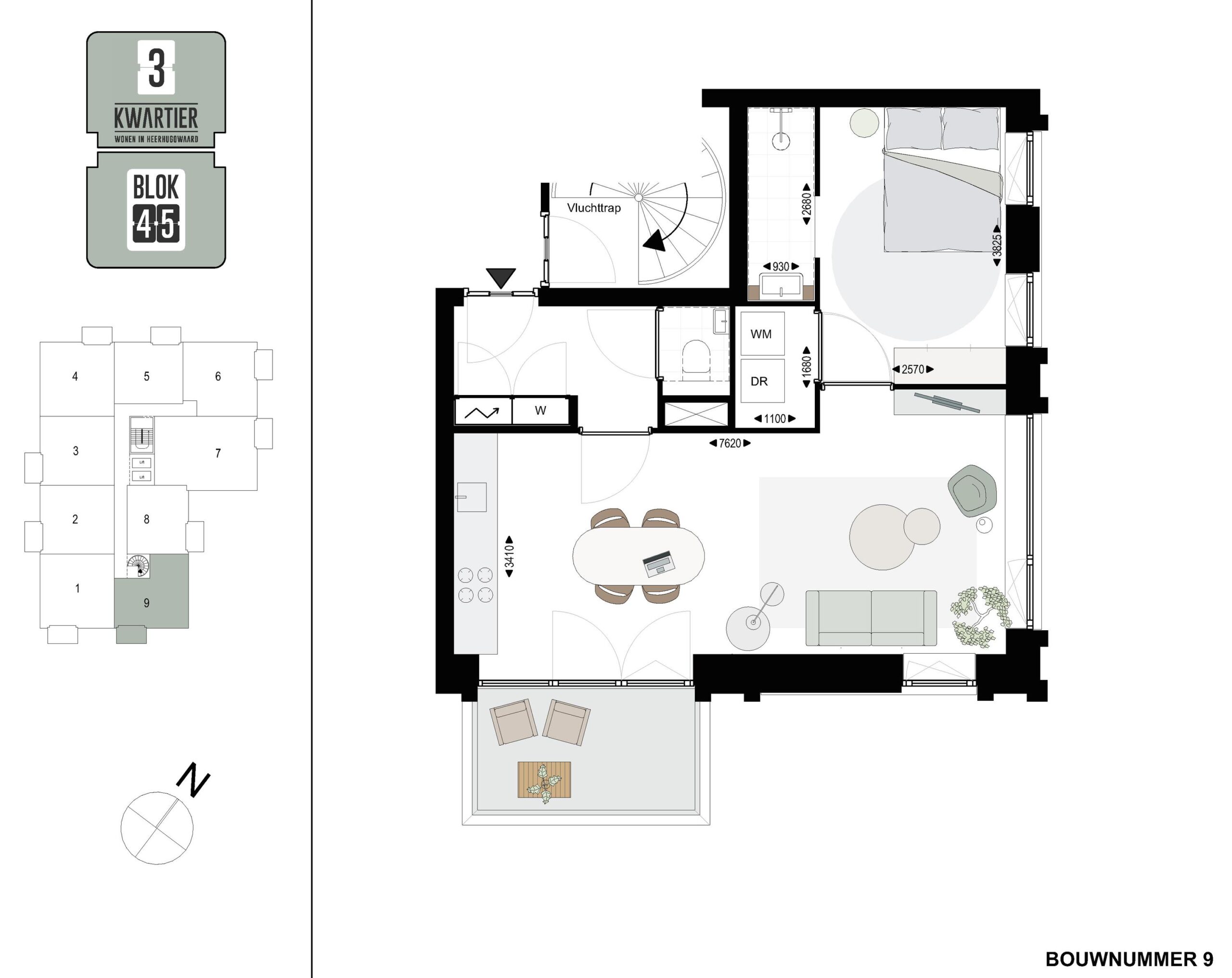 Bouwnummer 9 is een hoek appartement en gelegen op de tweede verdieping in BLOK45 met zicht op de rijk beplante binnentuin. Het appartement met een woonoppervlakte van 47,4 m2 heeft 1 slaapkamer. De buitenruimte van 5 m2 op het zuidoosten is via de ruime living te bereiken. De living geeft een licht en ruimtelijk gevoel door de vele raampartijen aan twee zijdes. Op de begane grond is een gemeenschappelijke fietsenberging aanwezig.