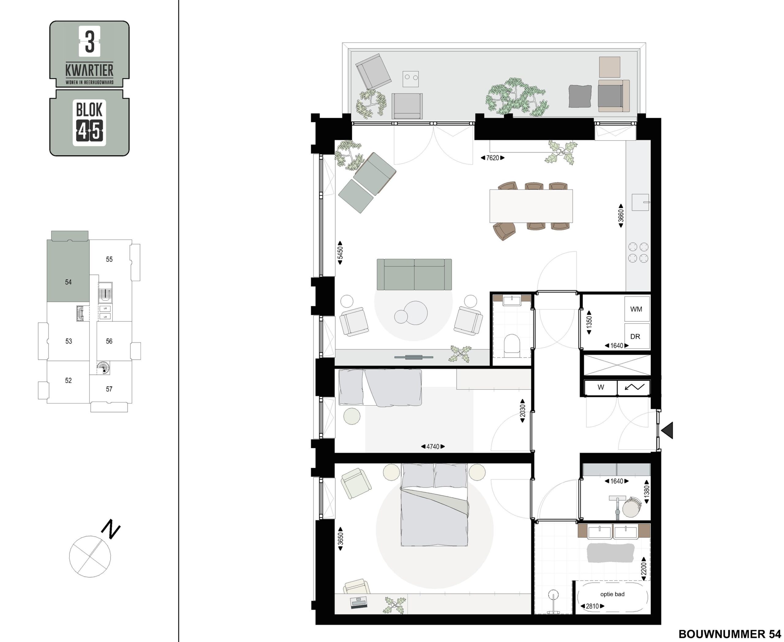 Bouwnummer 54 is een hoek appartement en gelegen op de achtste verdieping in BLOK45. Het appartement met een woonoppervlakte van 88,2 m2 heeft 2 slaapkamers. De ruime buitenruimte van 12 m2 op het noordwesten is via de living te bereiken. De living van maar liefst 34,2 m2 is riant te noemen en door de vele raampartijen aan 2 zijdes geeft dit een heerlijk licht en ruimtelijk gevoel. In de badkamer is er voldoende ruimte voor je eigen wellness met een bad. Op de begane grond is een gemeenschappelijke fietsenberging aanwezig.