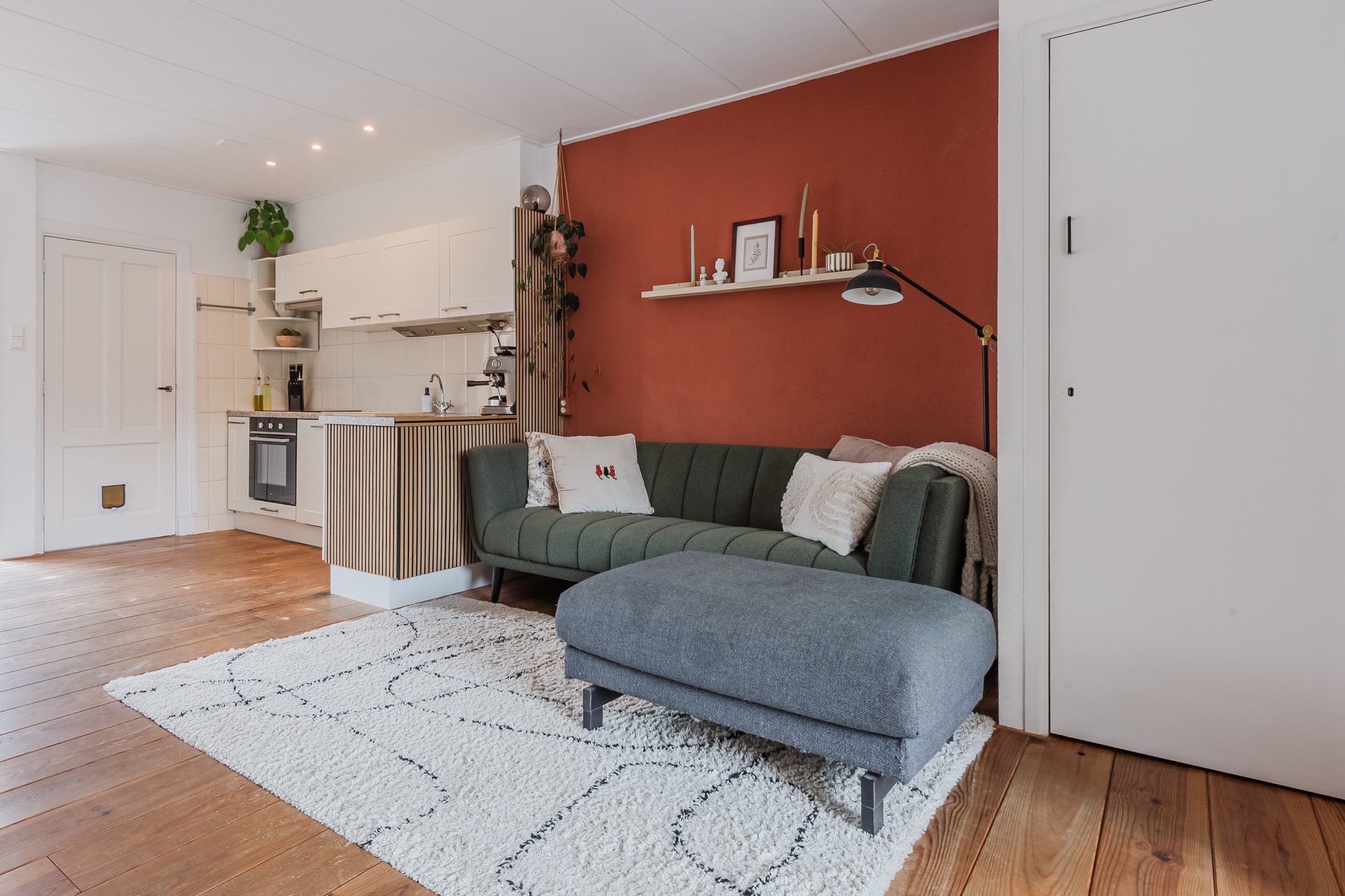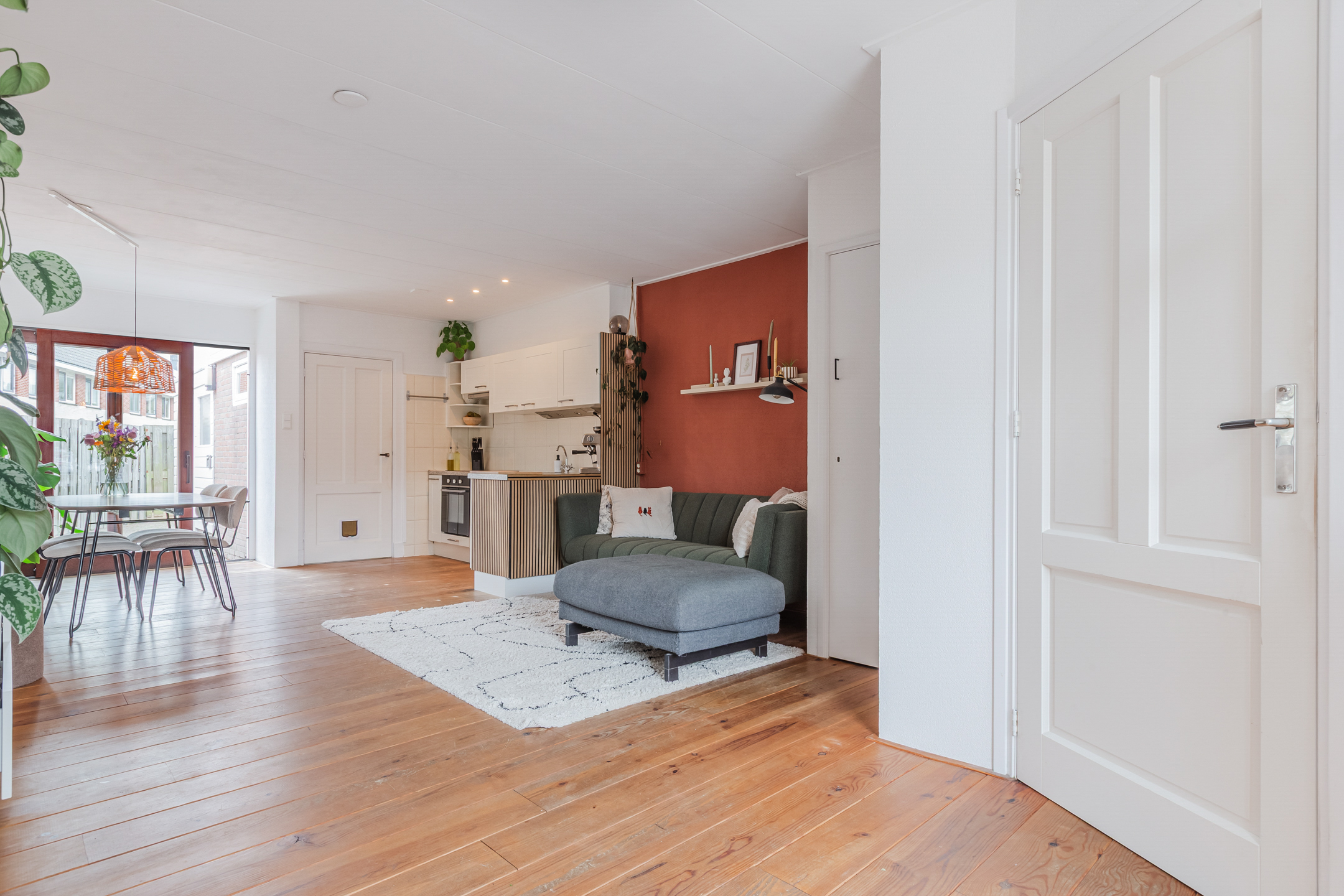 Achter de voordeur vinden we de entree met garderobe, meterkast, toilet en toegang tot de woonkamer met open keuken.