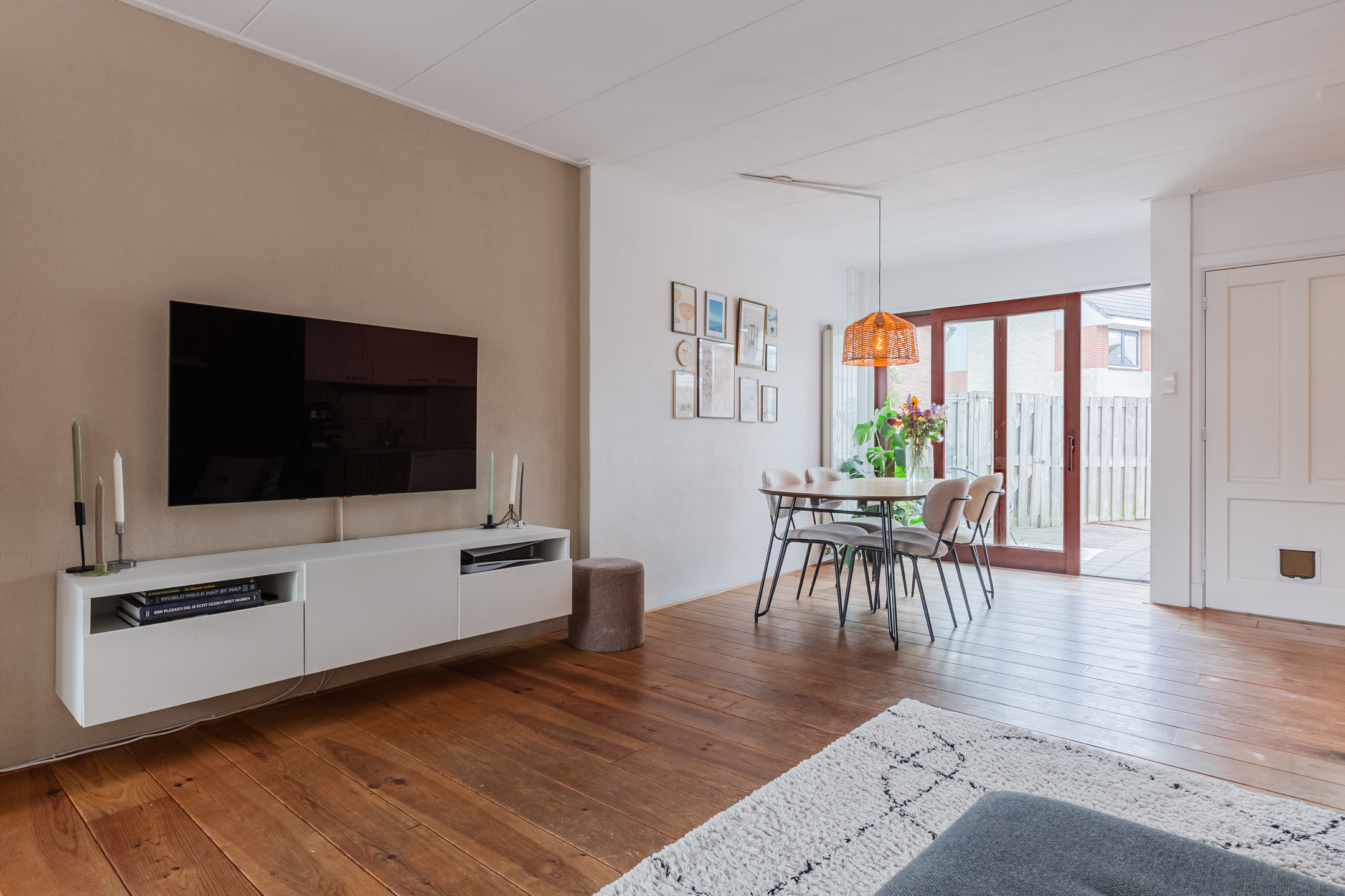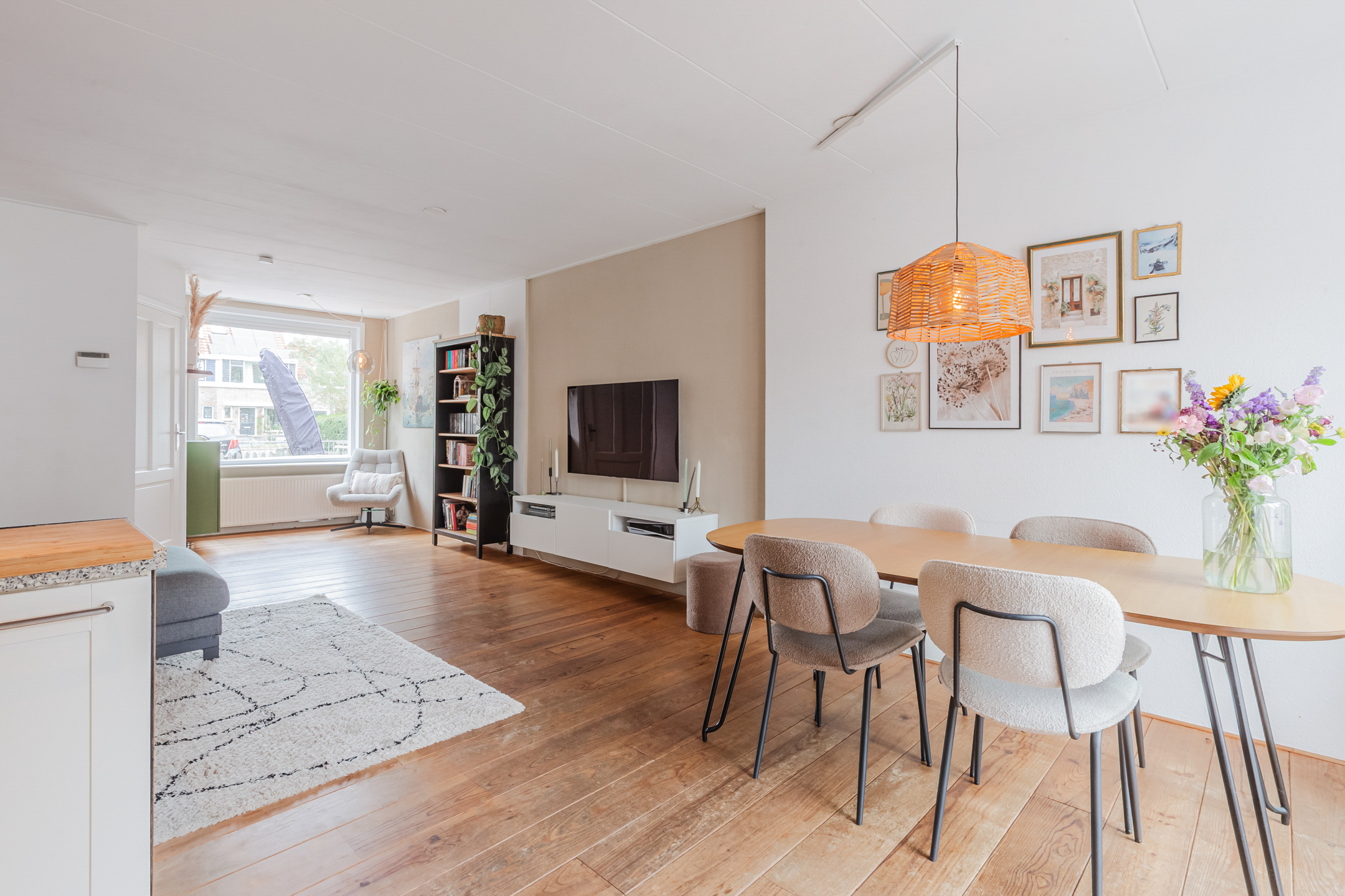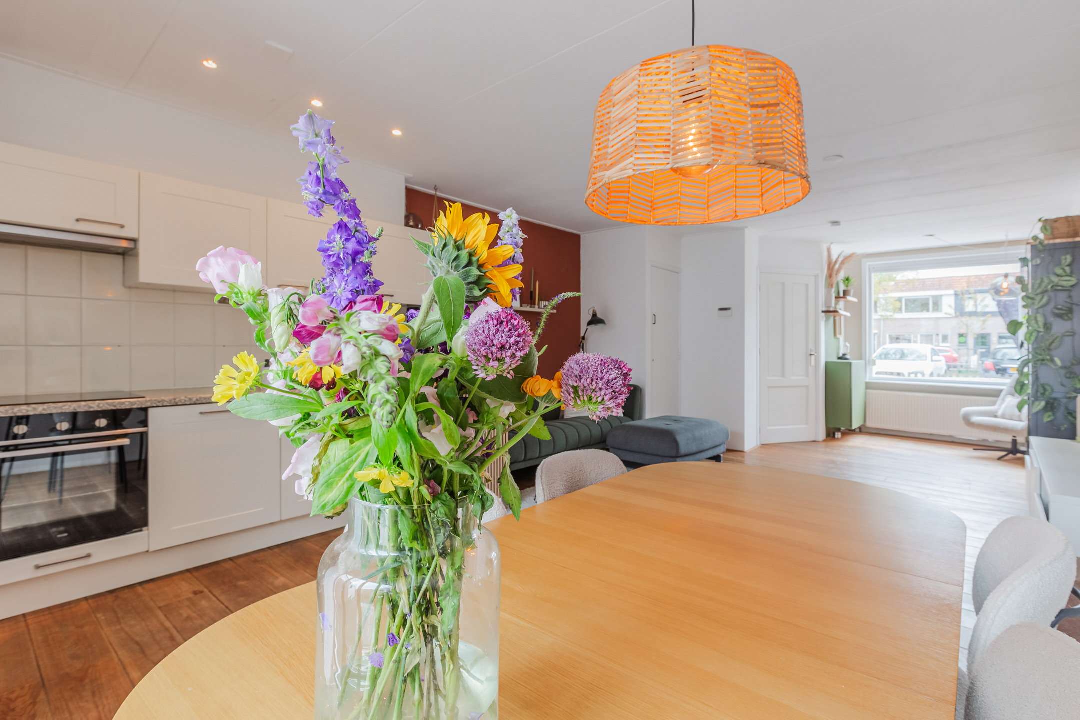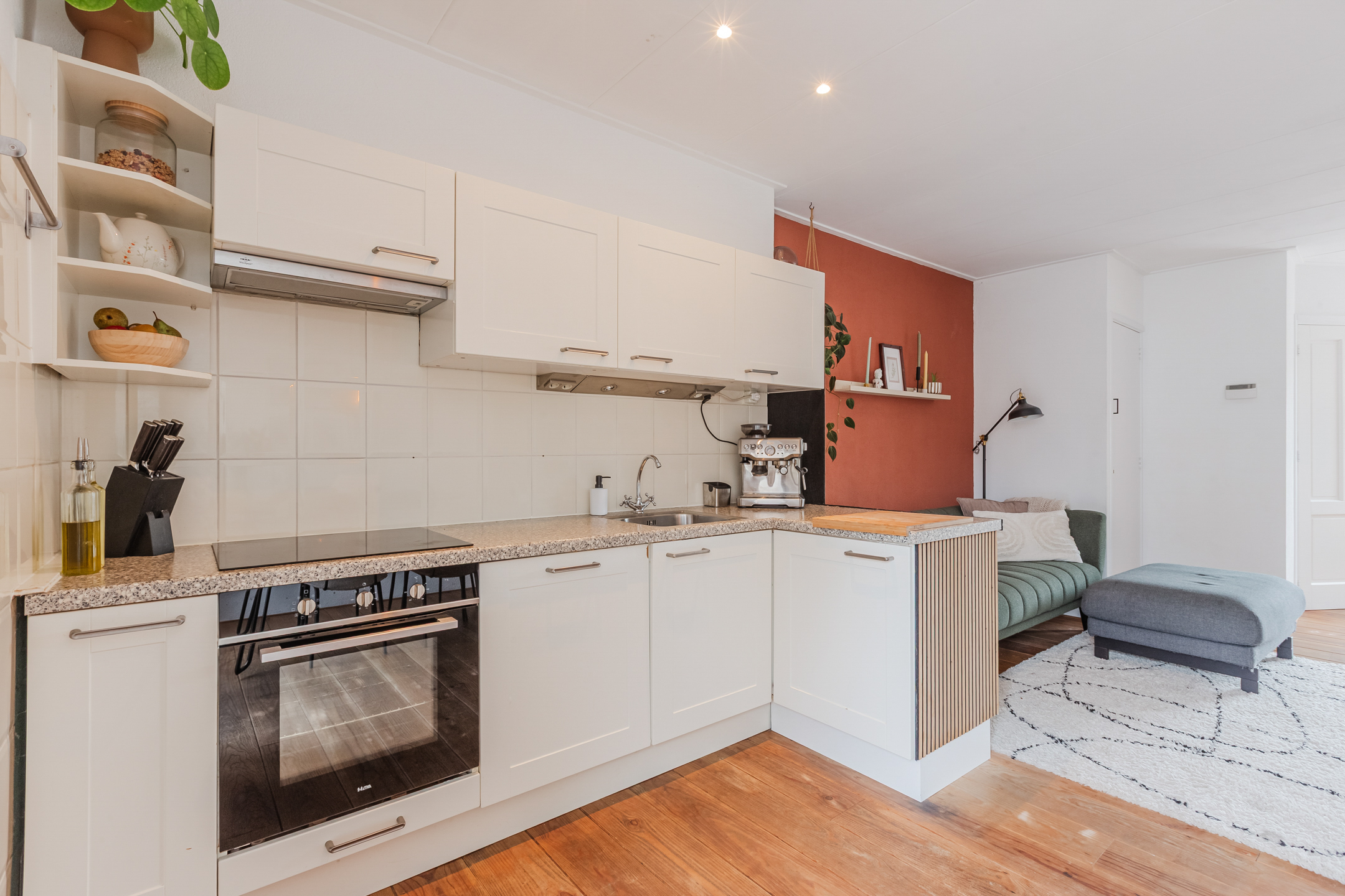 De sfeervolle woonkamer geniet van veel lichtinval en is afgewerkt met een mooie houten vloer. De moderne open keuken is voorzien van een inductiekookplaat, oven, koelkast en een vaatwasser.