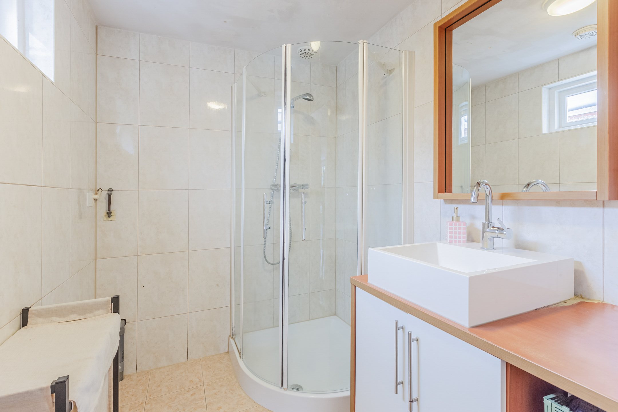 The bathroom has a vanity unit and a shower.