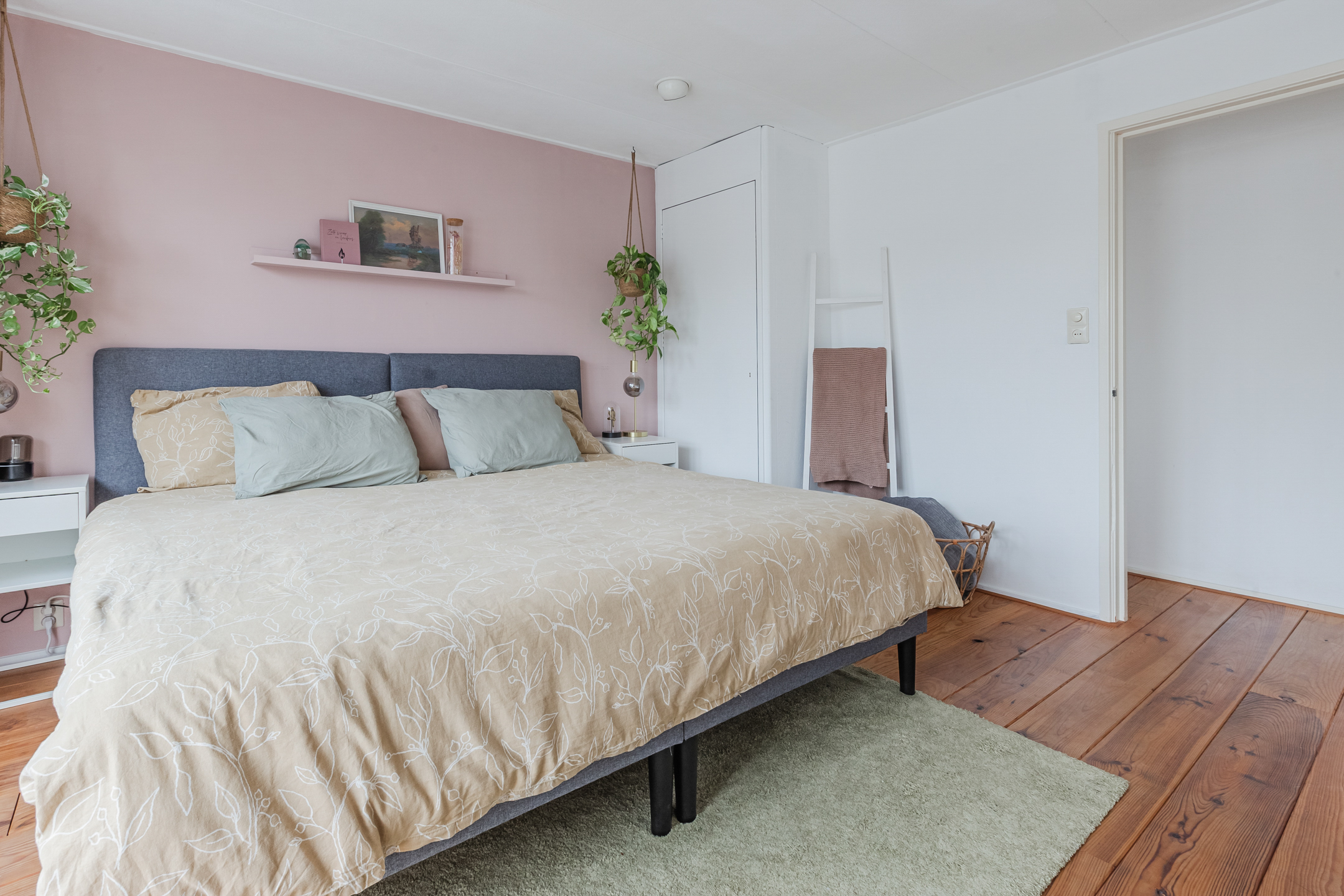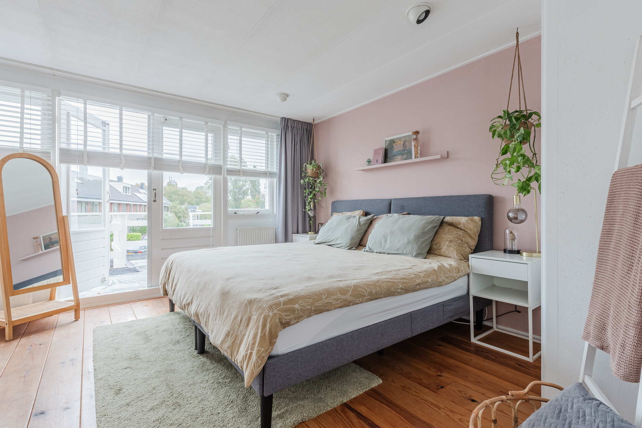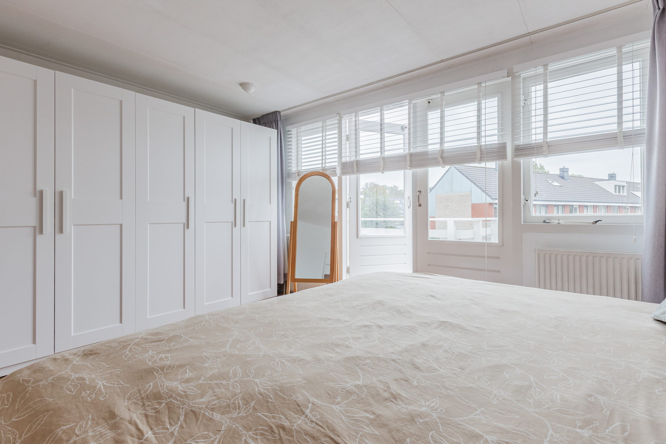 Vanaf de overloop is er toegang tot 2 ruime slaapkamers. Beide slaapkamers zijn afgewerkt met een mooie houten vloer en de grootste slaapkamer heeft openslaande balkondeuren naar een ruim dakterras op het Oosten.