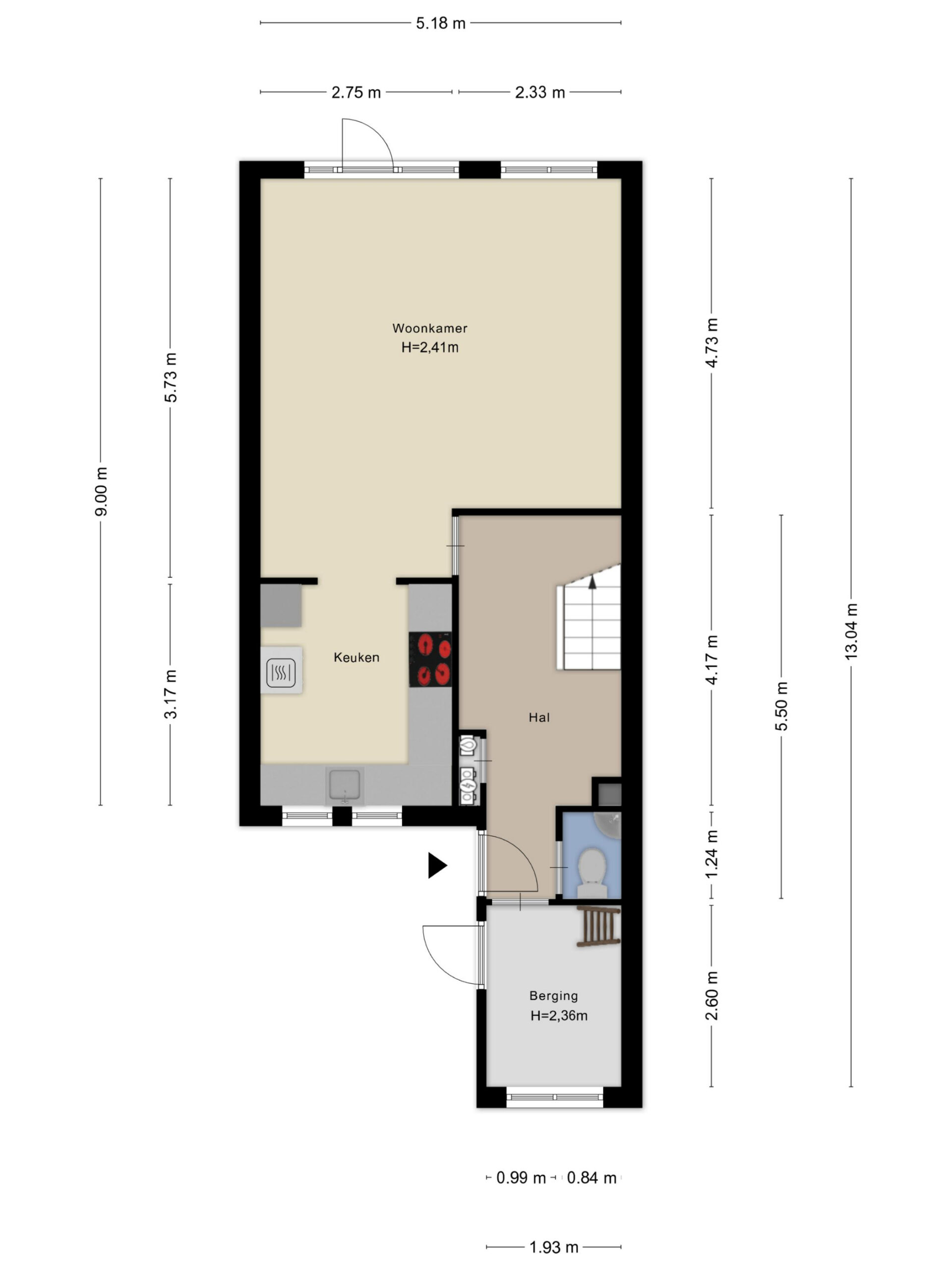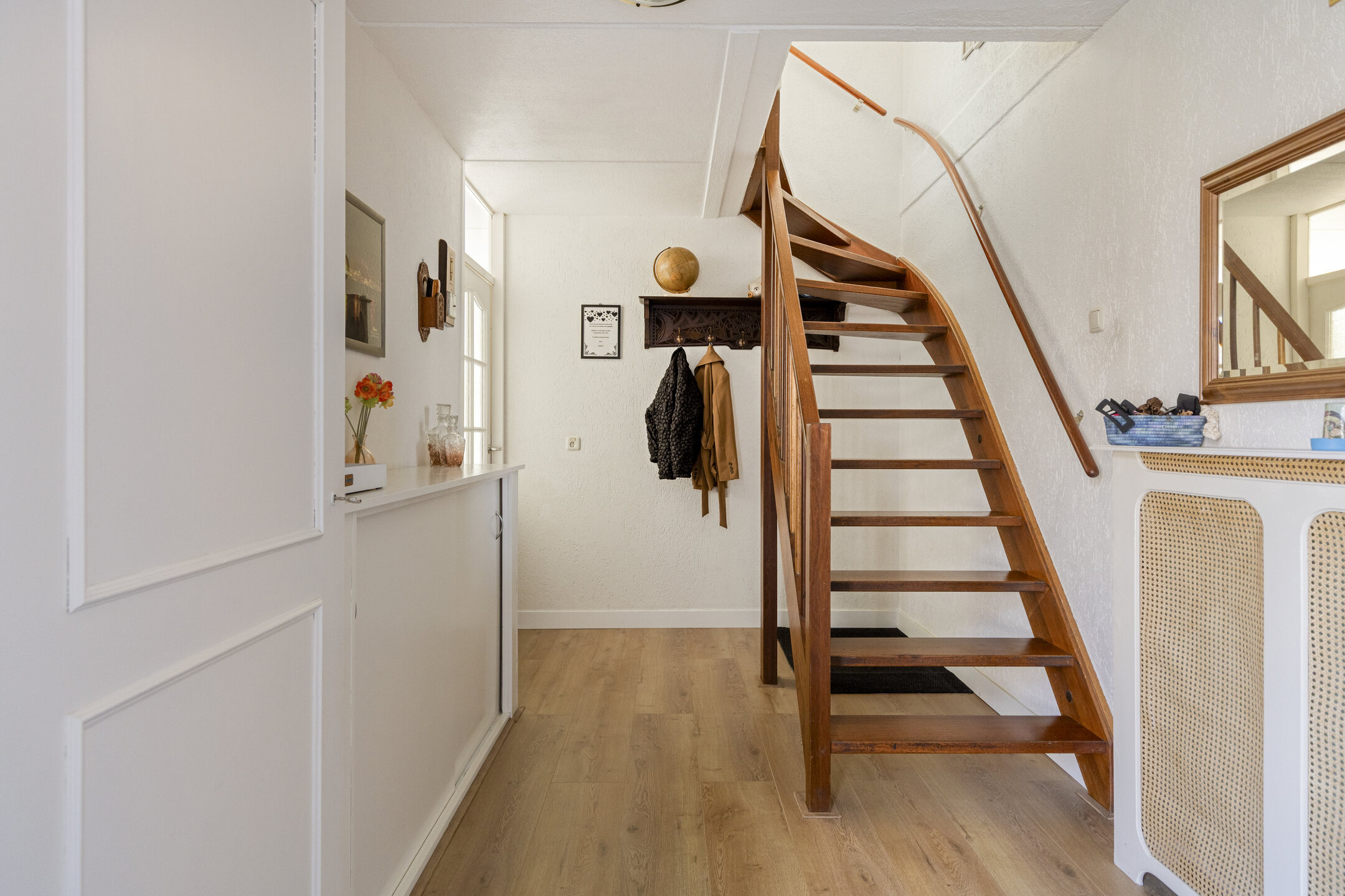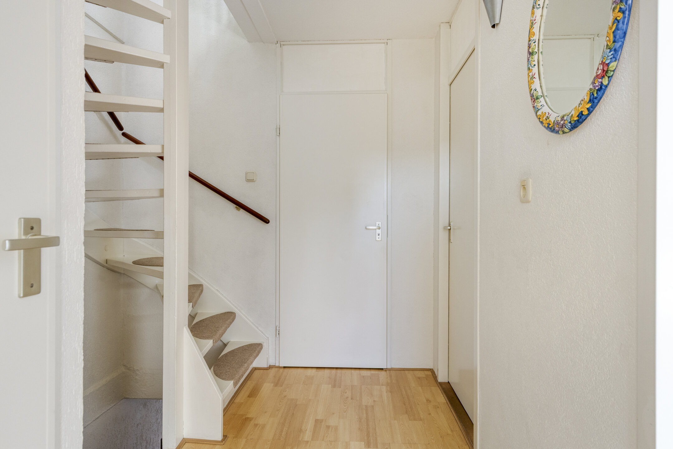 Via de entree kom je in de lichte hal met toegang tot het toilet en de trapopgang. Vanuit hier loop je door naar de leefruimte. De keuken bevindt zich aan de voorzijde van de woning, terwijl de woonkamer zich uitstrekt over de achterzijde en een prettig uitzicht biedt op de tuin.