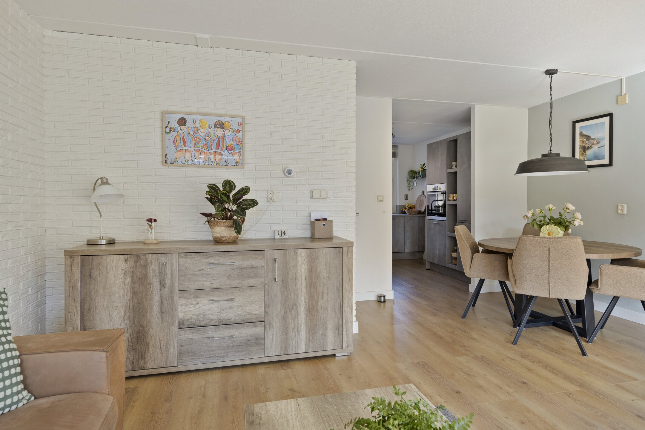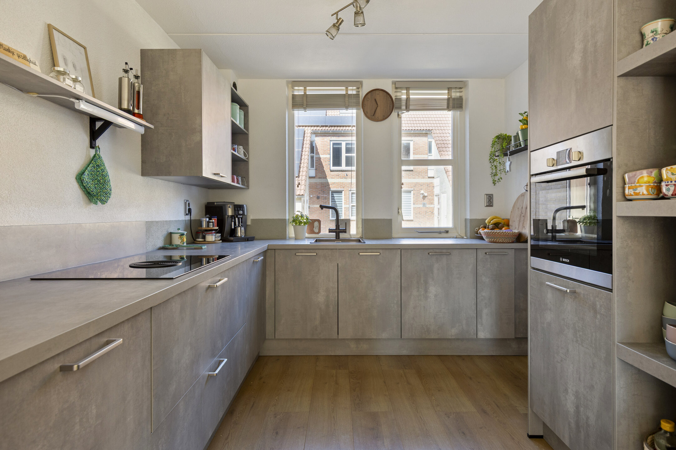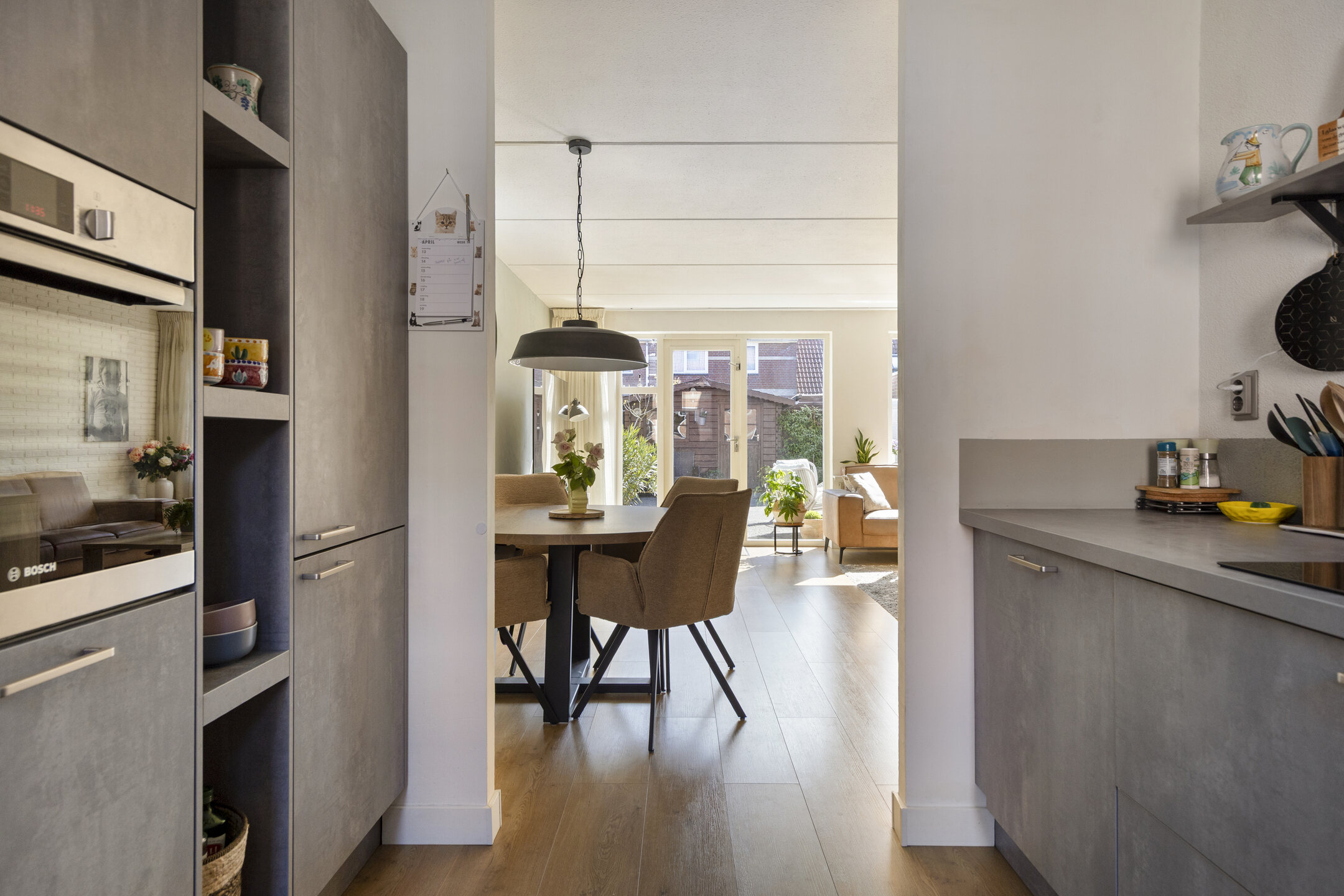De moderne keuken is uitgevoerd in een hoekopstelling met veel werk- en kastruimte en voorzien van luxe inbouwapparatuur, waaronder een inductiekookplaat met geĆÆntegreerde afzuiging, combi-oven, vaatwasser, heetwaterkraan en een koel-/vriescombinatie. Aansluitend ligt de woonkamer, waar je geniet van een fijne lichtinval en direct contact met de achtertuin.