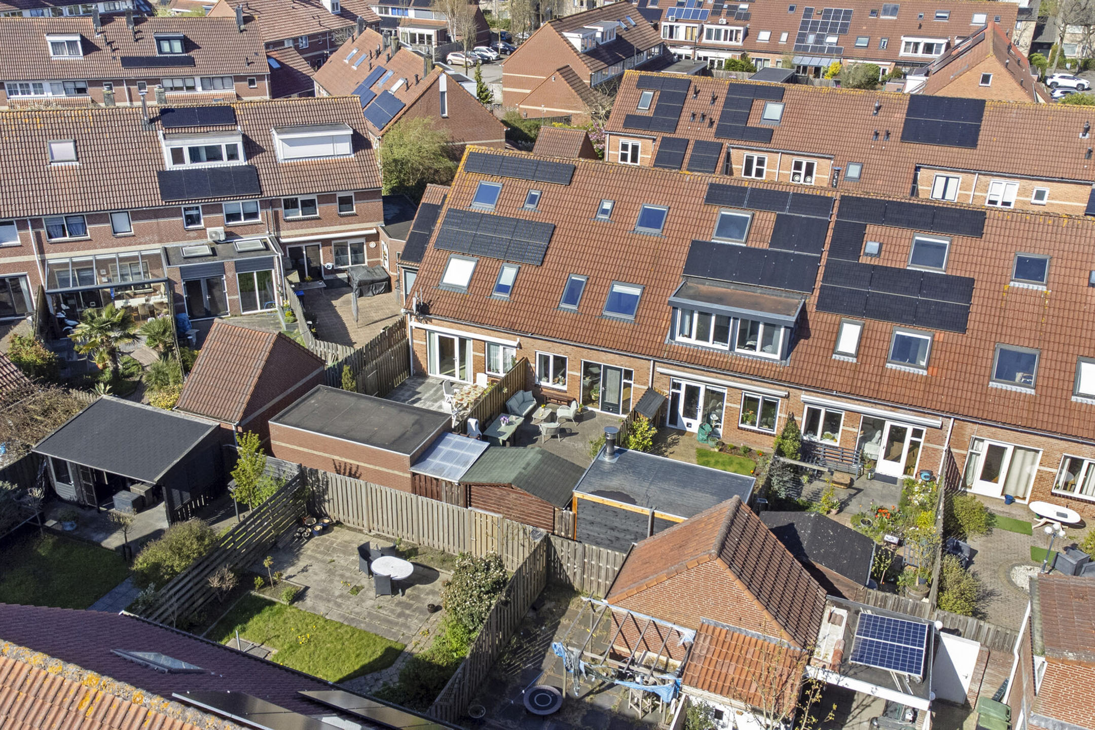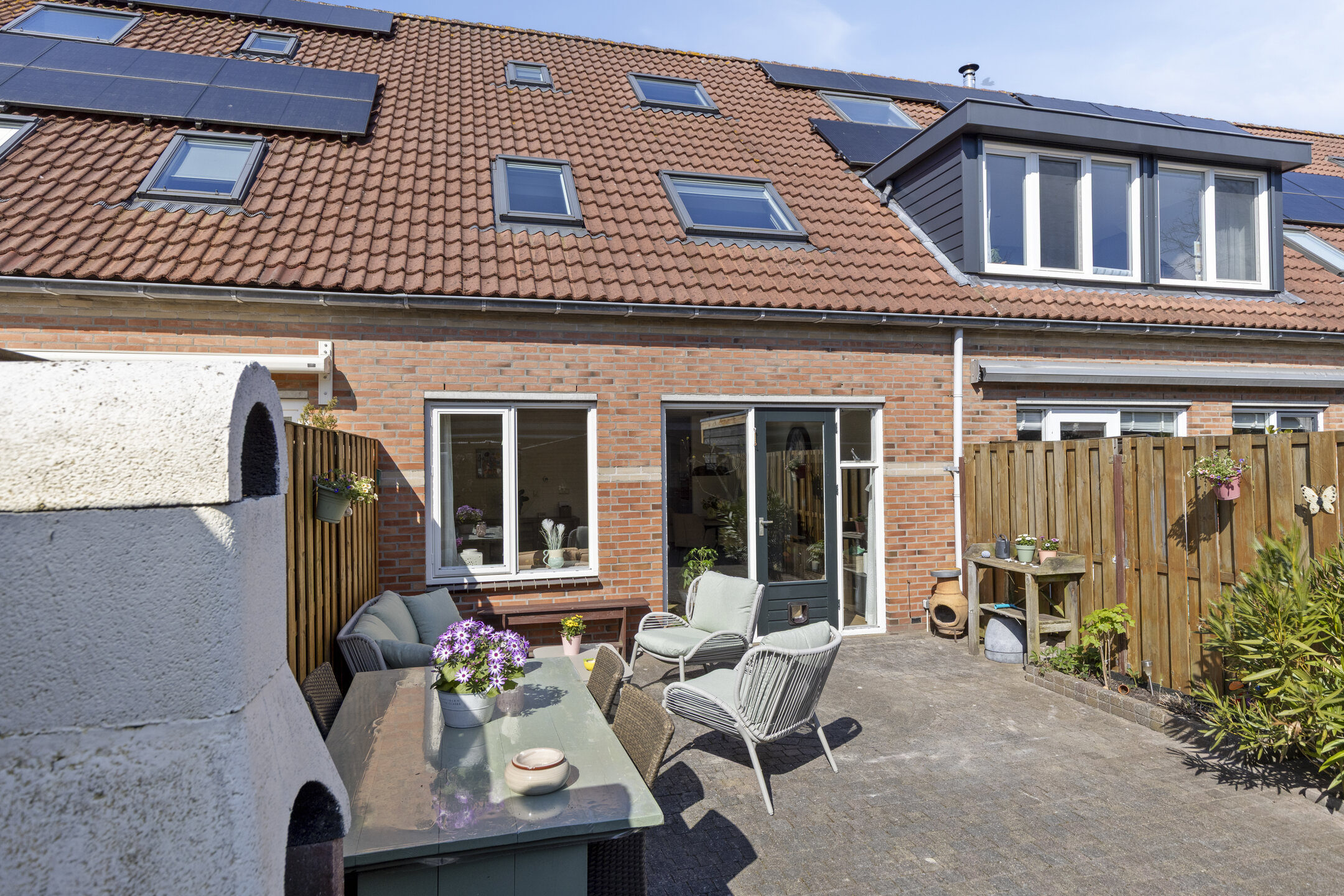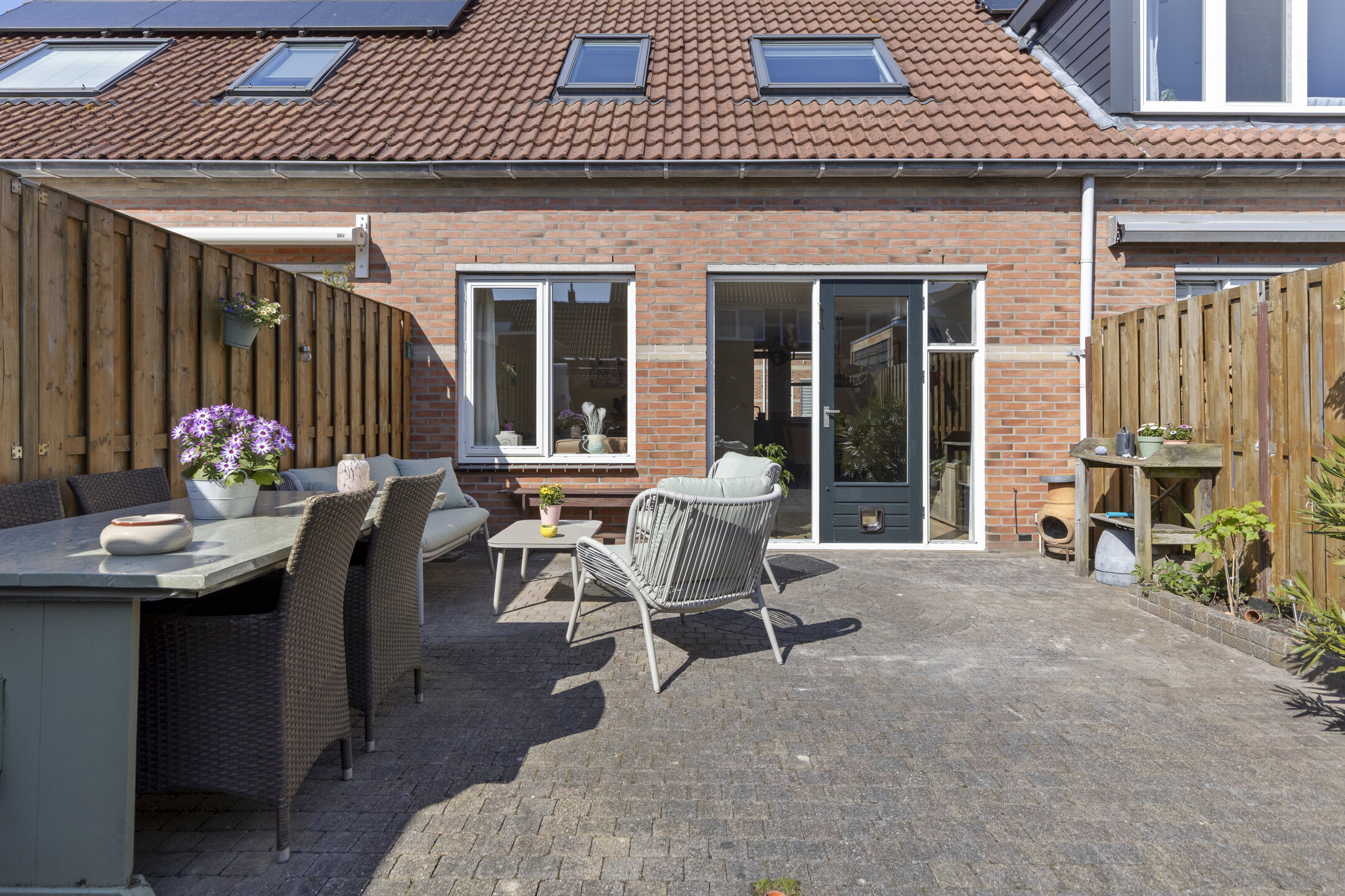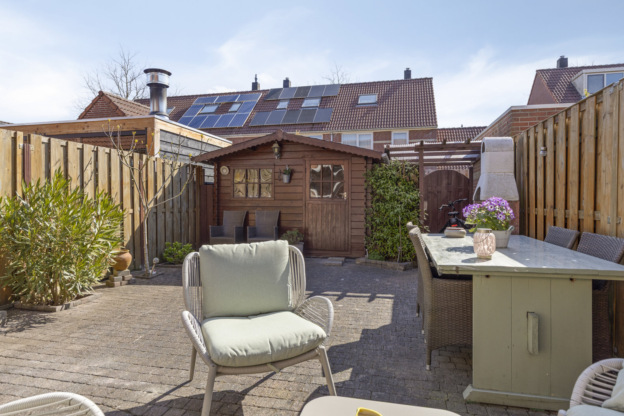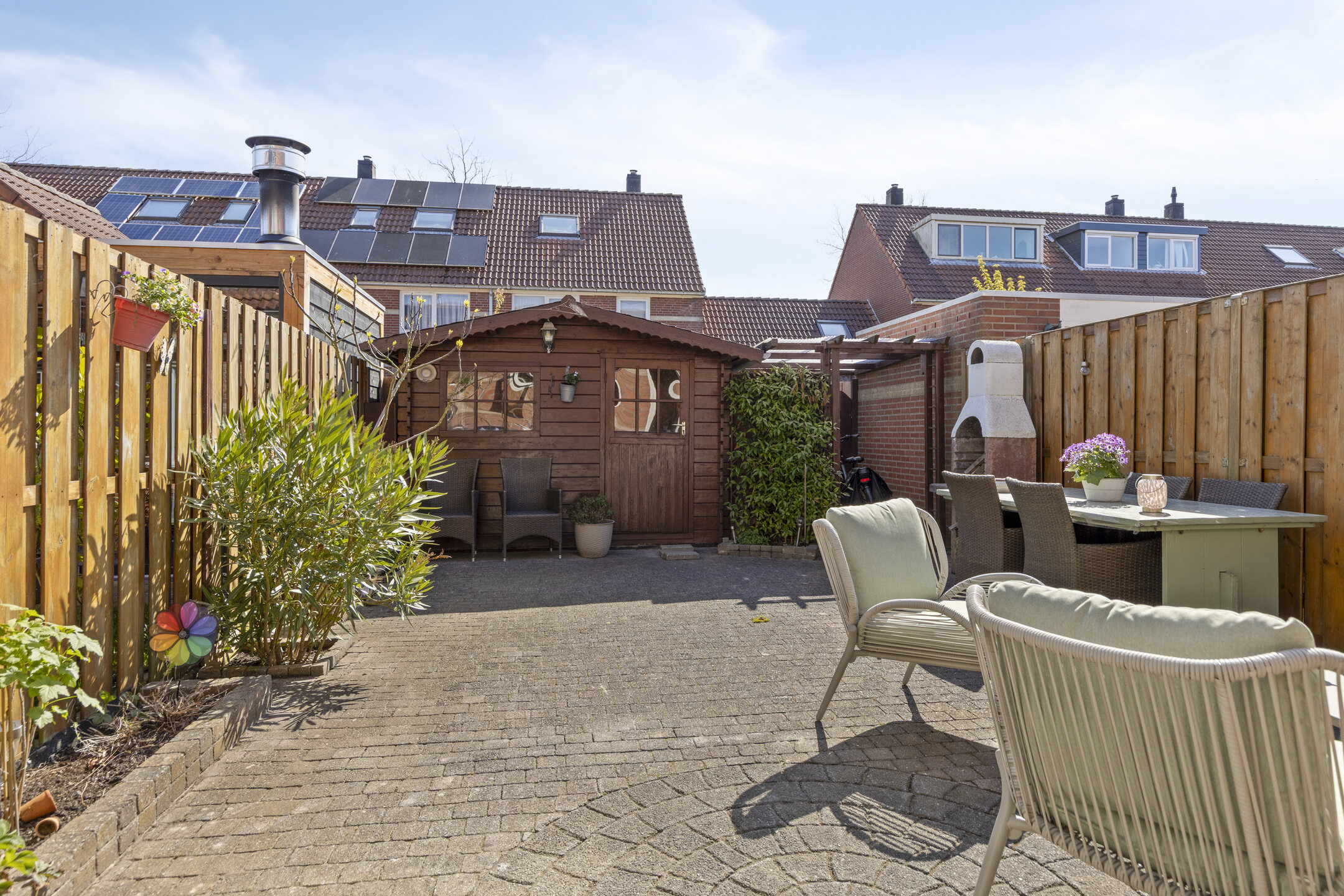 De achtertuin is onderhoudsvriendelijk aangelegd en ligt gunstig op de zon. Er is voldoende ruimte voor meerdere zitplekken, met achterin een vrijstaande berging en een praktische achterom.