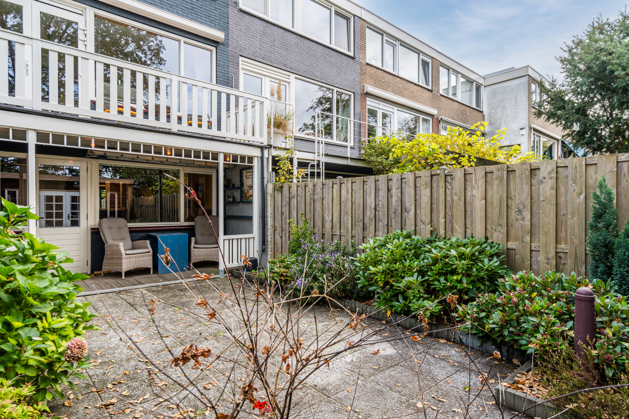 The property has a sunny, west-facing garden, beautifully landscaped with a large tiled terrace framed by green borders. Directly behind the house is a cosy veranda terrace under the balcony above, and at the back of the garden stands a handy wooden shed which is equipped with electricity. Because the garden borders on a green strip and there are no neighbours at the back, you can enjoy optimal privacy in the garden!