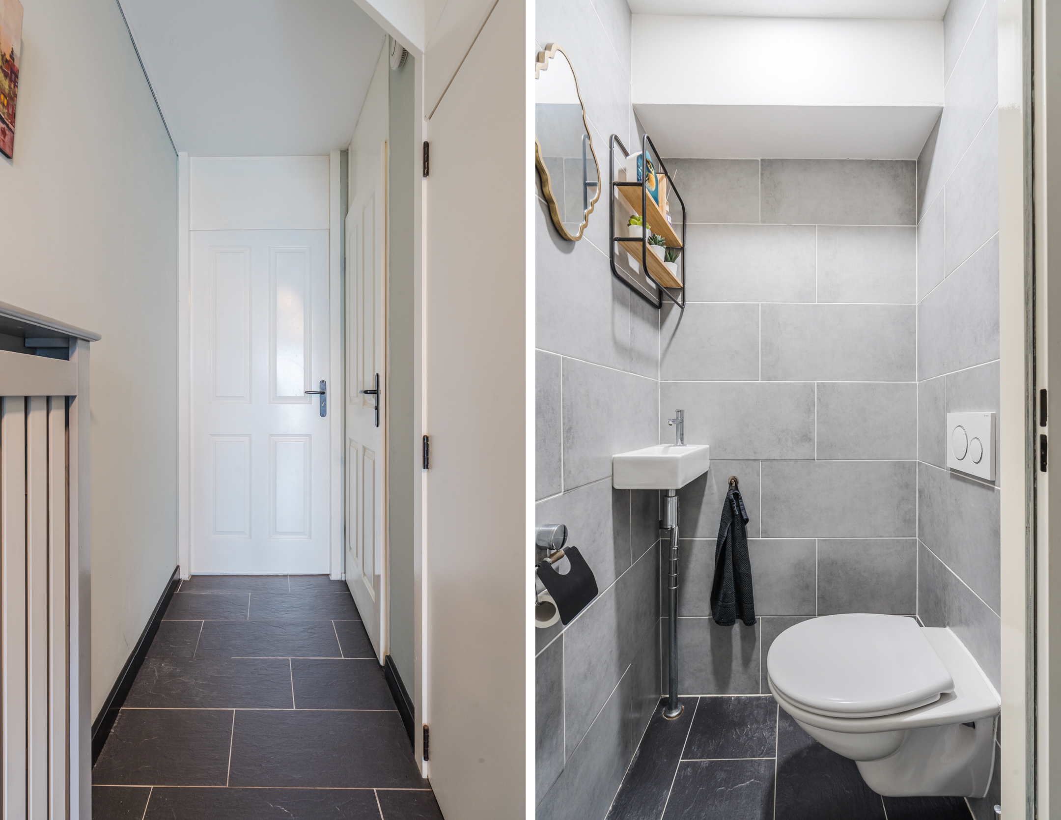 The spacious front yard with driveway leads to the front door of the house. Behind the front door is the entrance hall with the meter closet and access to the ground floor apartment. Behind this entrance hall is another central hallway with the staircase to the first floor, a separate toilet with hand basin and access to the bedroom on the ground floor.