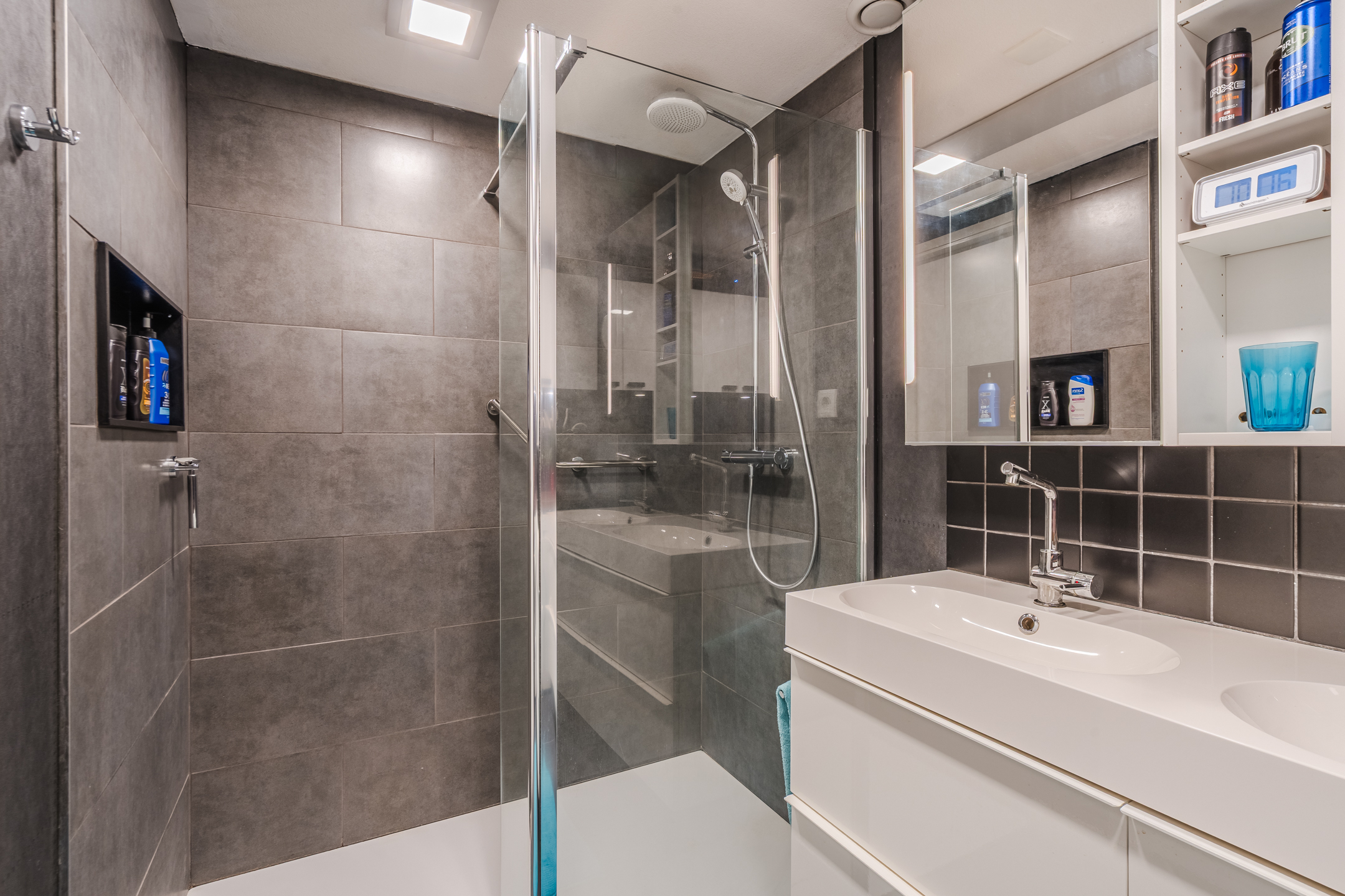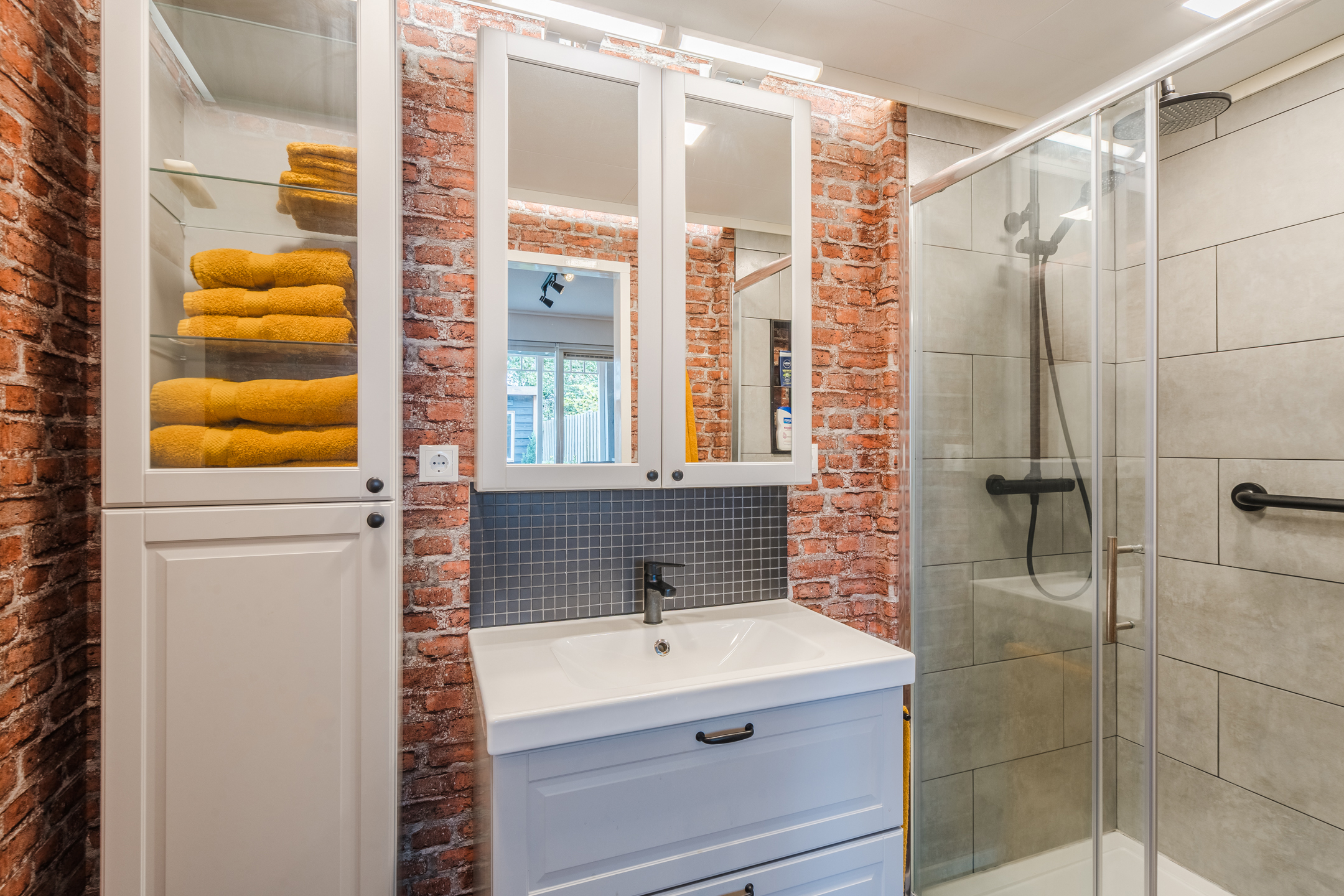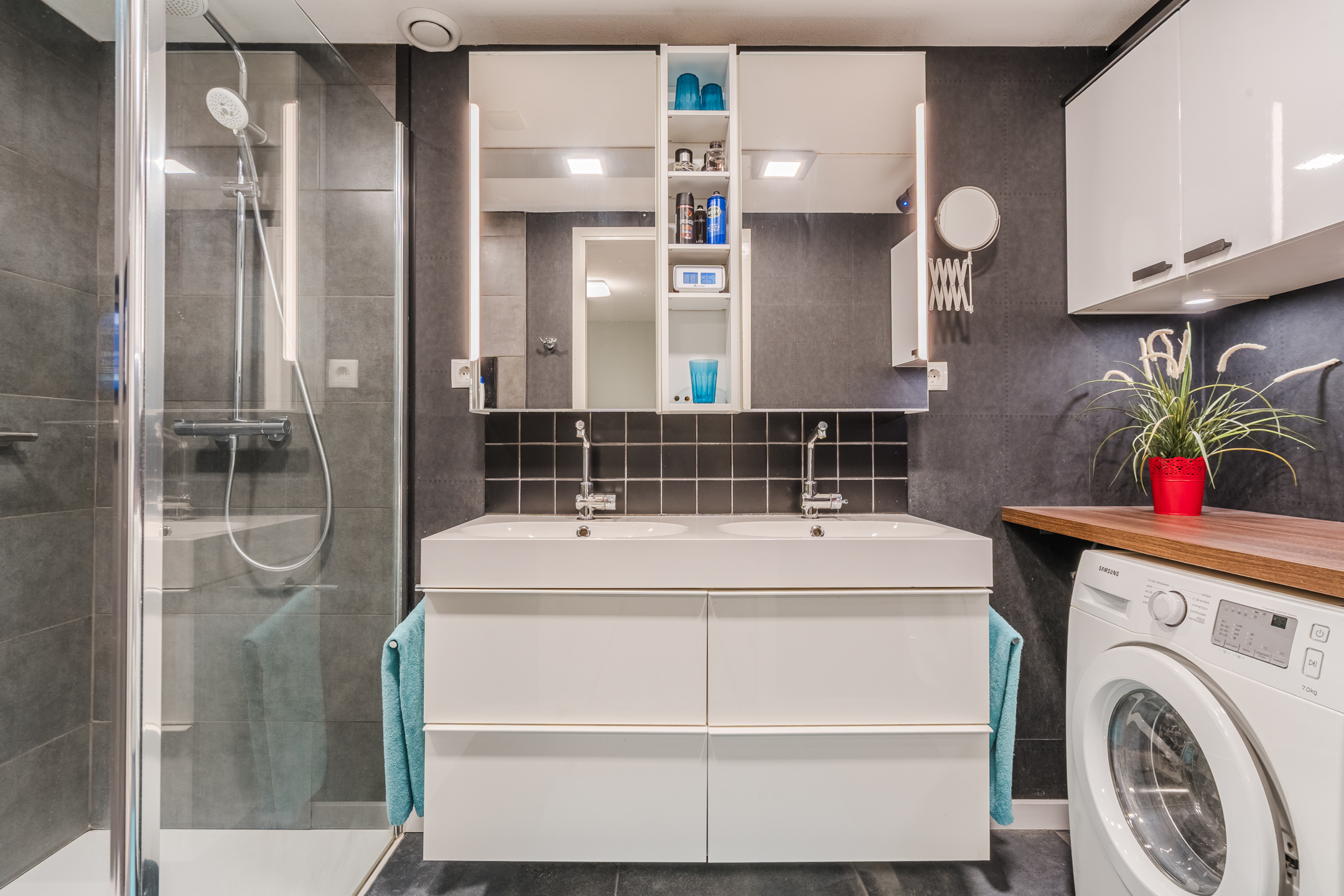 Vanaf de overloop is er toegang tot 2 ruime slaapkamers ā beide netjes afgewerkt met een laminaatvloer - een separaat toilet met fonteintje en tot een moderne badkamer met een dubbele wastafel met meubel, ruime inloopdouche en de aansluitingen voor de witgoedopstelling.