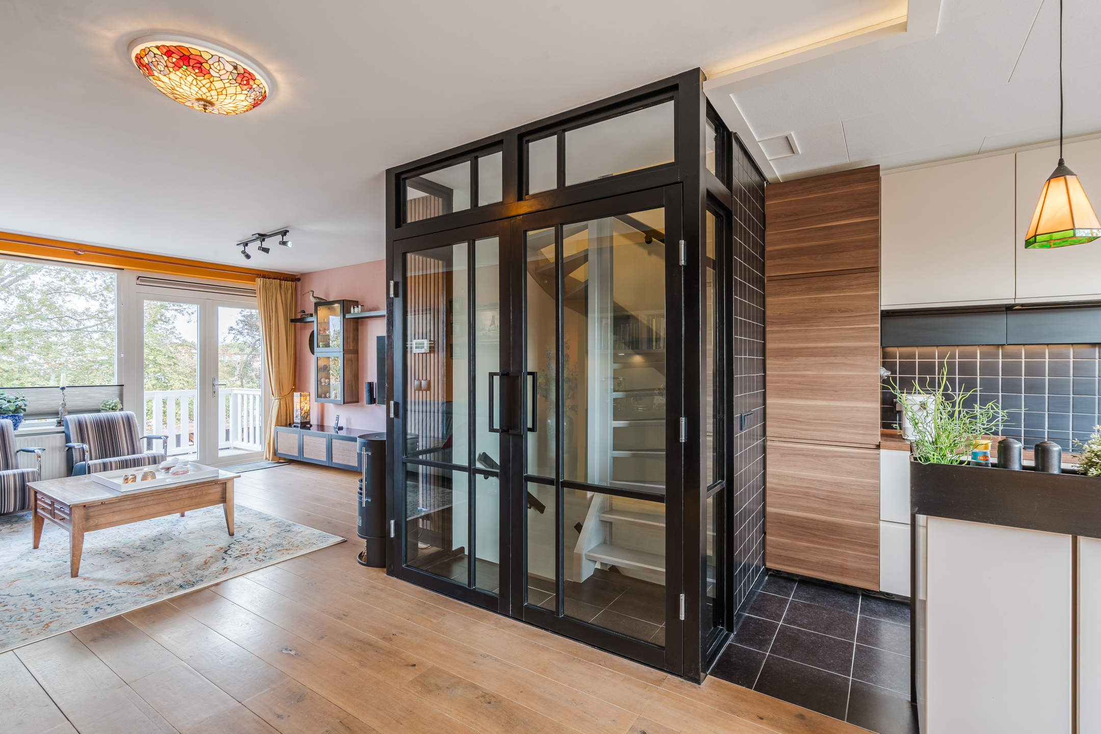 Vanaf de overloop met dubbele zwartstalen deuren met glas is er toegang tot de woonkamer met open keuken. Een heerlijke, lichte ruimte die fraai is afgewerkt met een houten vloer en inbouwwandkasten. Aan beide zijden van de ruimte is er toegang tot een ruim balkonterras.
