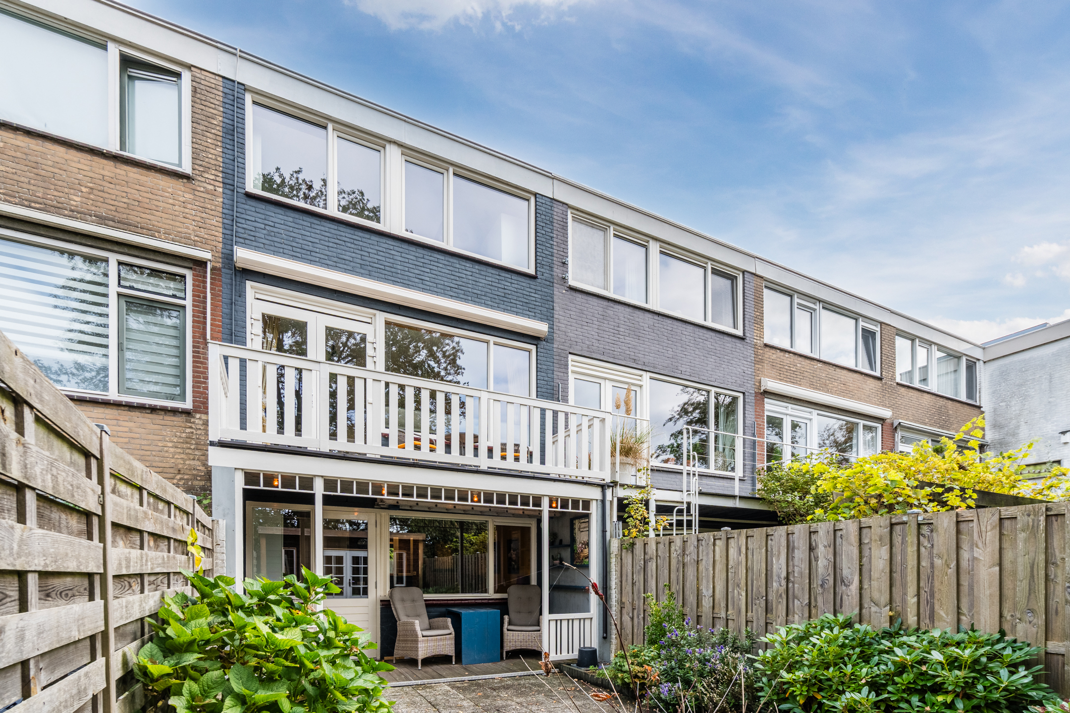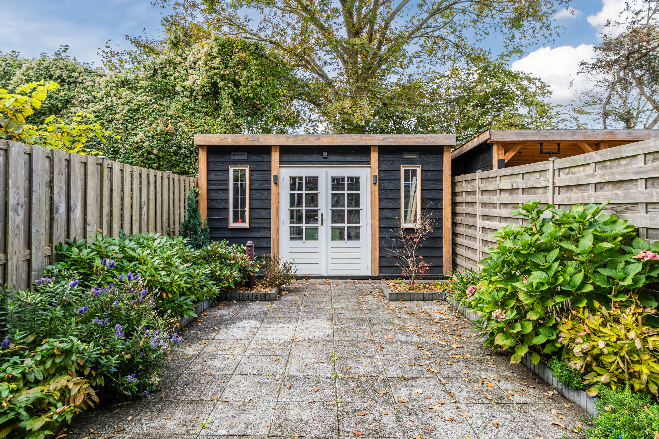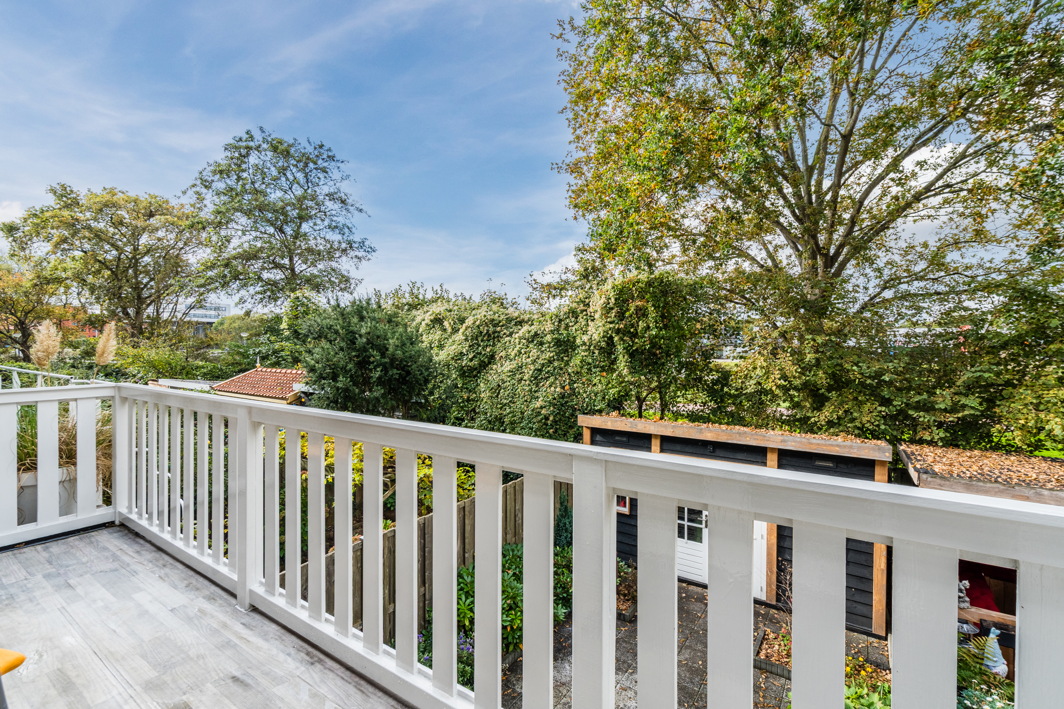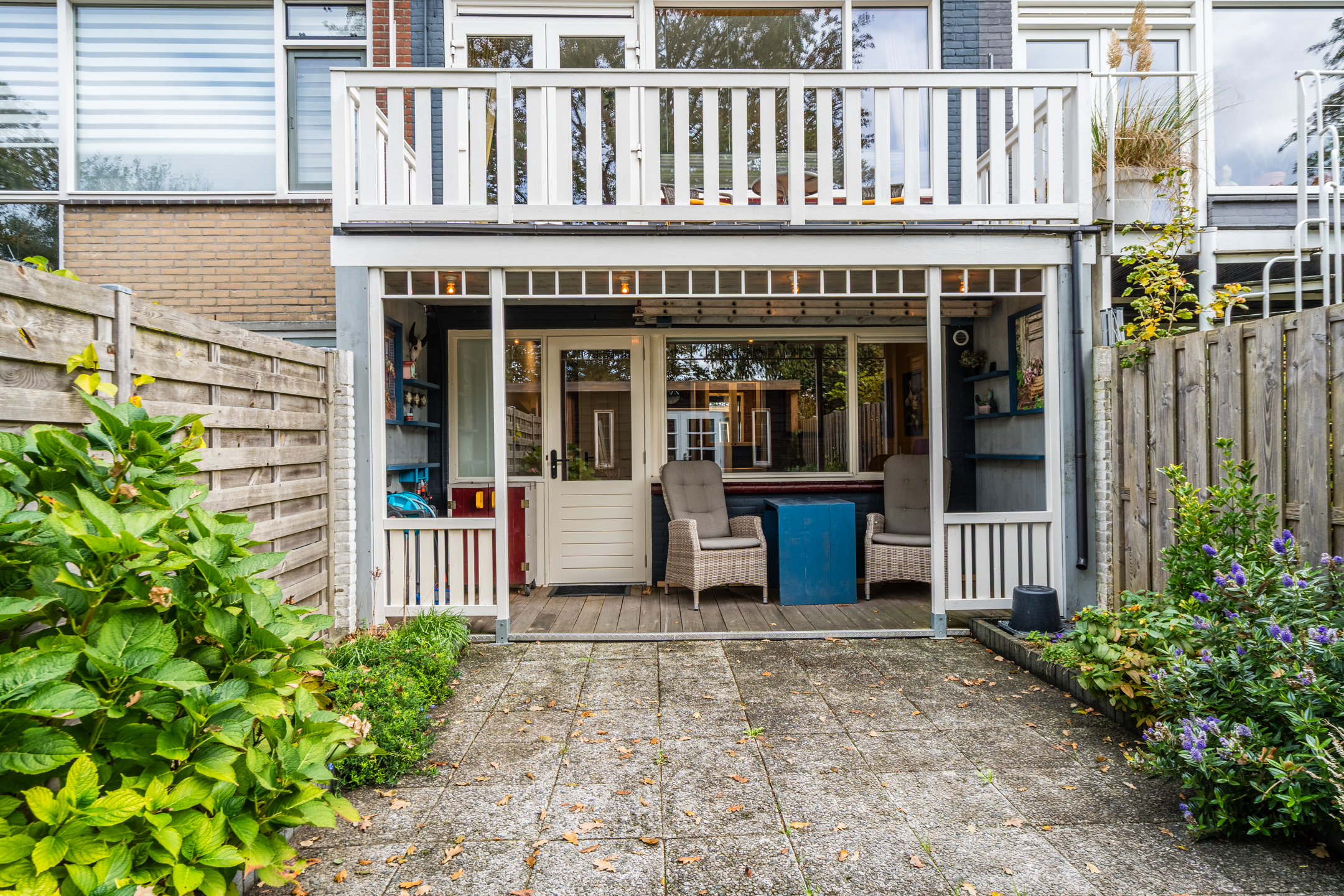 The property has a sunny, west-facing garden, beautifully landscaped with a large tiled terrace framed by green borders. Directly behind the house is a cosy veranda terrace under the balcony above, and at the back of the garden stands a handy wooden shed which is equipped with electricity. Because the garden borders on a green strip and there are no neighbours at the back, you can enjoy optimal privacy in the garden!
