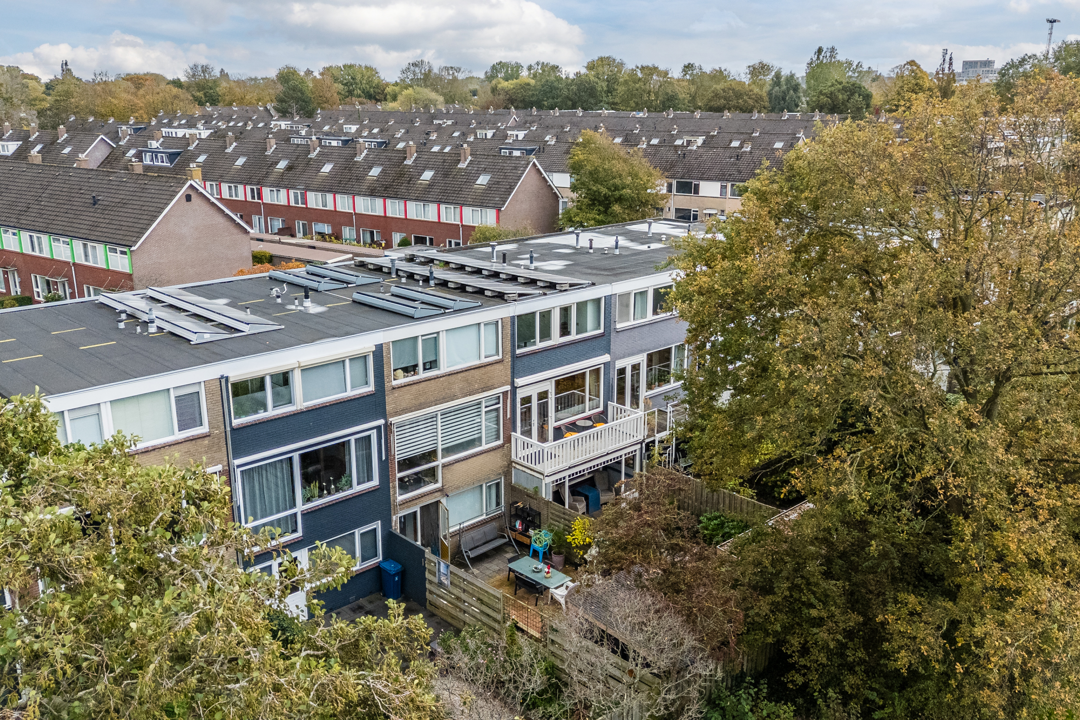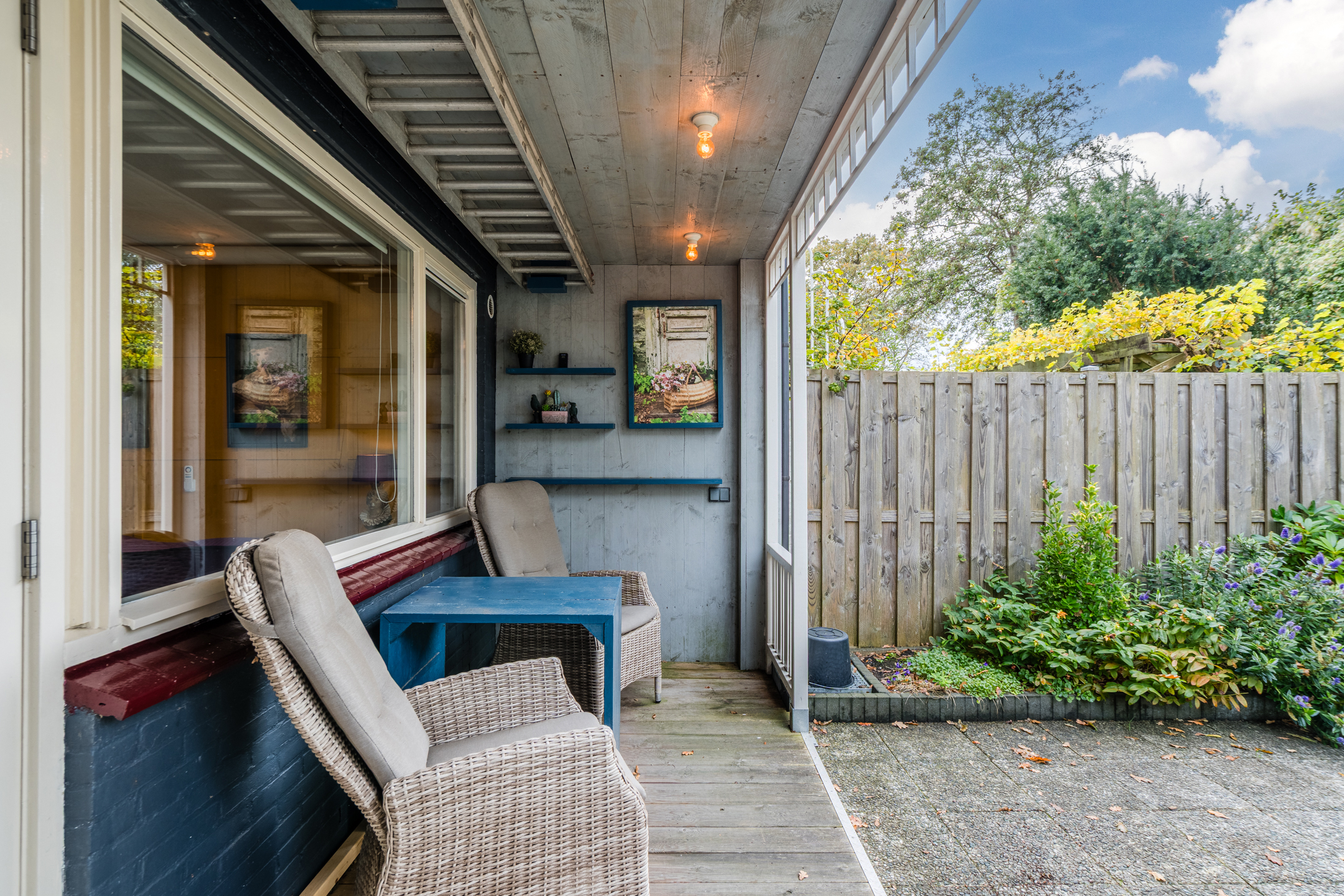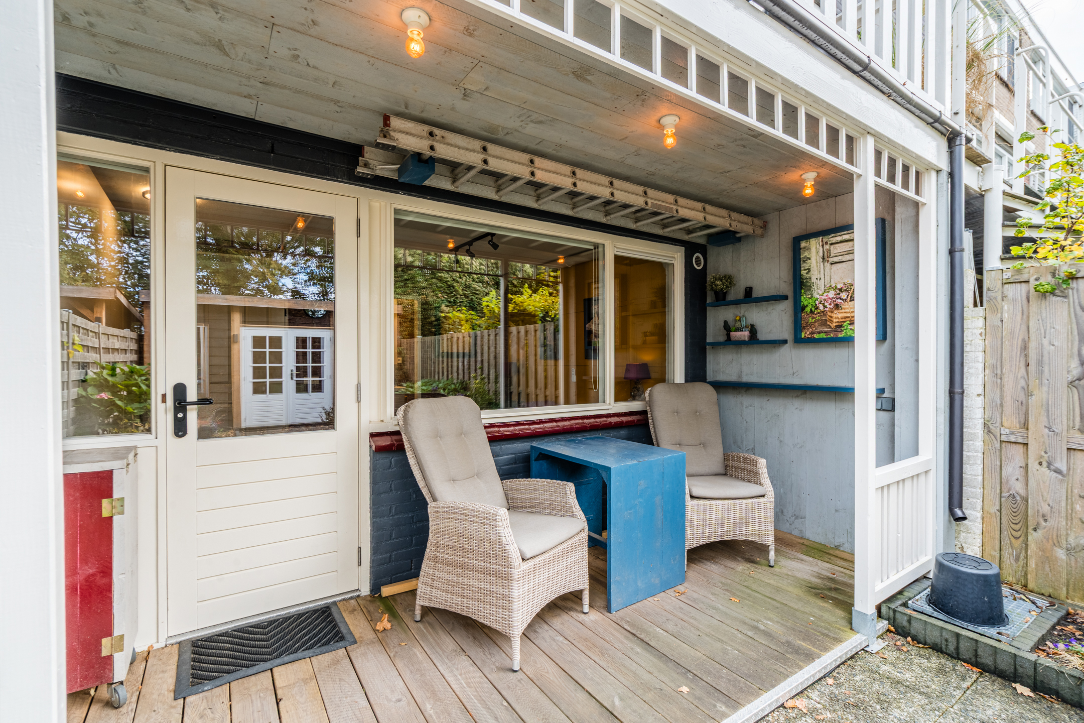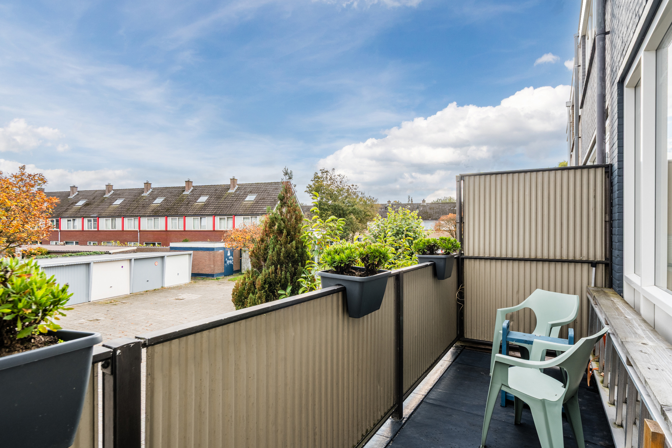 The property has a sunny, west-facing garden, beautifully landscaped with a large tiled terrace framed by green borders. Directly behind the house is a cosy veranda terrace under the balcony above, and at the back of the garden stands a handy wooden shed which is equipped with electricity. Because the garden borders on a green strip and there are no neighbours at the back, you can enjoy optimal privacy in the garden!