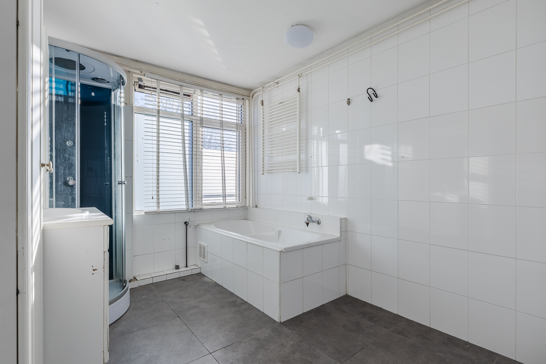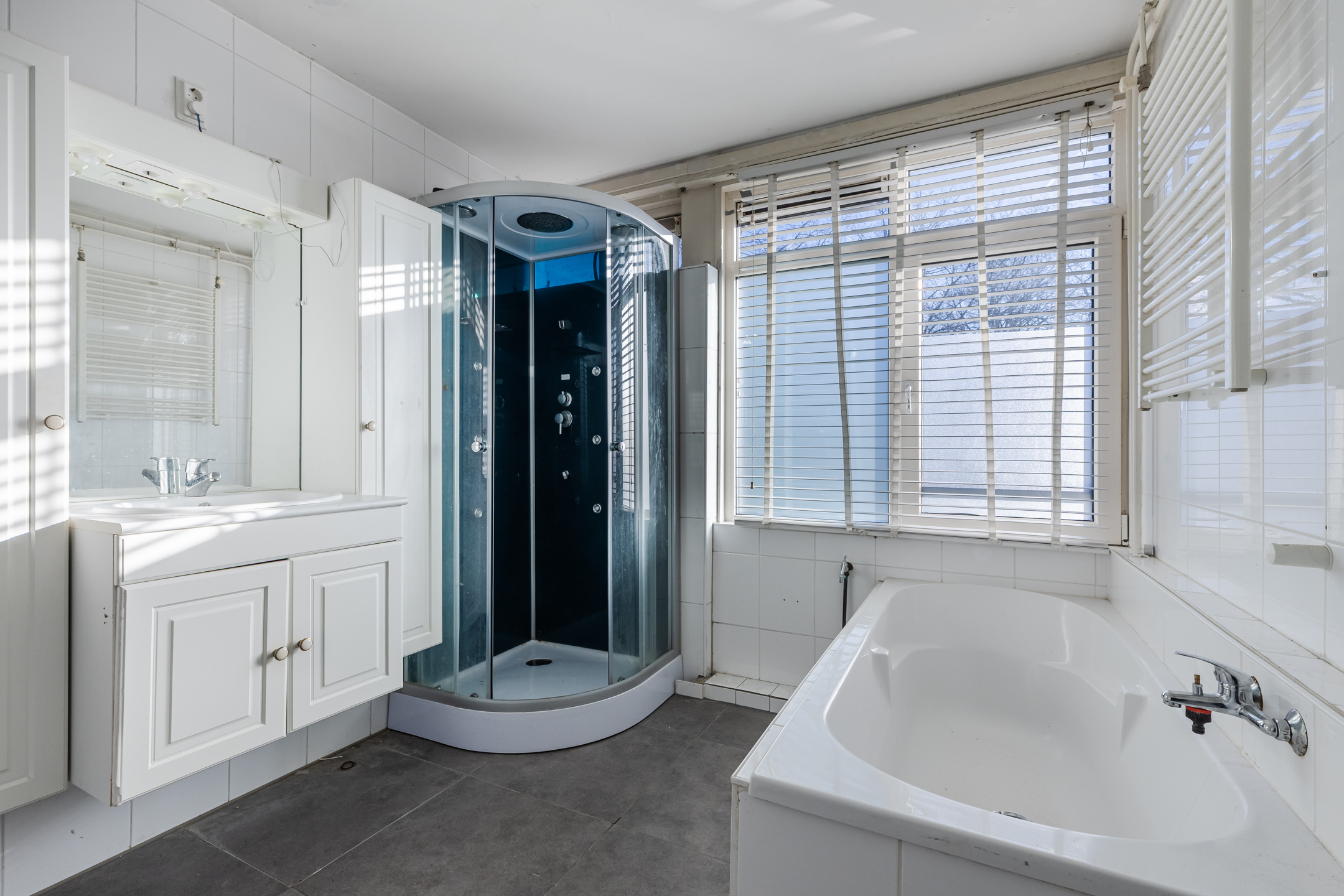 De badkamer is gedateerd maar wel ontzettend ruim en biedt zodoende meer dan genoeg plek voor zowel een groot wastafelmeubel, ligbad als een ruime douche. Tevens bevinden zich hier de aansluitingen voor de witgoedopstelling. Het toilet bevindt zich in een aparte ruimte.